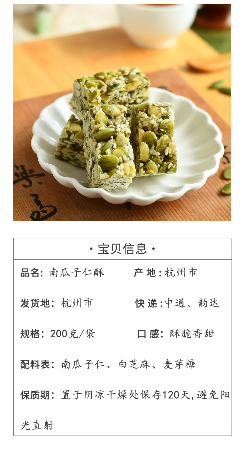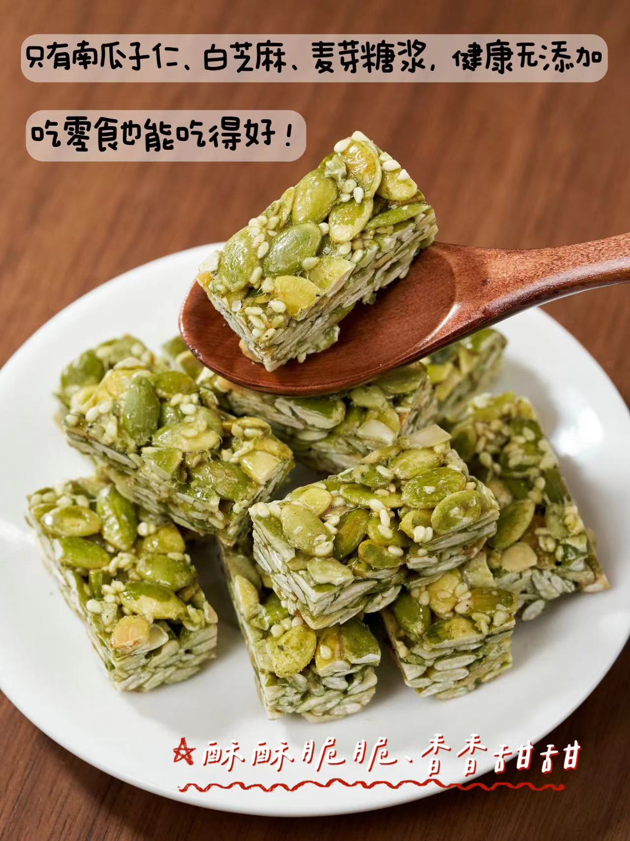 配料超干净,只有南瓜子仁、白芝麻、麦芽糖浆,健康无添加,吃零食也能吃得好!