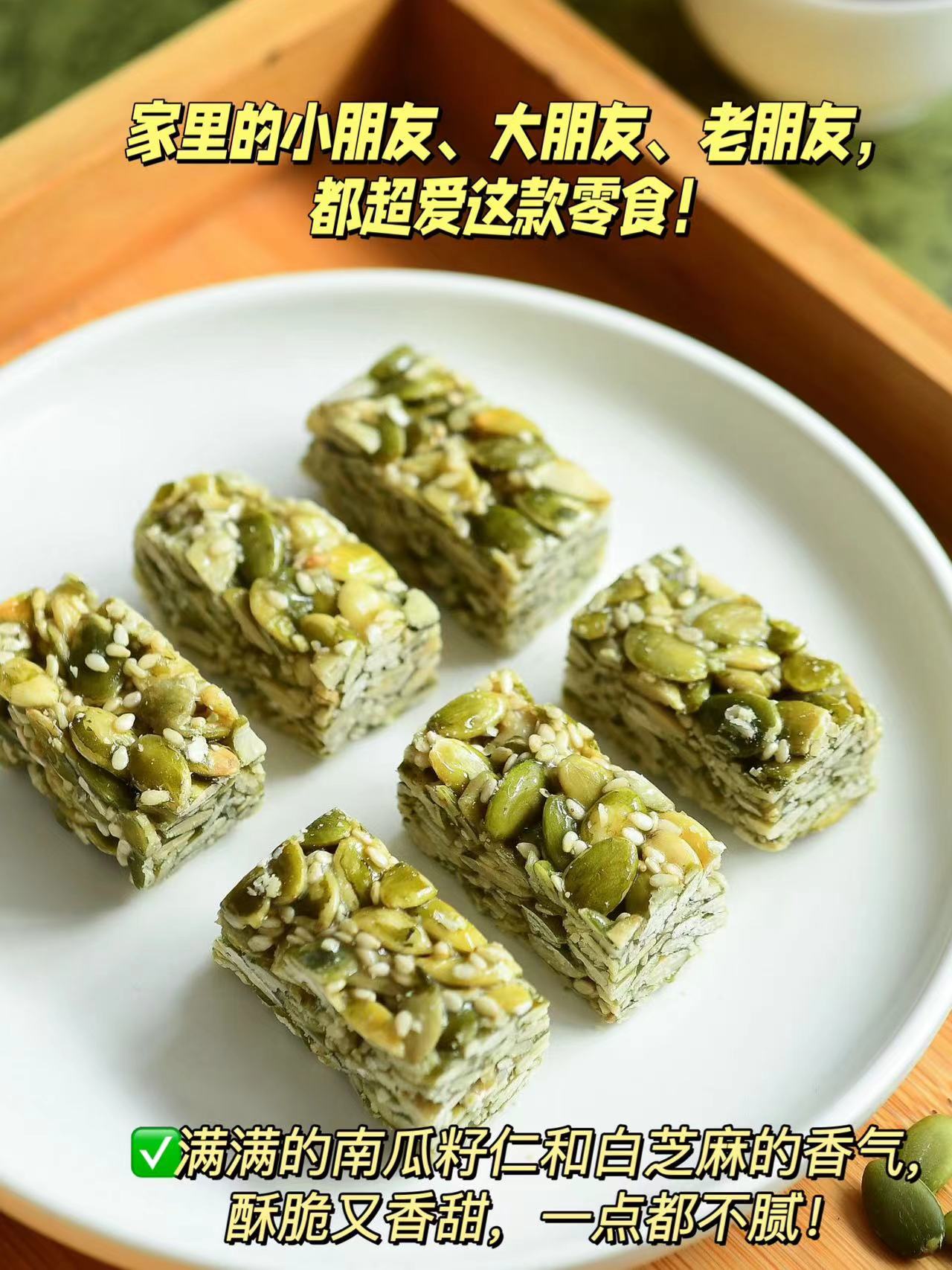 咬一口,满满的南瓜籽仁和白芝麻的香气,酥脆又香甜,一点都不腻!
