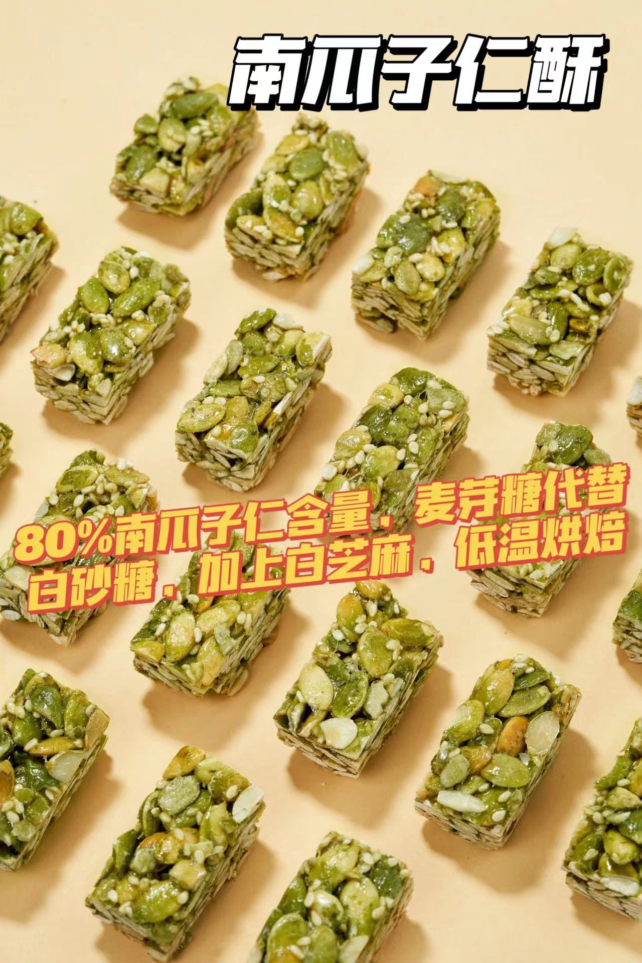 【南瓜子酥】满满的南瓜子仁,高达80%!来自内蒙古五原县的优质南瓜,颗颗饱满,粒粒硕大。低温烘焙,不上火,口感更佳!添加15%麦芽糖浆和5%白芝麻,清甜中带有芬芳,酥脆到停不下来!