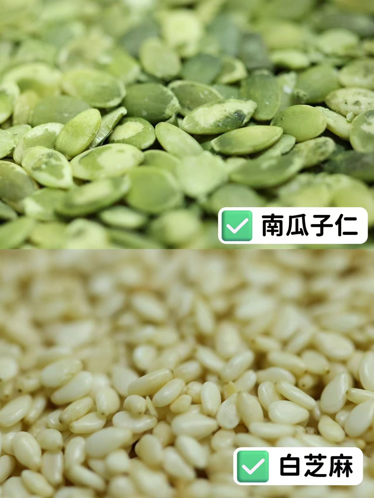 南瓜籽和白芝麻炒制后60-70度恒温烘焙,冷却去火,让你吃得安心,吃得开心
