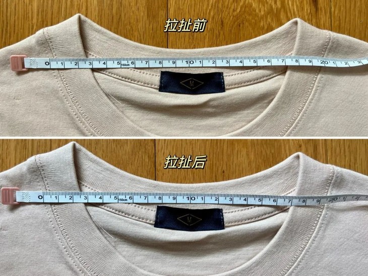 领口处采用了加固工艺。 经过我模拟正常穿衣服时的拉扯后,也不易出现变形的状况(暴力拉扯除外)。 拉扯前与拉扯后尺寸没有变化!