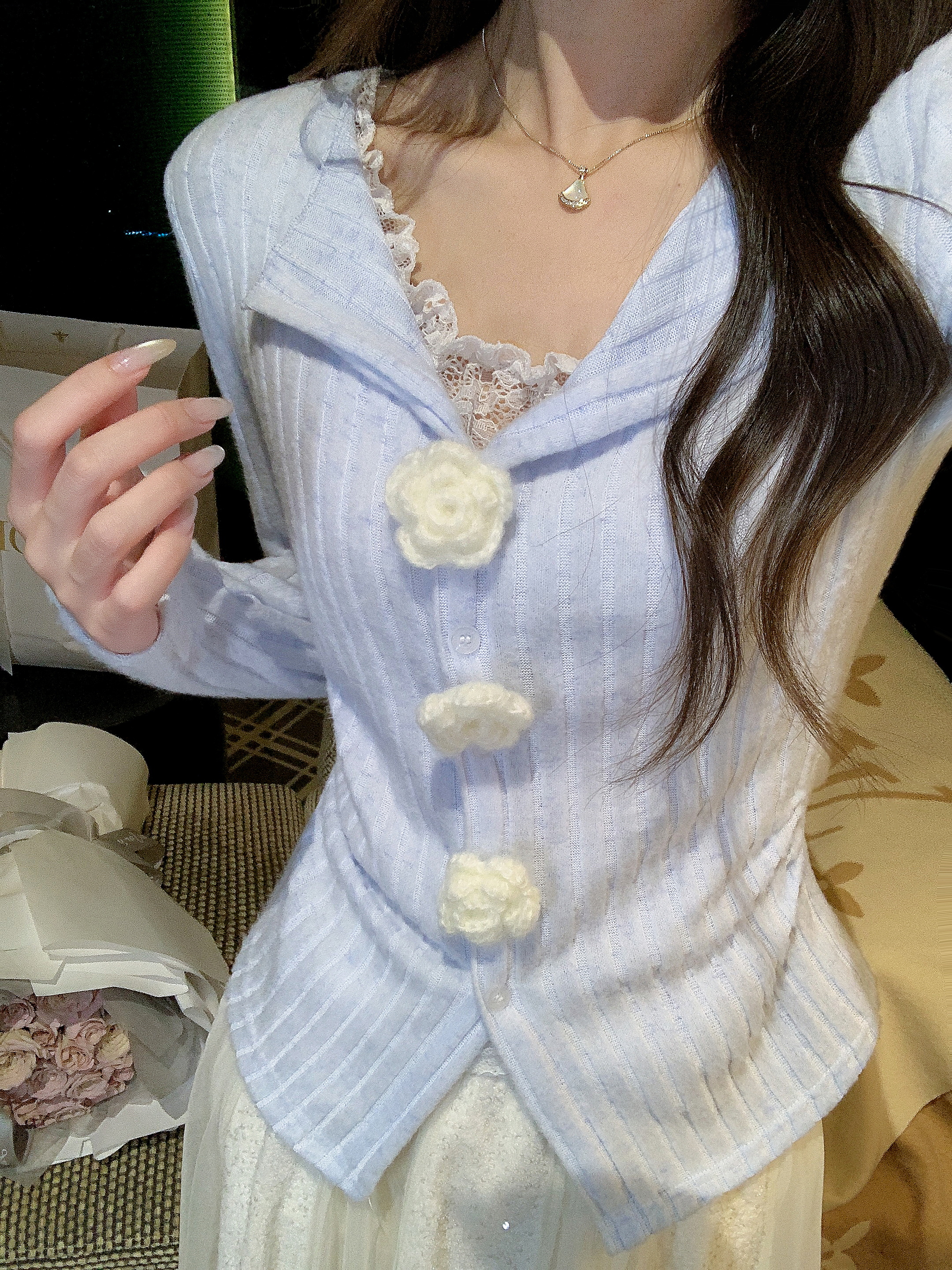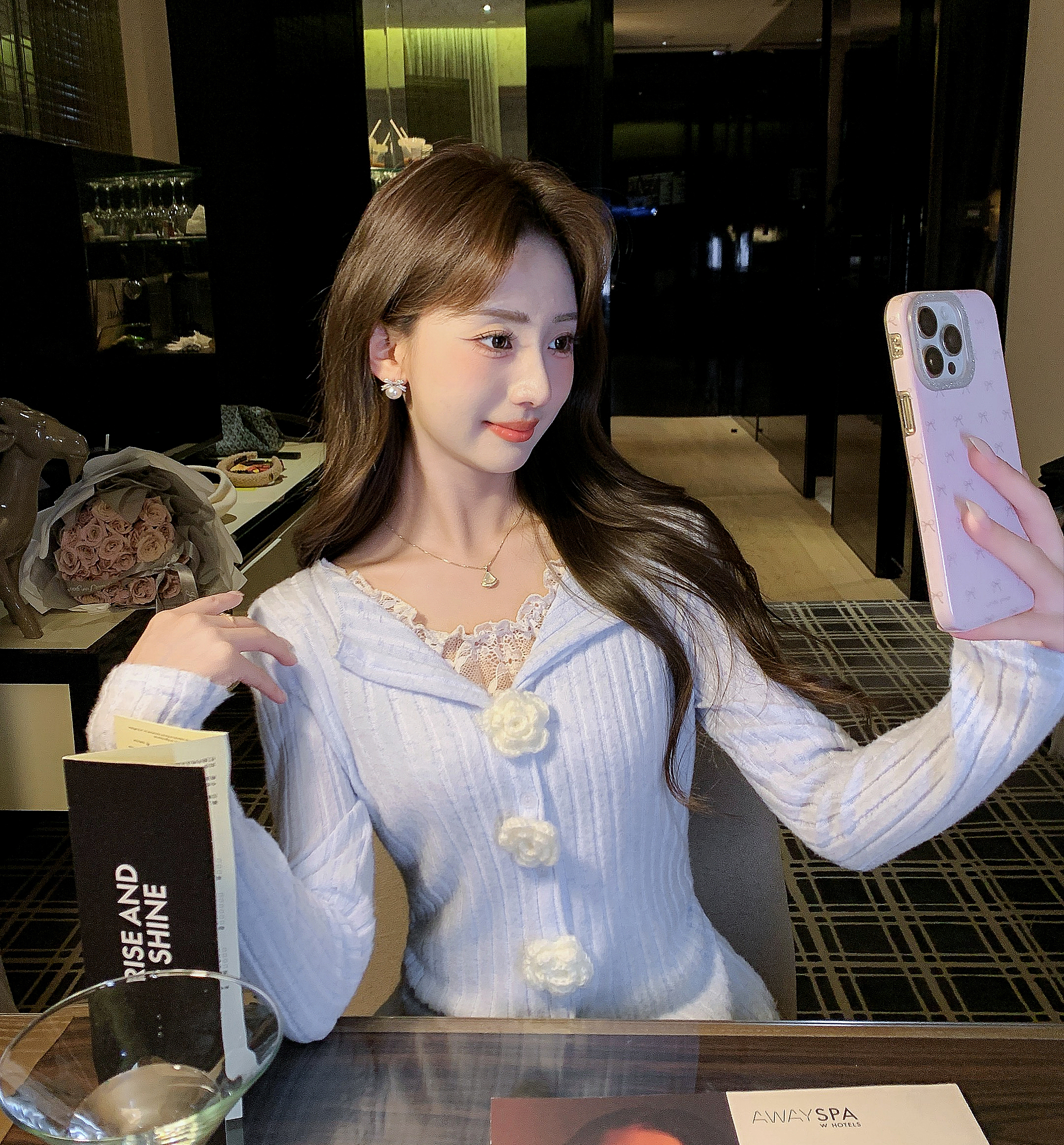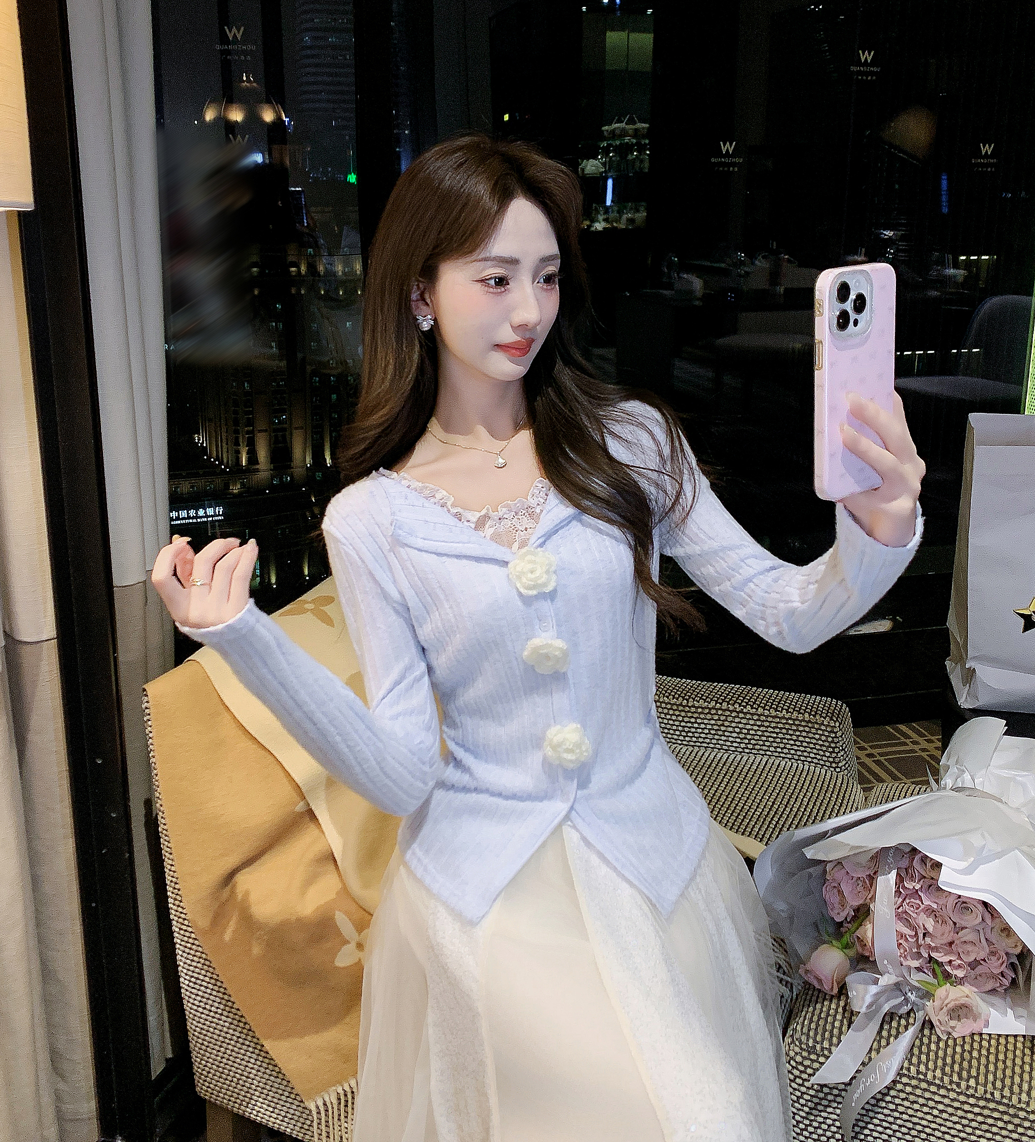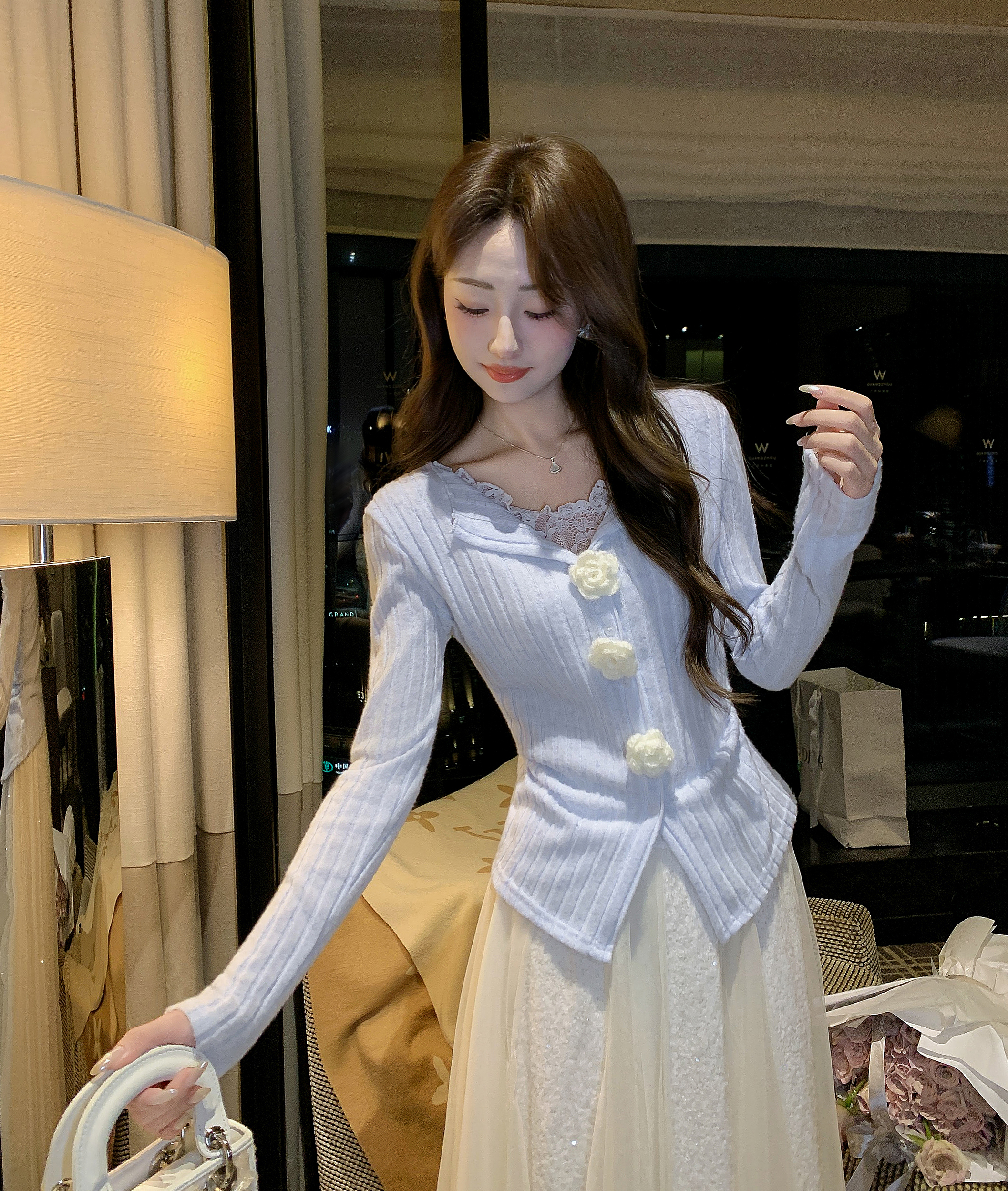 张心子【恋爱副歌】立体花蕾丝拼接温柔风针织衫上衣 U2602038