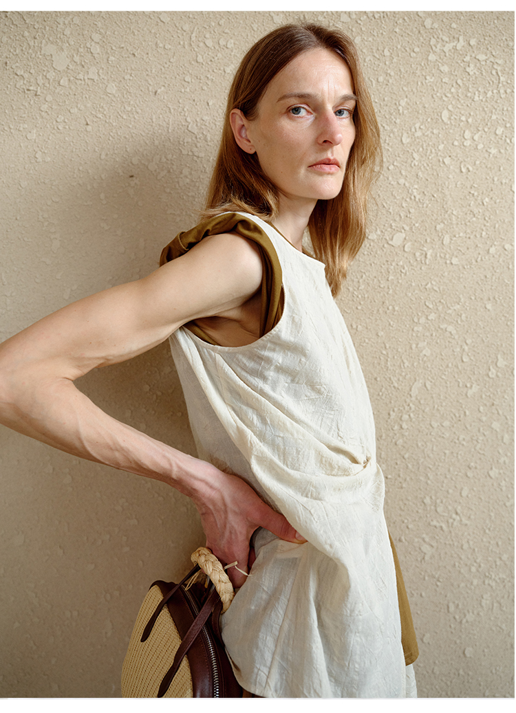 HIDEMI 度假系列浮雕格纹艺术感面料镂空开衩褶皱前后两穿背心套装 奶油米/灰绿色 背心/短裤