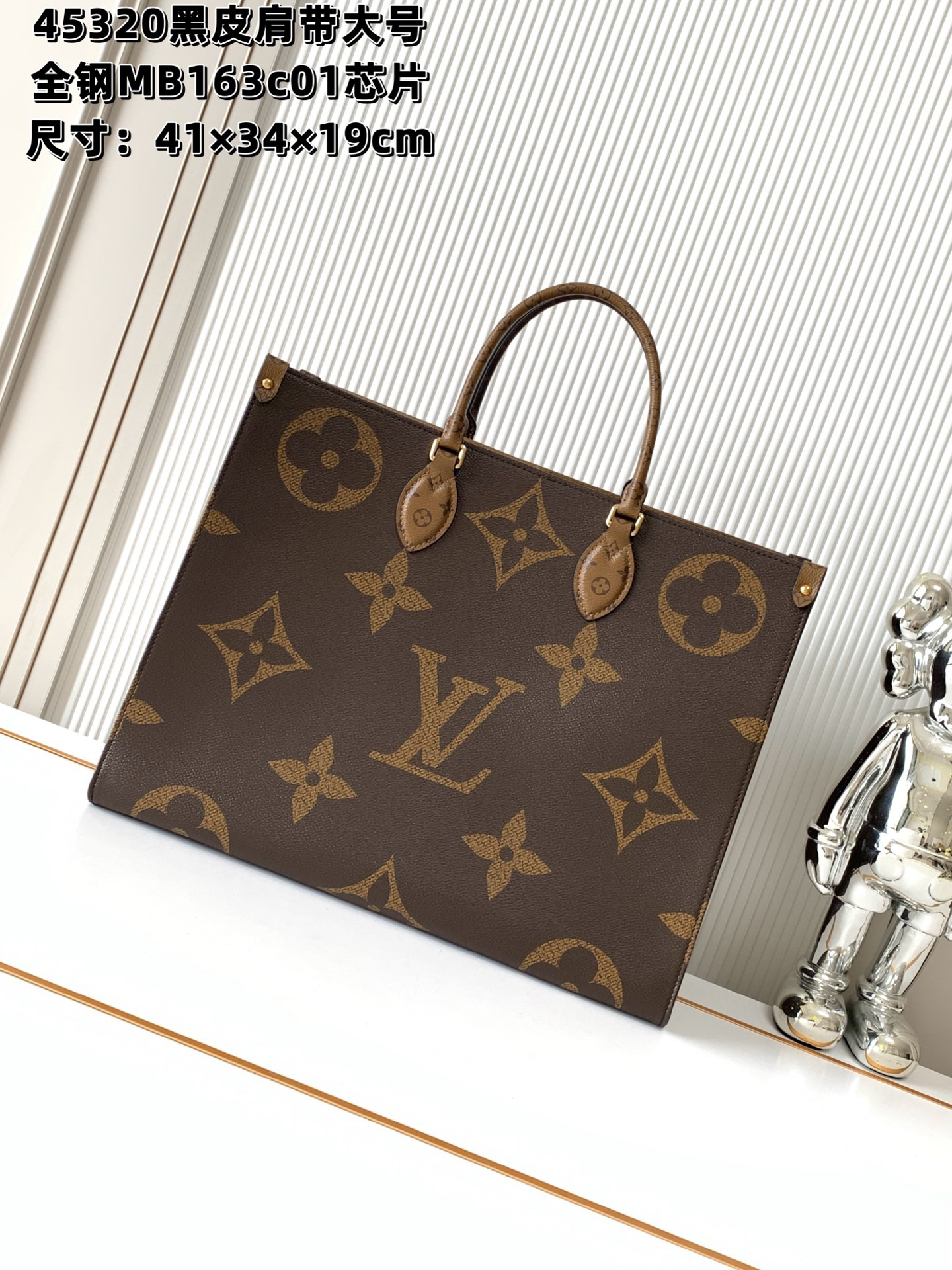 秋冬特惠💰1260 渠道级LV【全钢五金 MB163c01变码芯片】te级LV 全套包装 款号M45320黑皮肩带托特大号‼️Onthego 手袋在 Monogram Giant 帆布的衬托下醒目迷人,侧边与手柄点缀 Monogram Reverse 图案,相似风尚中窥见色彩与纹理的变化。大号构型内含充裕容量,搭配肩带与 Toron 手柄,日常生活随心出发。