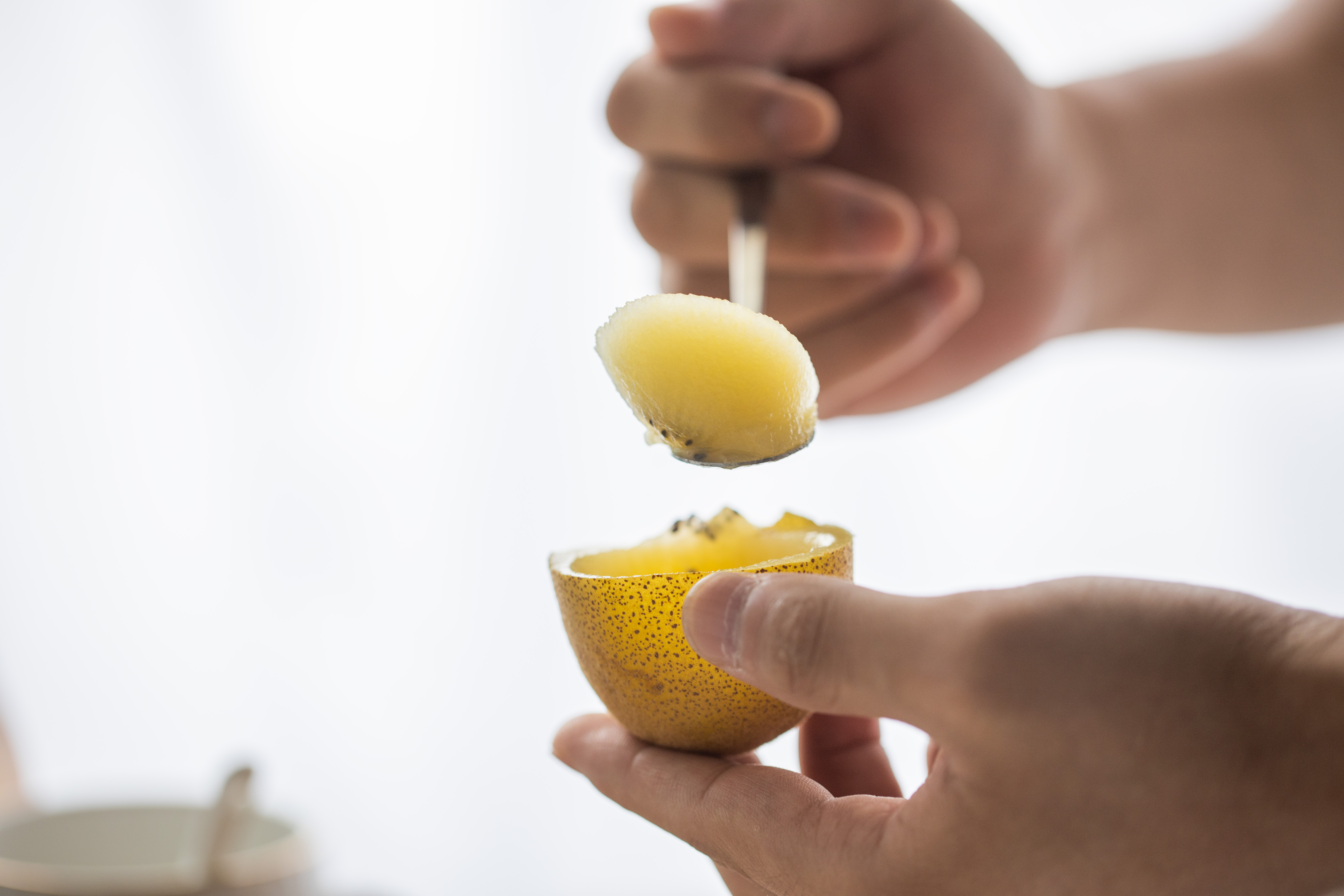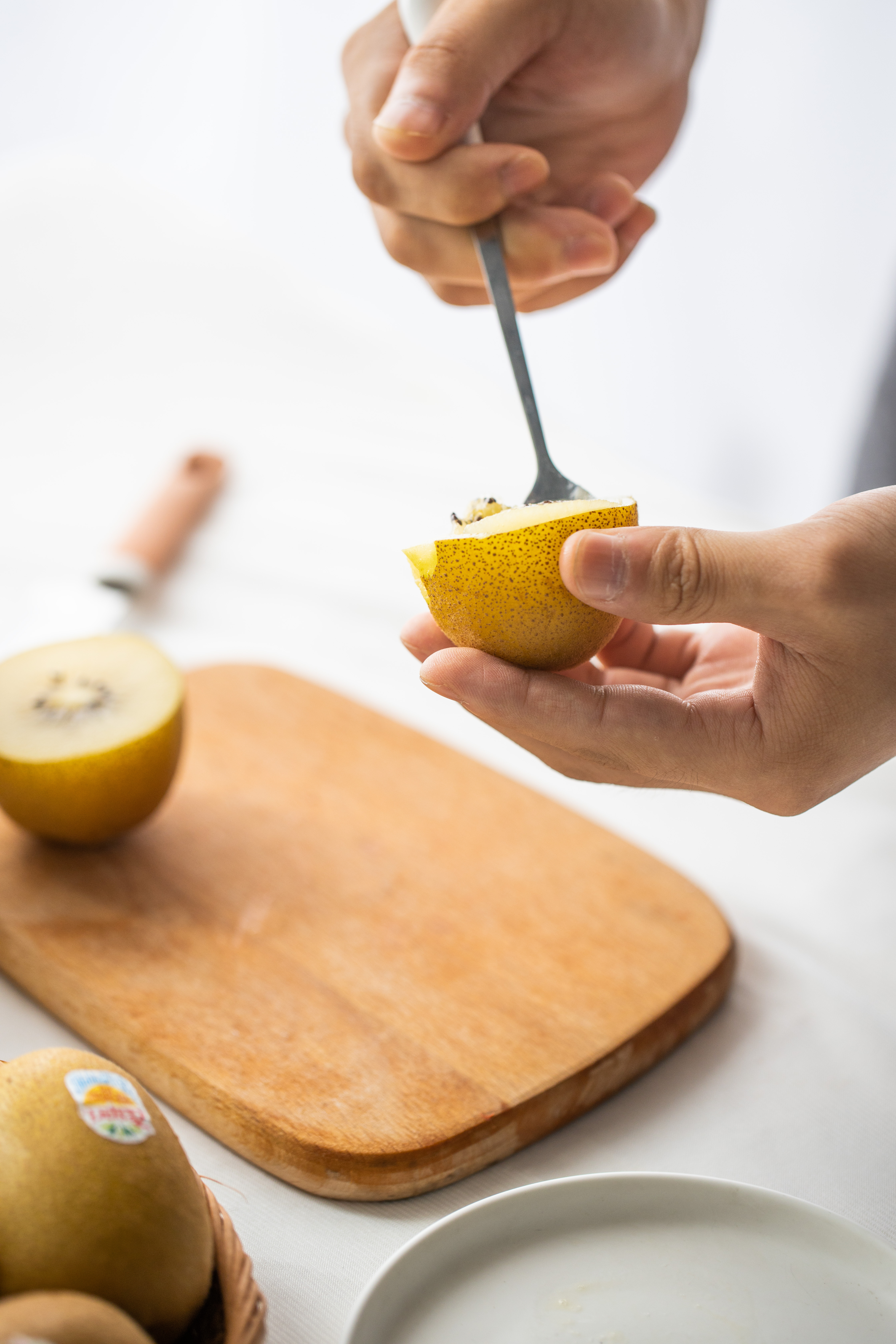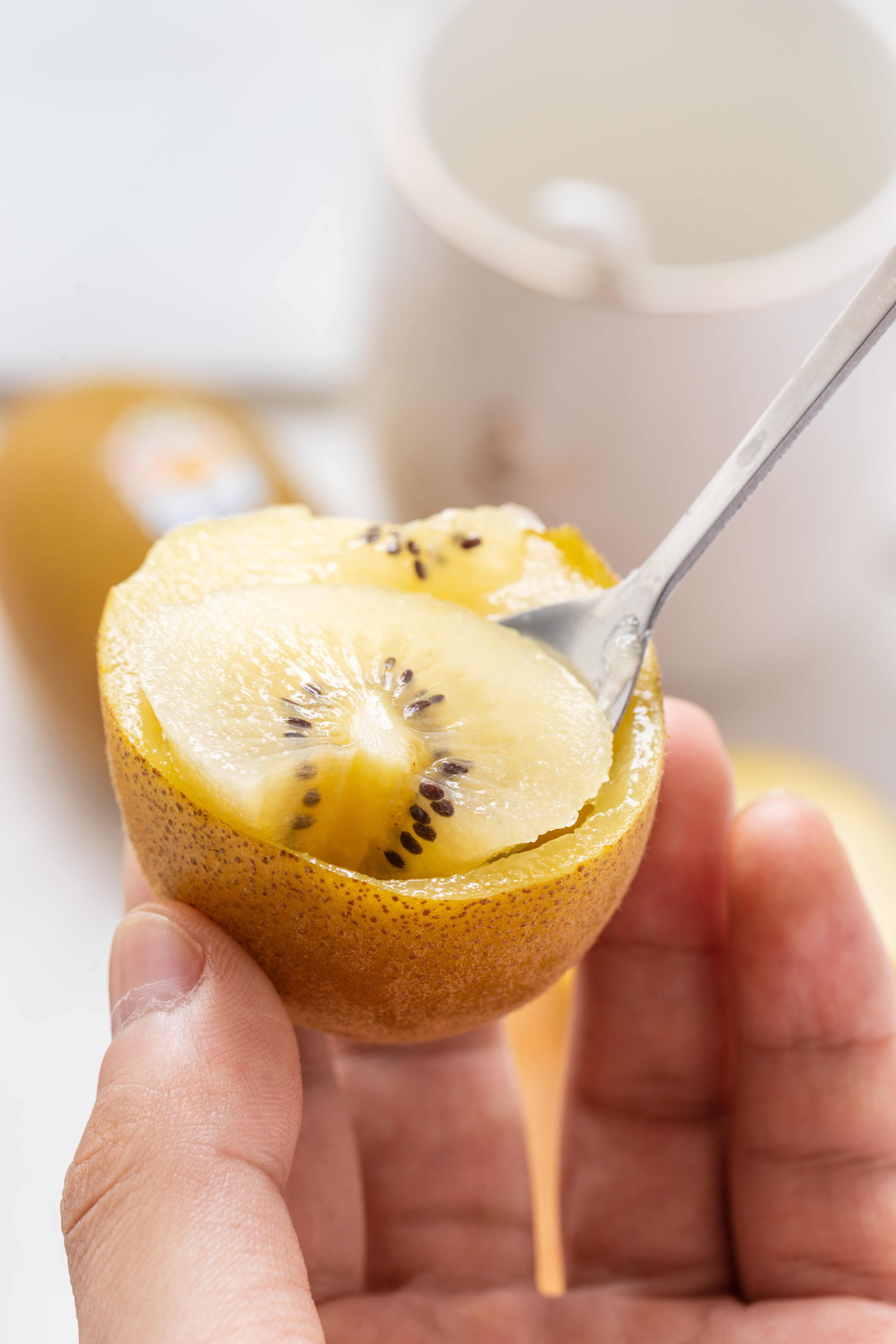 拿刀对半切开,勺子插入一挖,带着清香,汁水流淌的奇异果肉就挖出来了,一口吃下去。