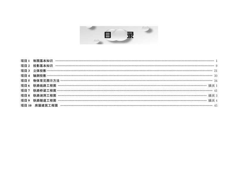 本书为中等职业教育课程改革国家规划新教材配套用书 ,可作为中等职业学校铁道工程类等专业学生的教学用书,同时也可作为职业培训教材和相关技术人员的参考用书。本书内容主要包括基础模块和铁道工程专业模块两大部分,全书共为分九章,第一章为制图基本知识;第二章为投影的基本知识;第三章为立体的投影;第四章为轴测投影;第五章为物体的常见图示方法;第六章为铁路线路工程图;第七章为铁路桥梁工程图;第八章为铁路涵洞工程图;第九章为铁路隧道工程图。第十章为建筑工程图。