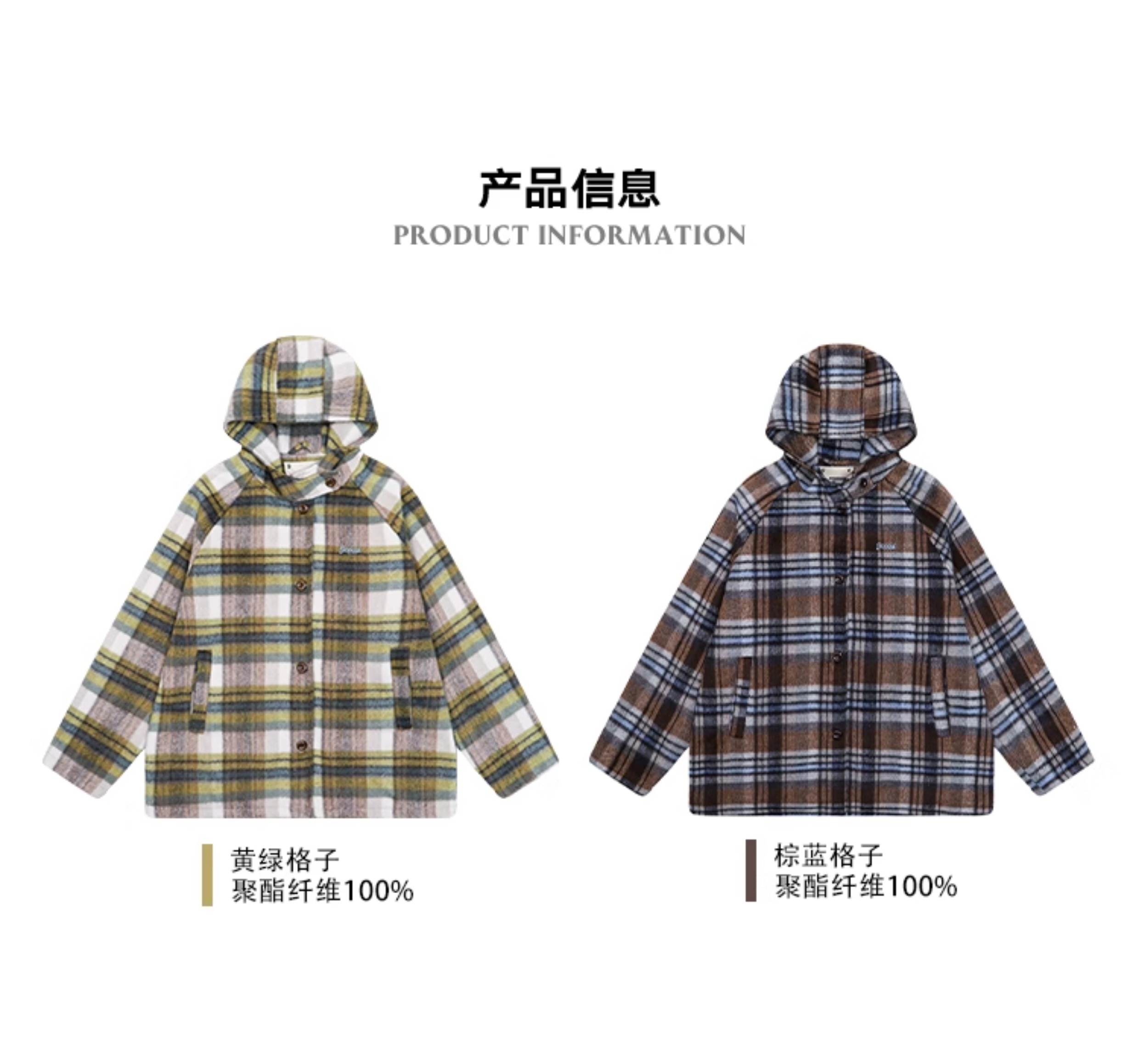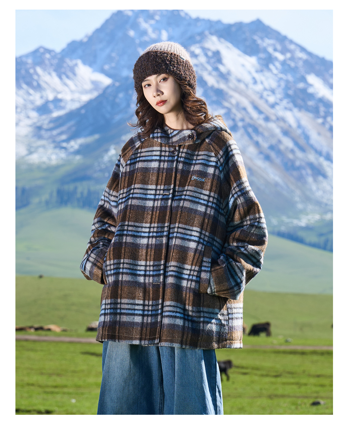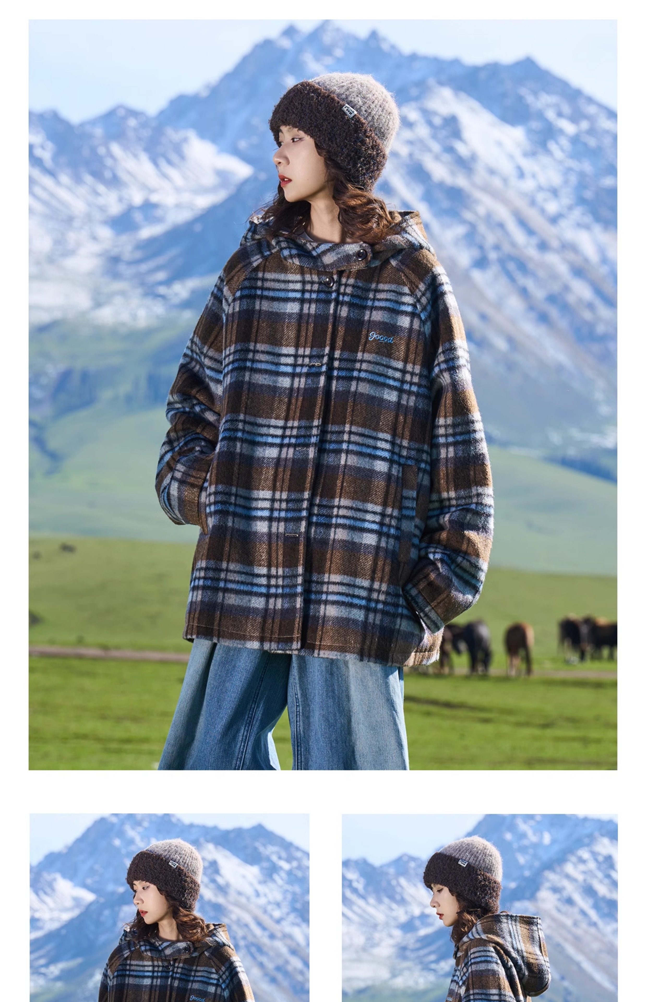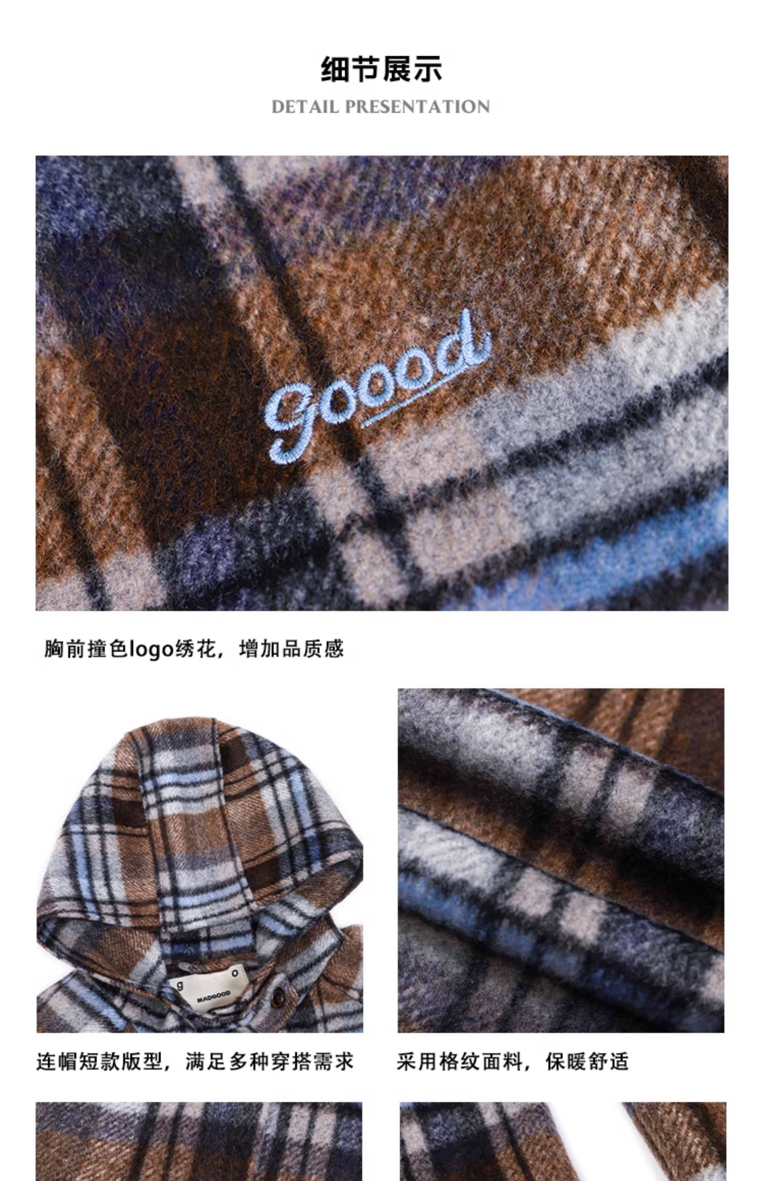 马得工地/MDGDDY244442/圣诞款格纹撞色刺绣连帽插肩袖宽松大衣