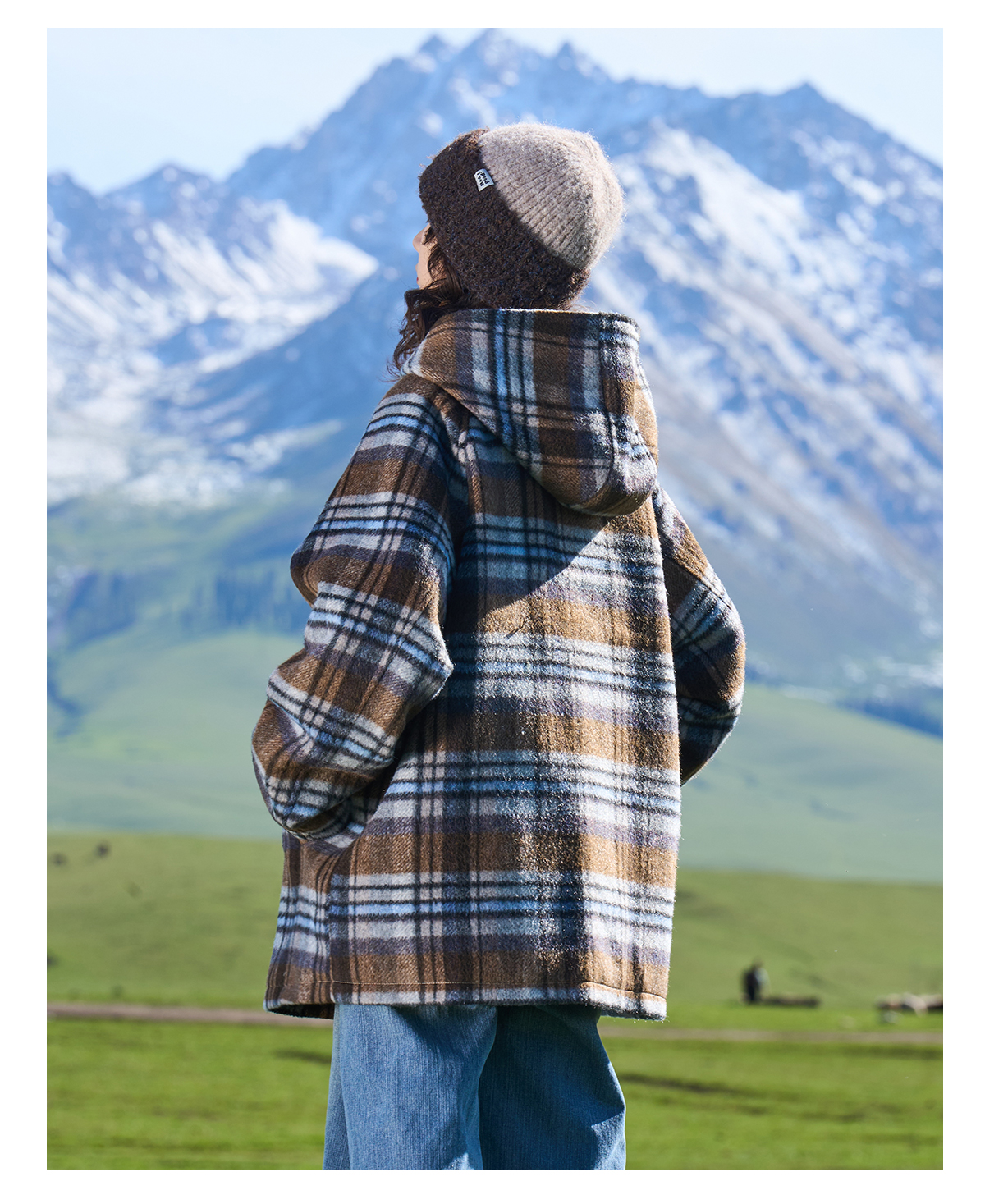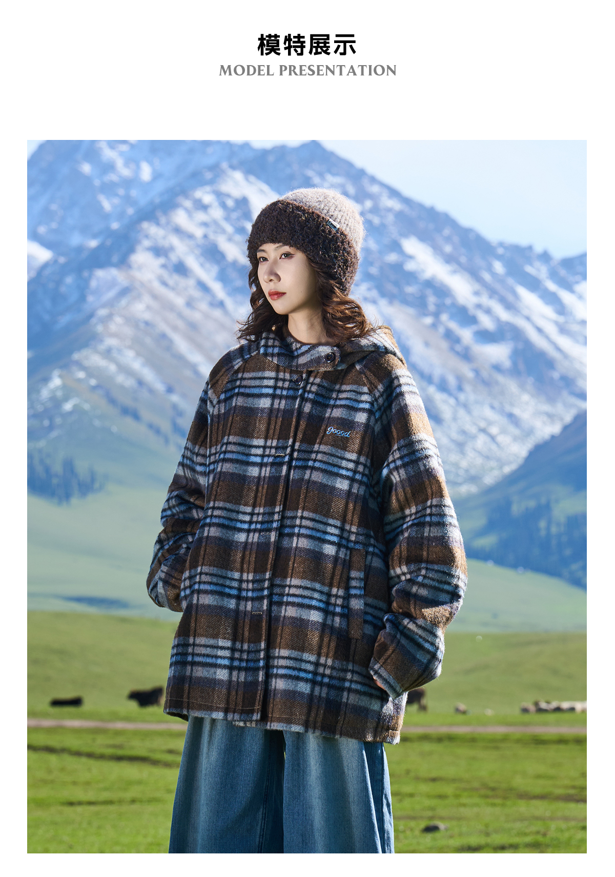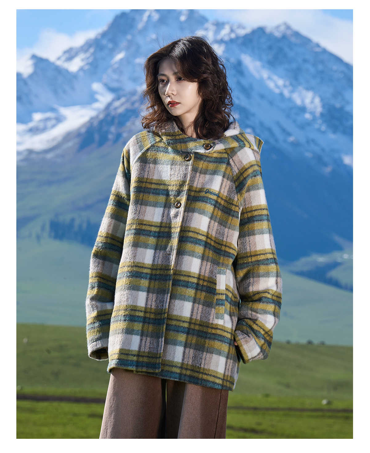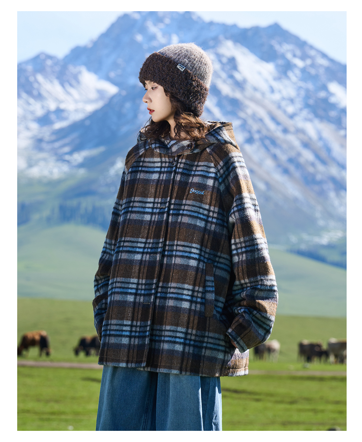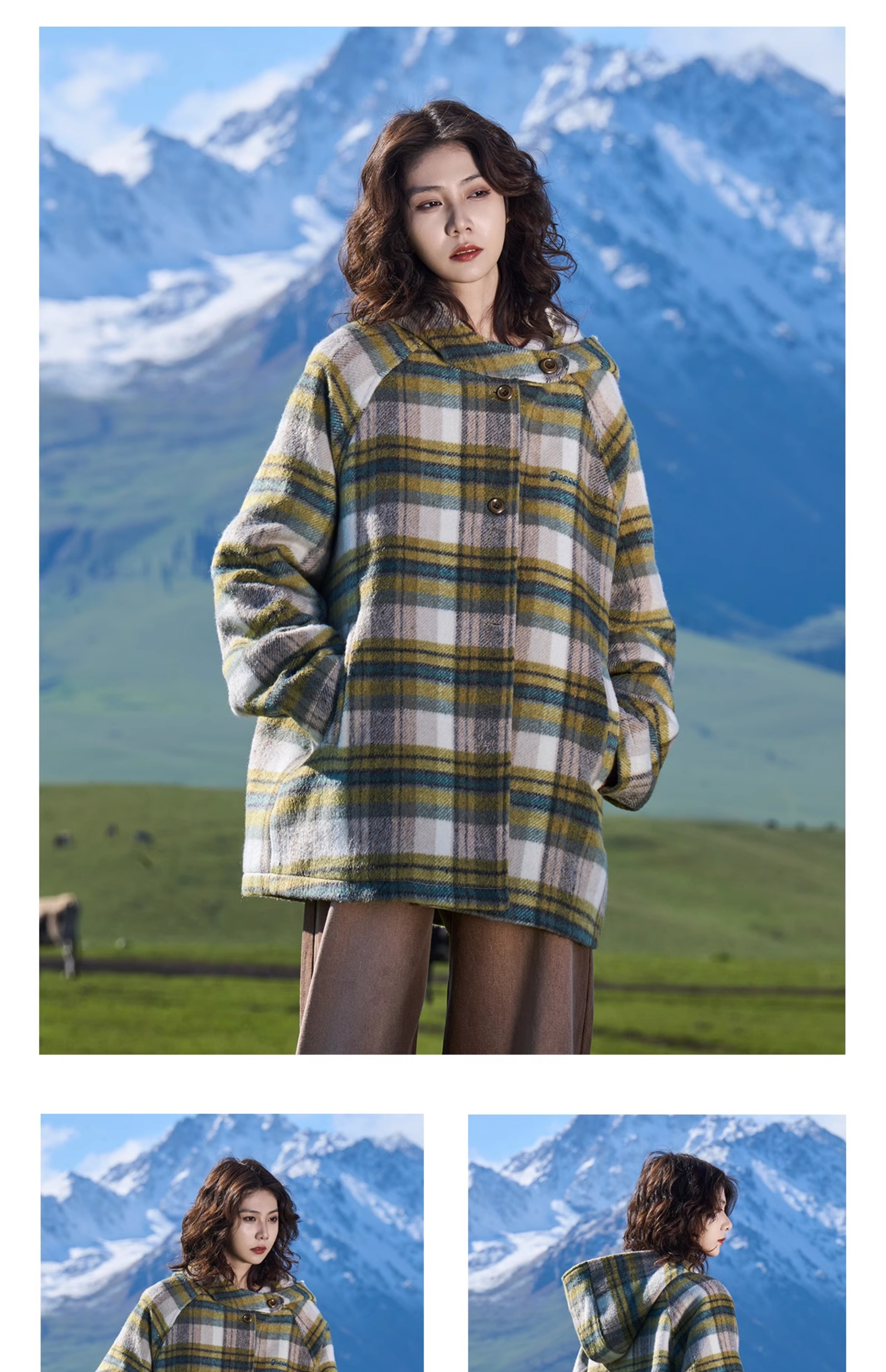 马得工地/MDGDDY244442/圣诞款格纹撞色刺绣连帽插肩袖宽松大衣