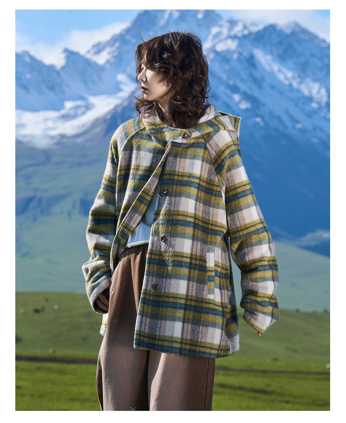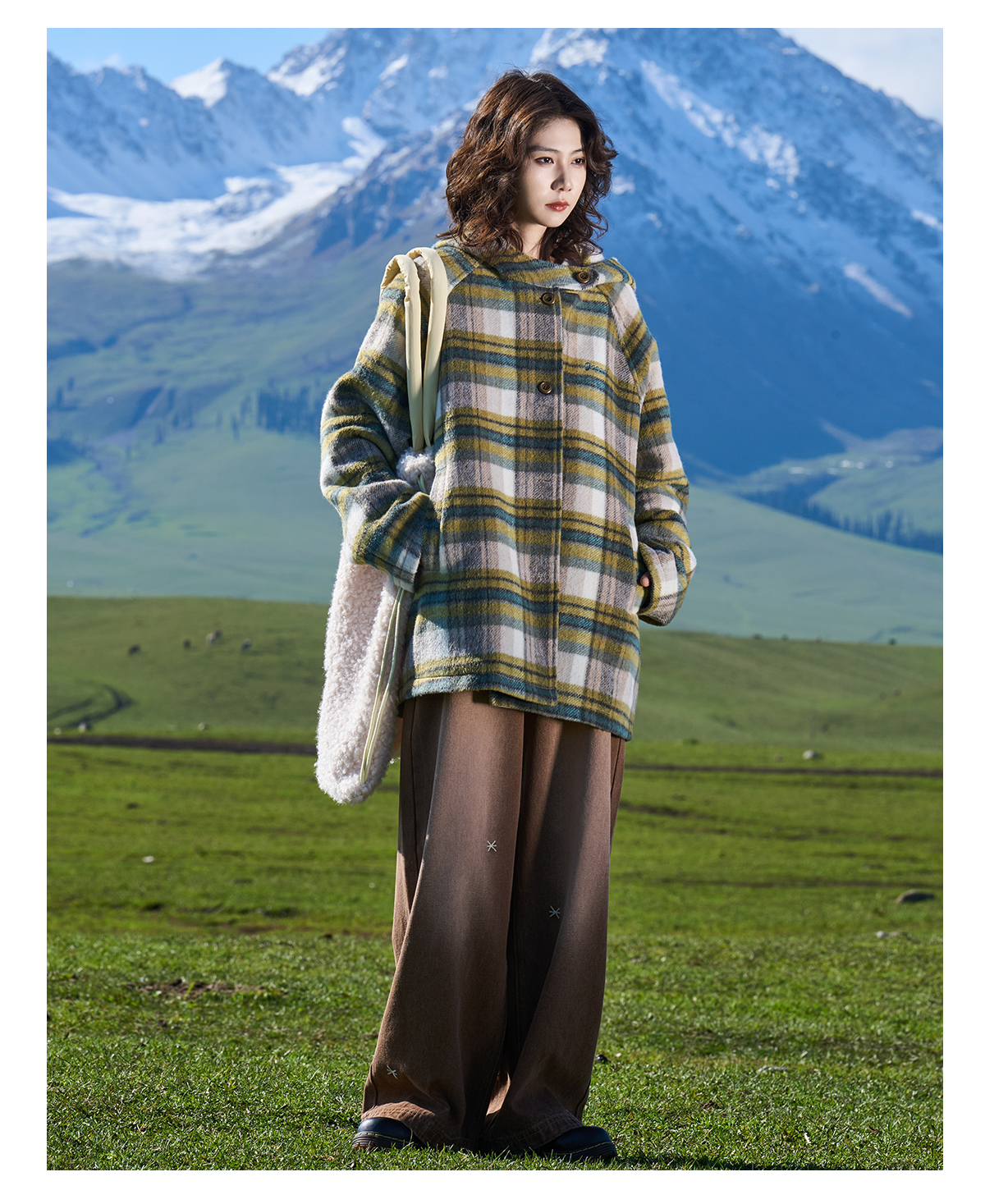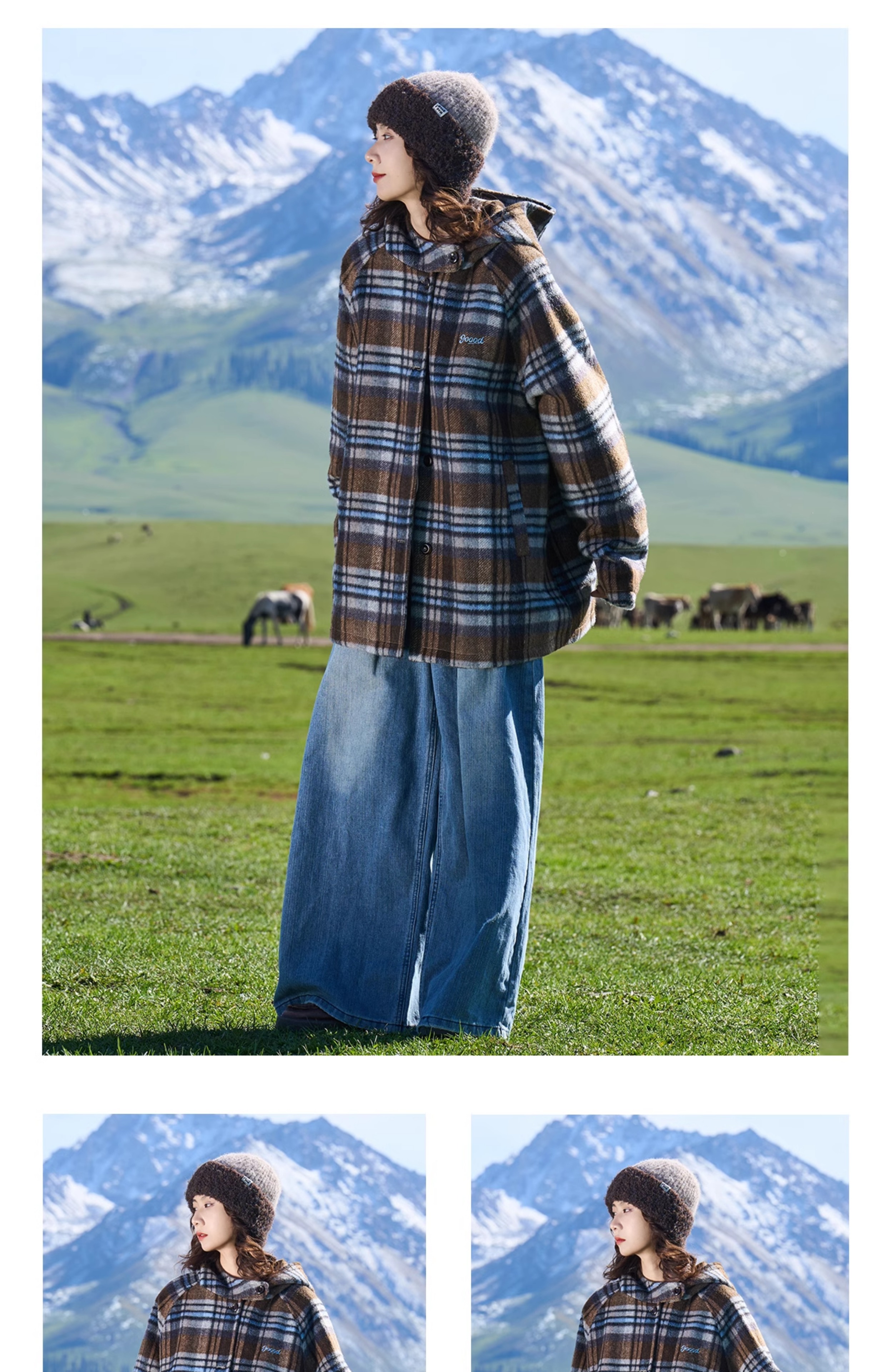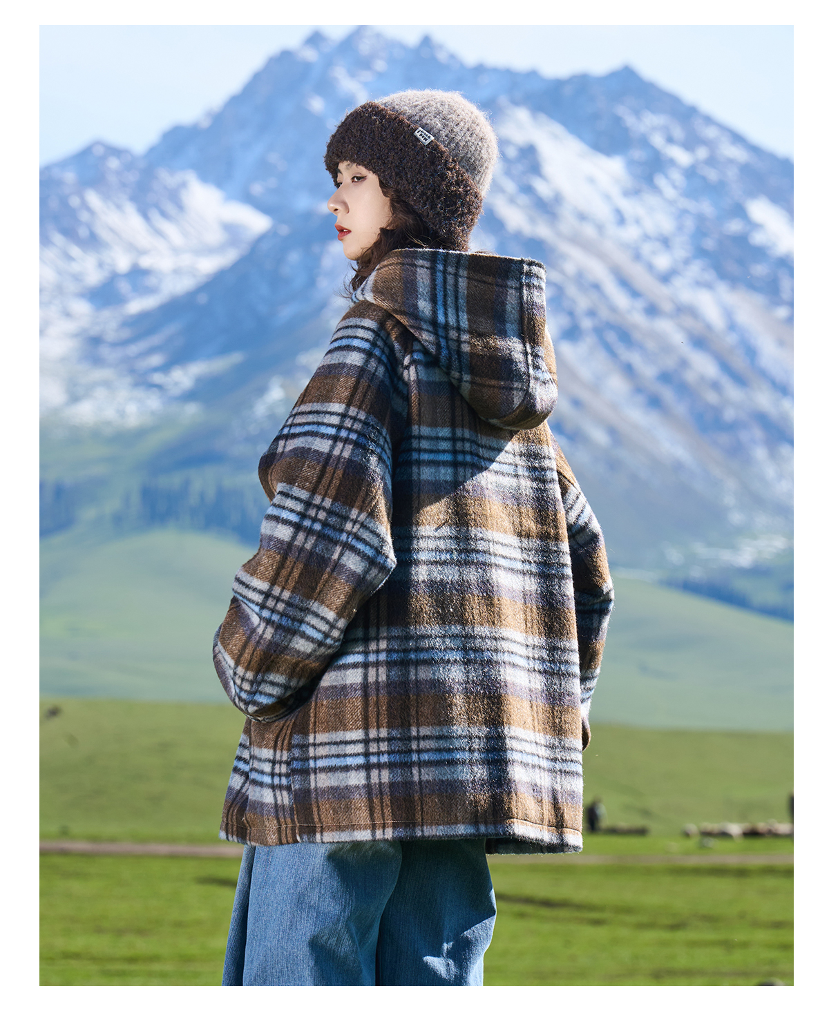 马得工地/MDGDDY244442/圣诞款格纹撞色刺绣连帽插肩袖宽松大衣