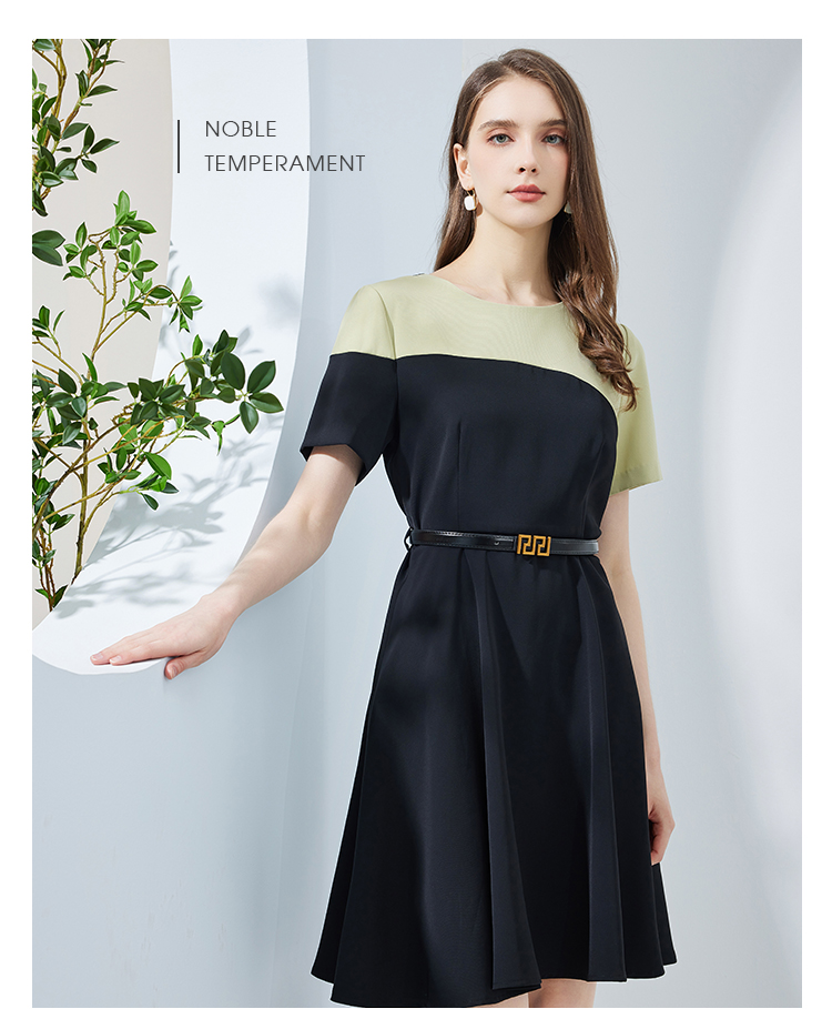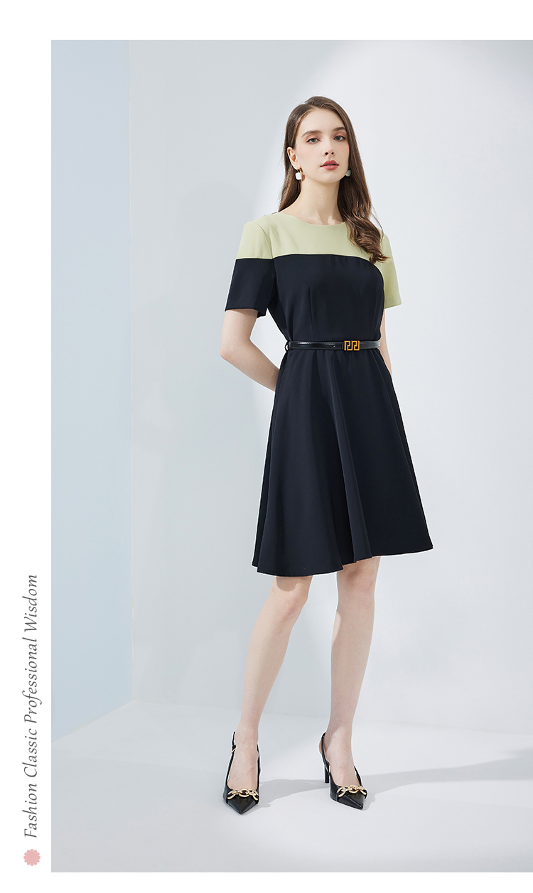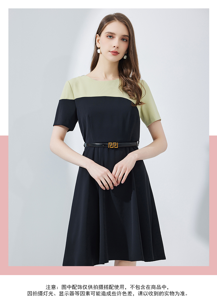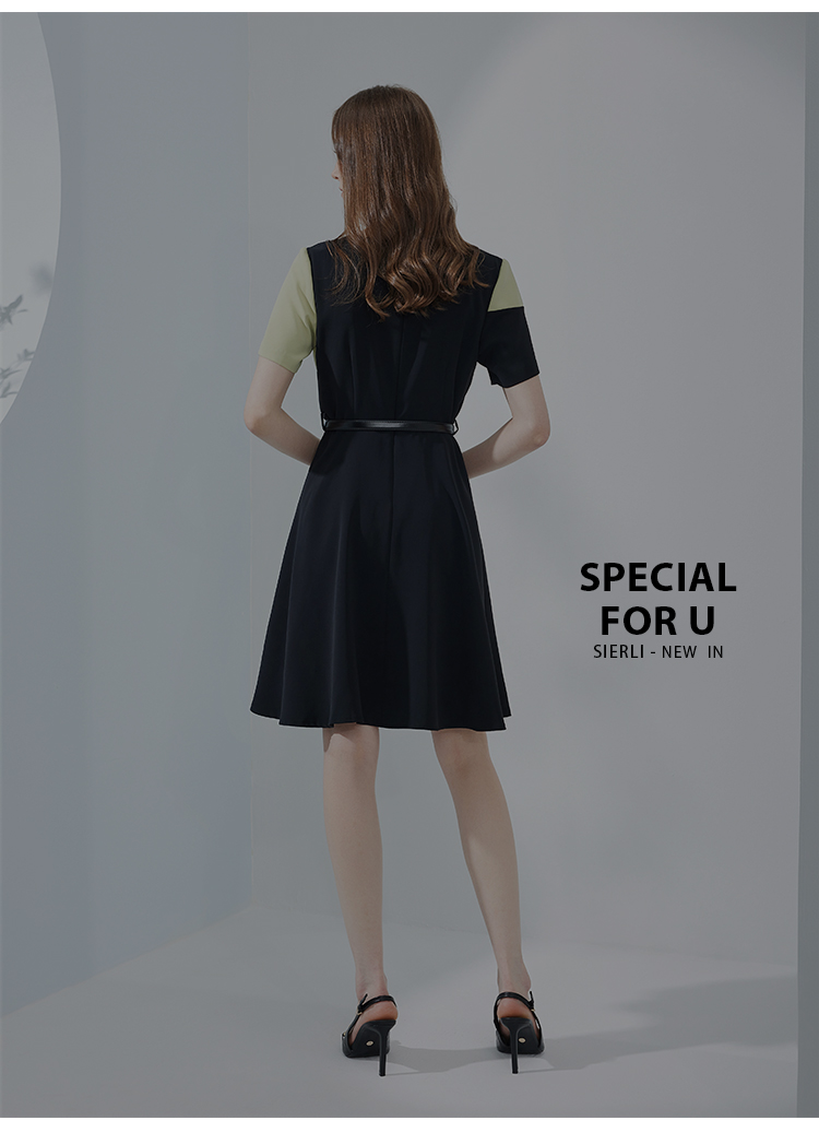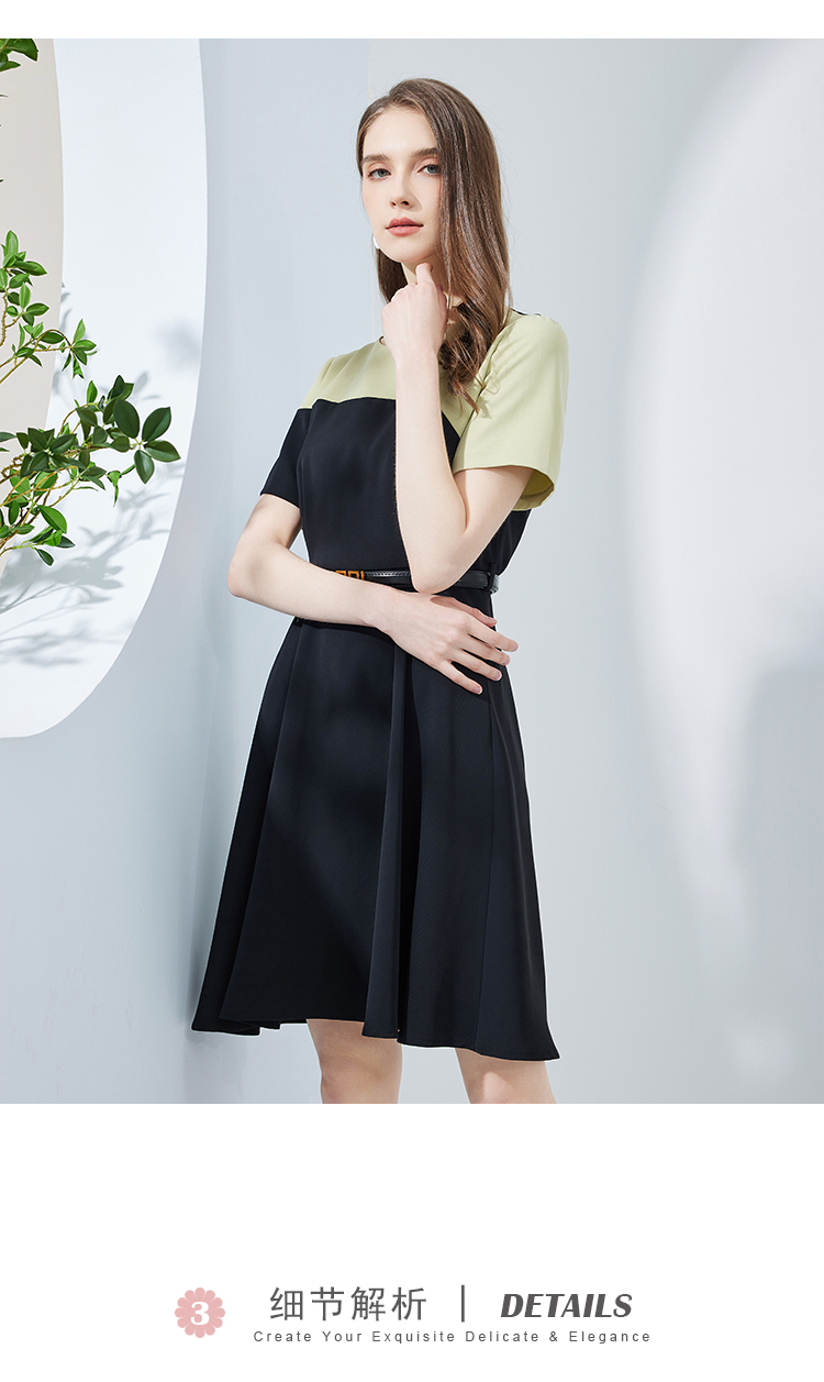 NF8G7斯尔丽瑟俪2023新款不对称线条撞色简洁时尚收腰A摆减龄连衣裙