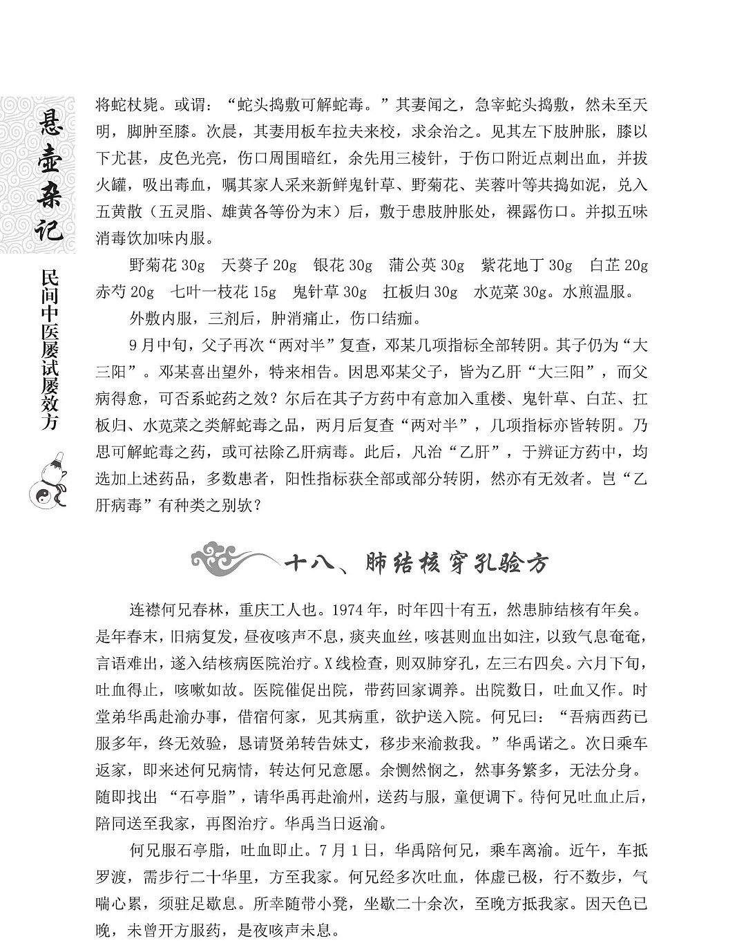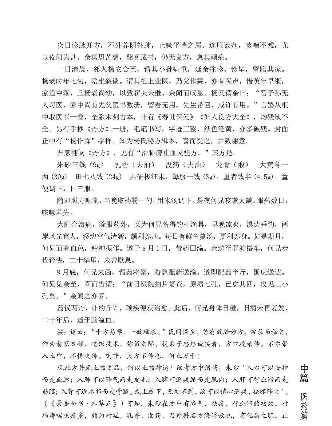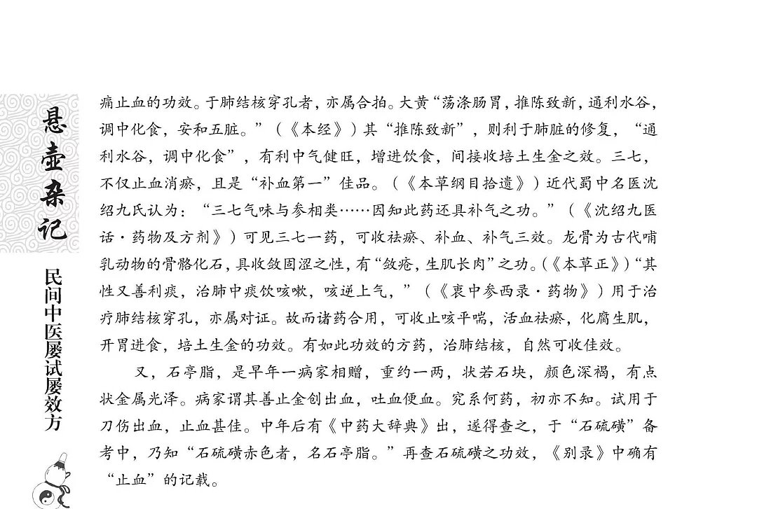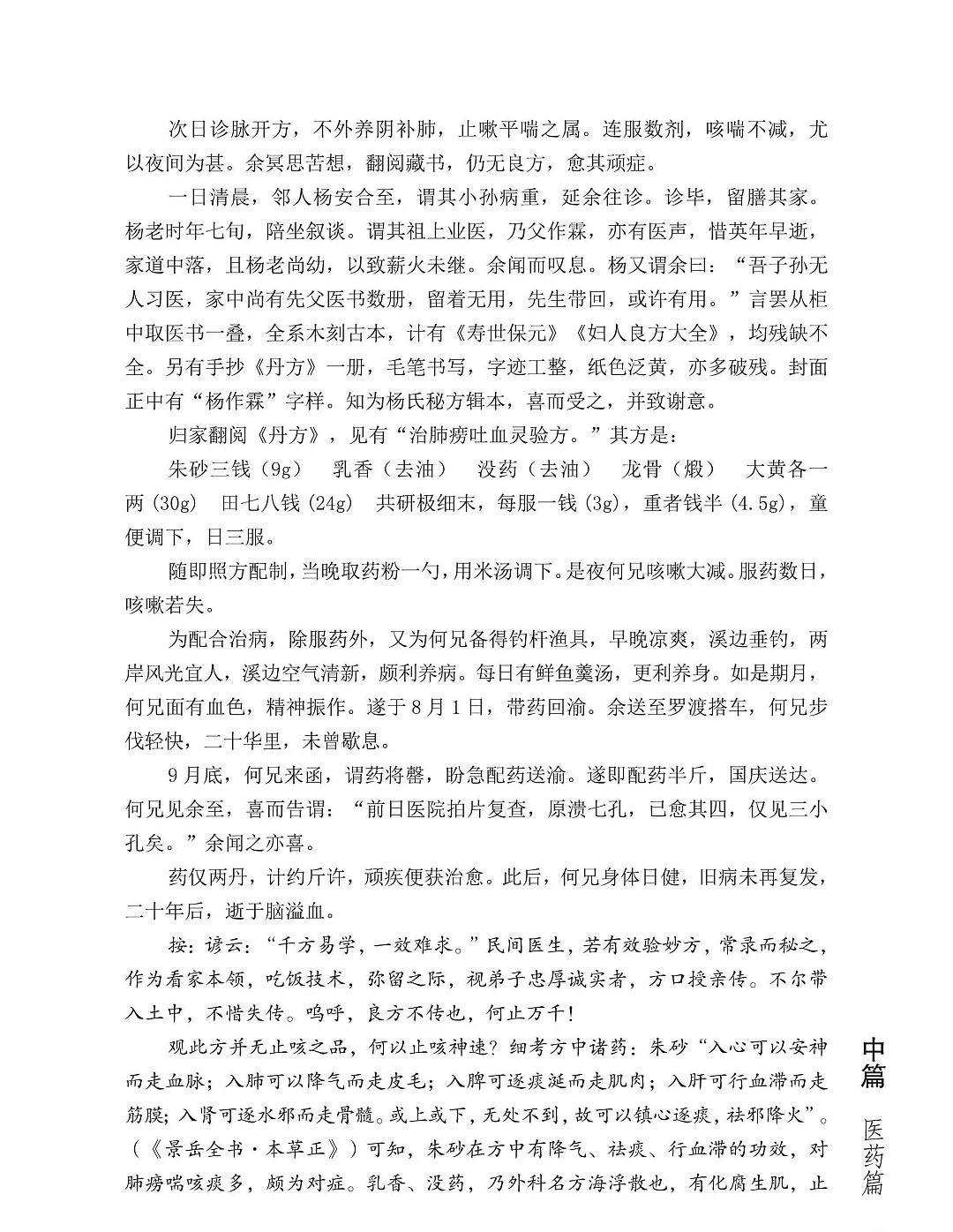 医药篇,有早年病案,有近年治验,兼收父辈经验。病涉内外诸科,治或针灸汤药。所记多为农村常病,亦录罕见病例,有复方愈大病、偏方痊危疾,有临证感悟、用药心得。还有不少疑难病证,证候错综复杂,病情千头万绪,书本难寻答案,父辈未曾传授,冥思苦想,有幸获痊愈者,亦有因识短阅微,久治不愈者。这些经验与经历,实不忍丢弃,整理出来,对后辈或许有所借鉴,有所启发。病案脉症方药,悉依原样,以求真实,毋论对错,直言实录,阅者裁之。