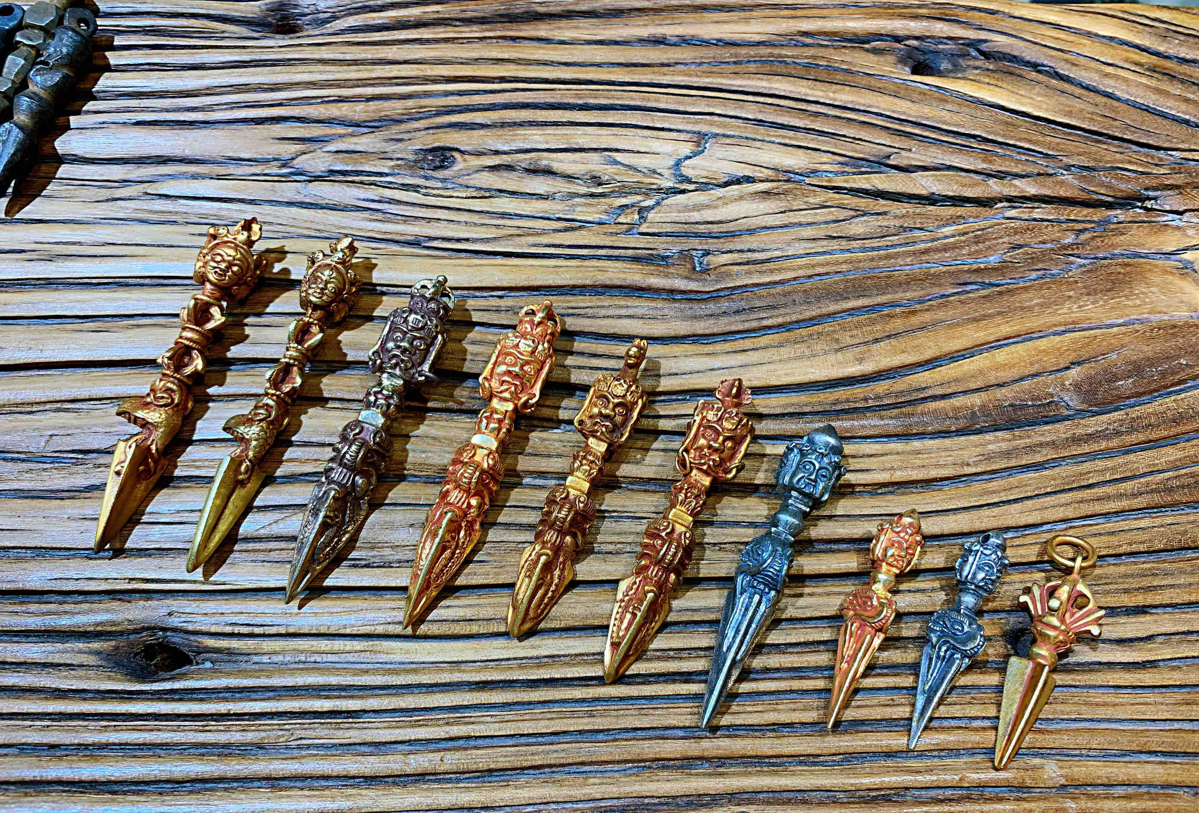 天语龙吟&梵音苑 尼泊尔手工白铜普巴金刚镢 辟邪降魔金刚橛挂件高约6.5cm 尼泊尔普巴金刚镢头戴五骷冠表示五方佛的智慧,三面愤怒本尊相,雕刻蛇饰表示本尊具足能统治一切之威力🙏"普"字表空性之义,"巴"字表智慧,普巴即空性与智慧结合成不二体性。普巴法的修持,在于断除一切自我之贪执,消除内心之恐惧,如此,才能了解法界性,亦即不在于降伏外在之物,而是在于对自己内心本性的了悟。藏名译音 : 多杰雄努译意 : 孺童金刚解说 :普巴二字为藏语,其义为橛,以本尊手中所持主要之法器为三菱前尖的利器,故古有「金刚橛」之称,而今通称为普巴杵。