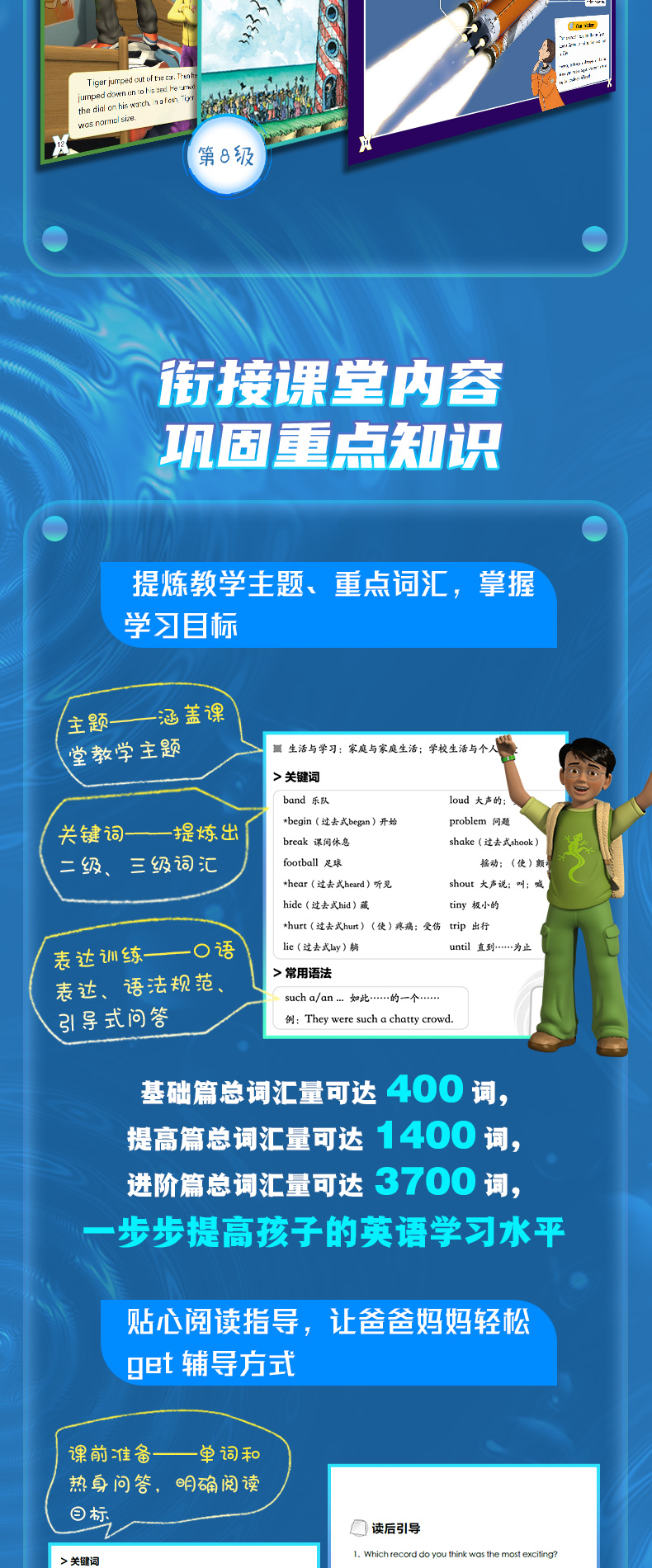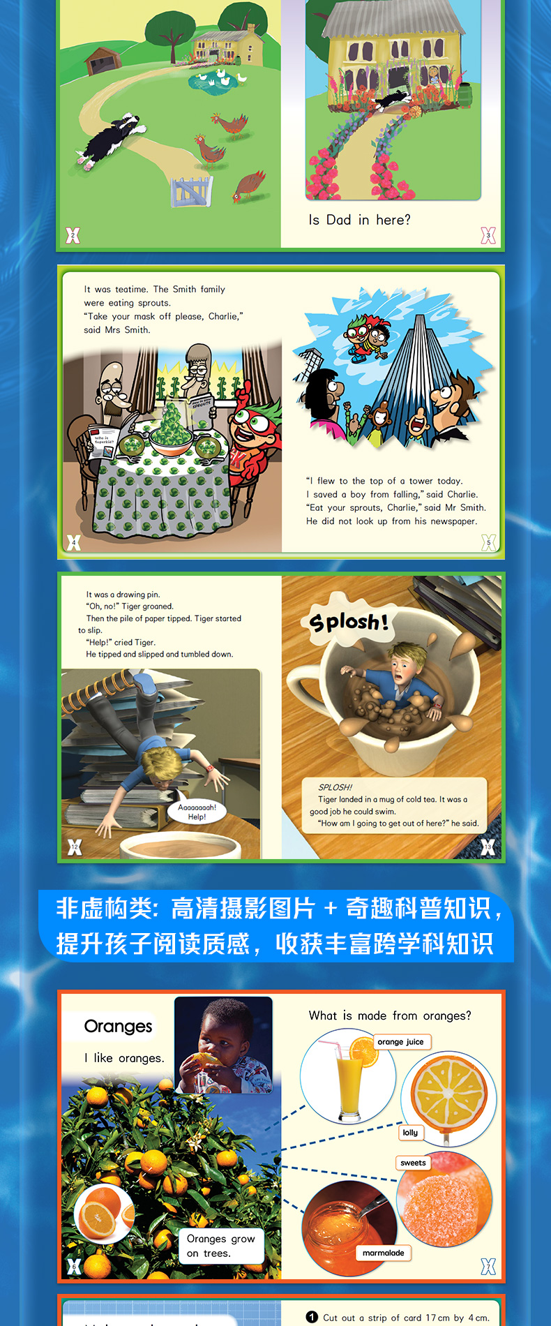 说起英语分级阅读,很多家长都面临着诸如此类的问题:英语分级图书种类繁多,到底该怎么选?很多家长都倾向于选择语言地道的原版书,但就算是买到了原版书,可通篇的英文阅读指导,拿到书无从下手怎么办?很多孩子,尤其是男孩,对市面上大多数日常题材的英语读物不感兴趣怎么办?为此本系列分级读物做了一系列的尝试与努力。