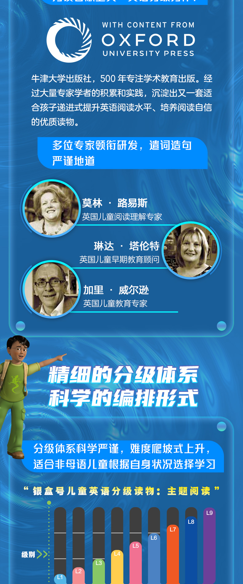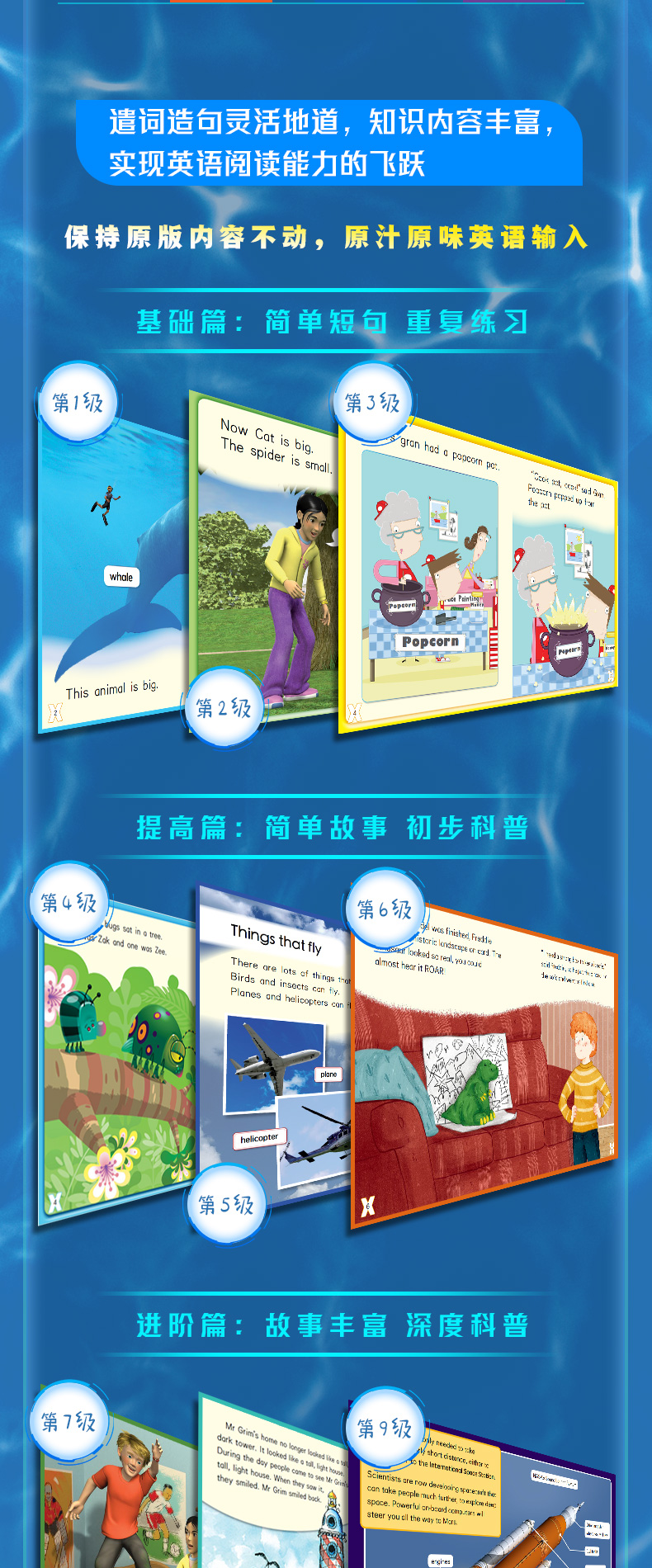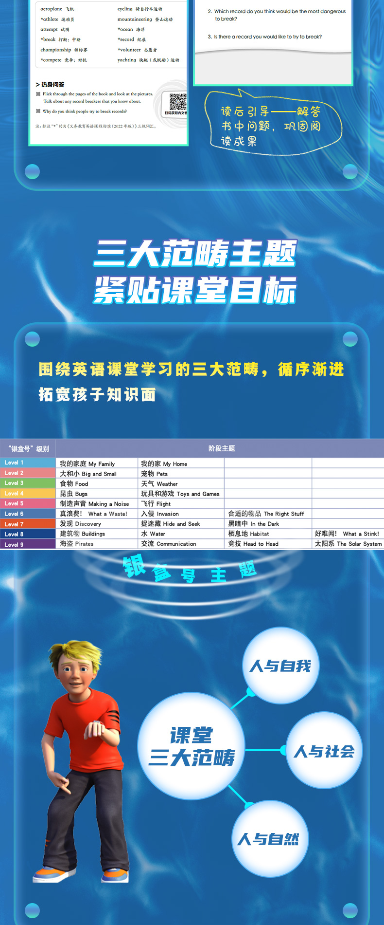 “银盒号”1~9级共有216册,涵盖主题阅读、自然拼读、自主阅读三个系列。其中“主题阅读系列”共116册,每3级为一个套系,分为“主题阅读基础篇”“主题阅读提高篇”“主题阅读进阶篇”。基础篇的阅读主题以日常生活为主,包括家庭、宠物、天气等。提高篇和进阶篇的主题涉及自然、科学、艺术、历史等多个领域,如水资源保护、通信技术的演变、太阳系探索等。