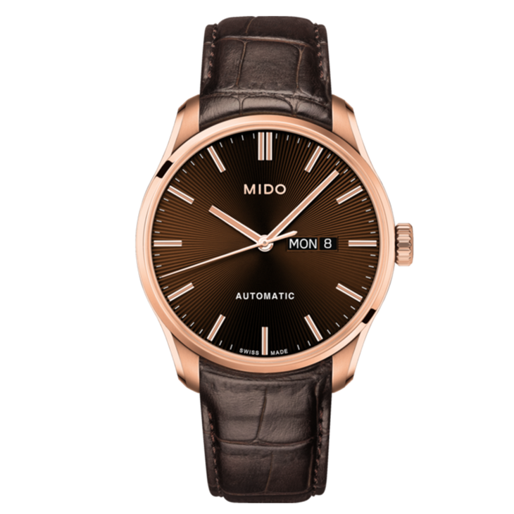 镜面 材质 | 蓝宝石水晶玻璃 | 表盘 | PVD镀玫瑰金表壳 深棕色表盘 大三针 日期 星期显示 透底 |
