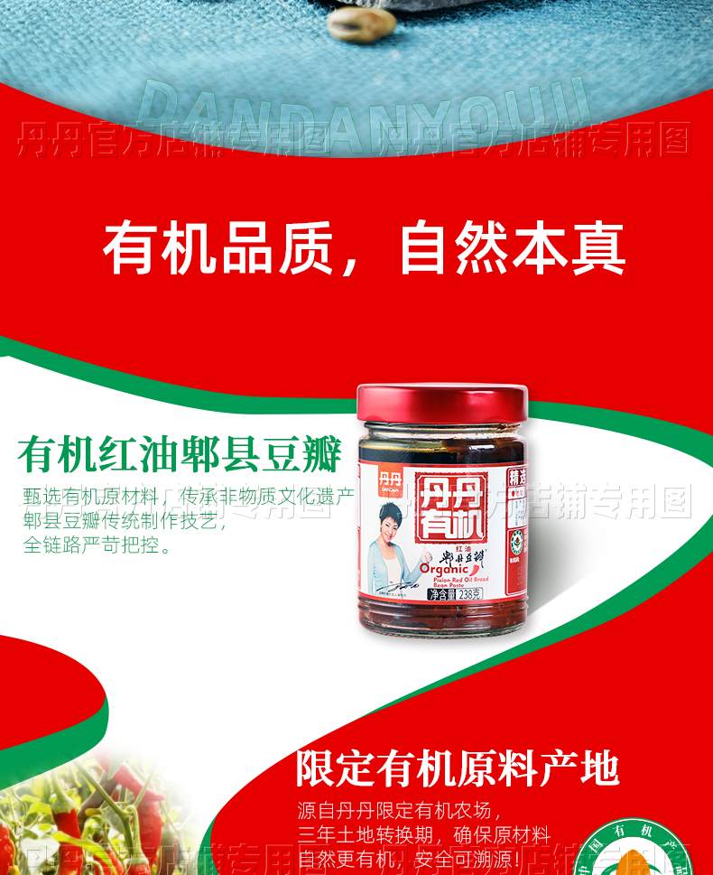 丹丹有机红油郫县豆瓣238g四川川菜家用调料炒菜烧菜无添加辣椒酱