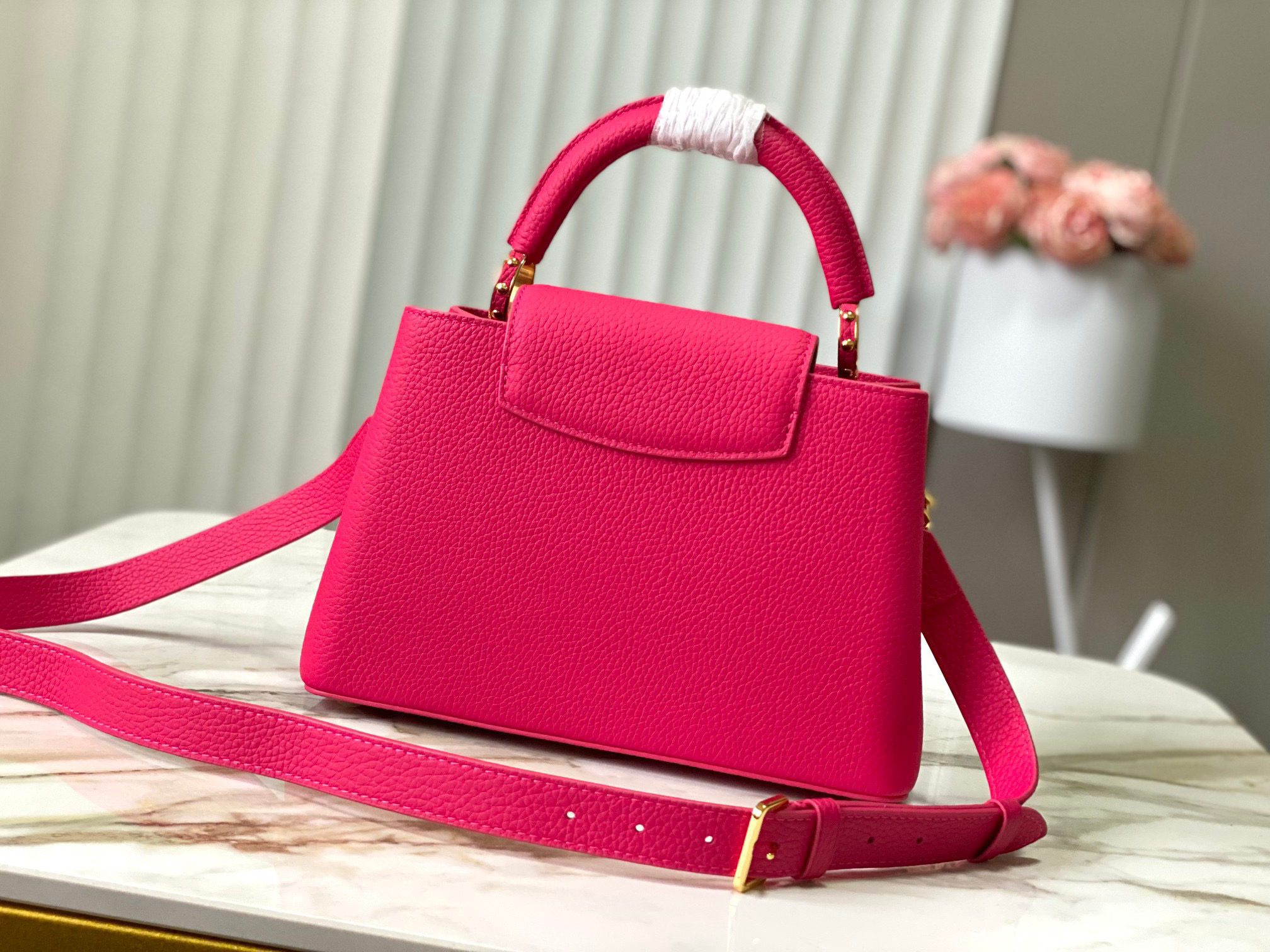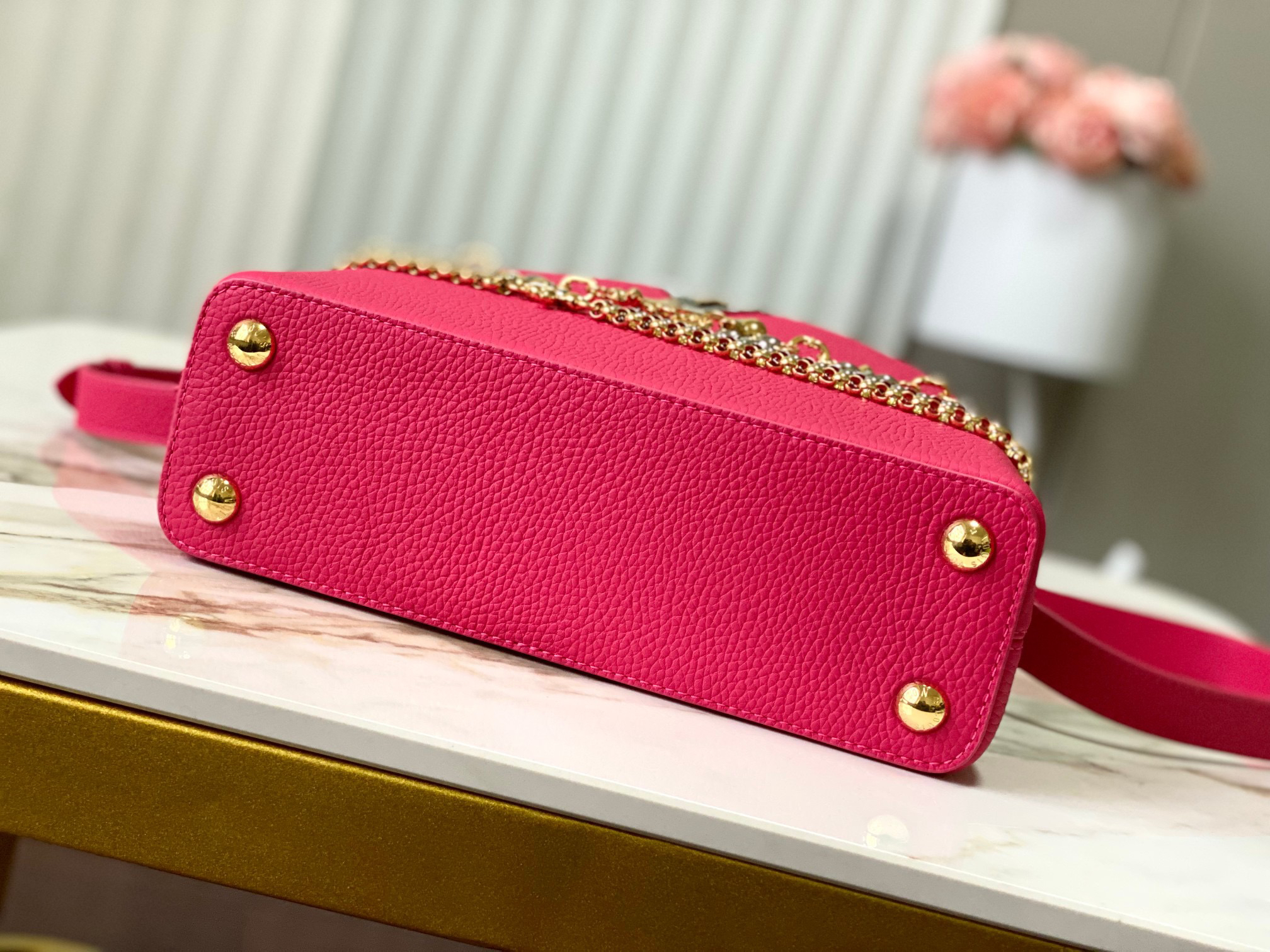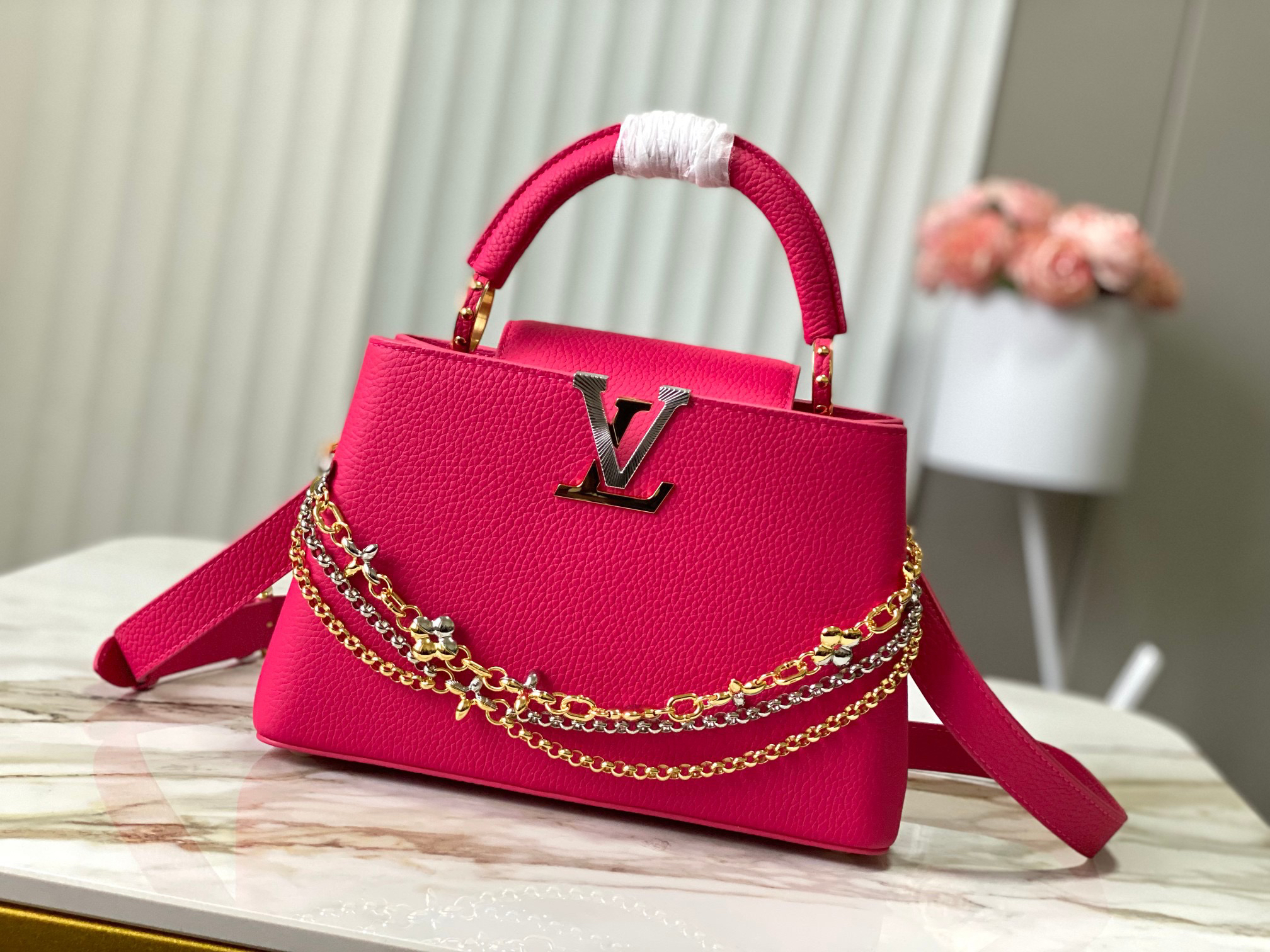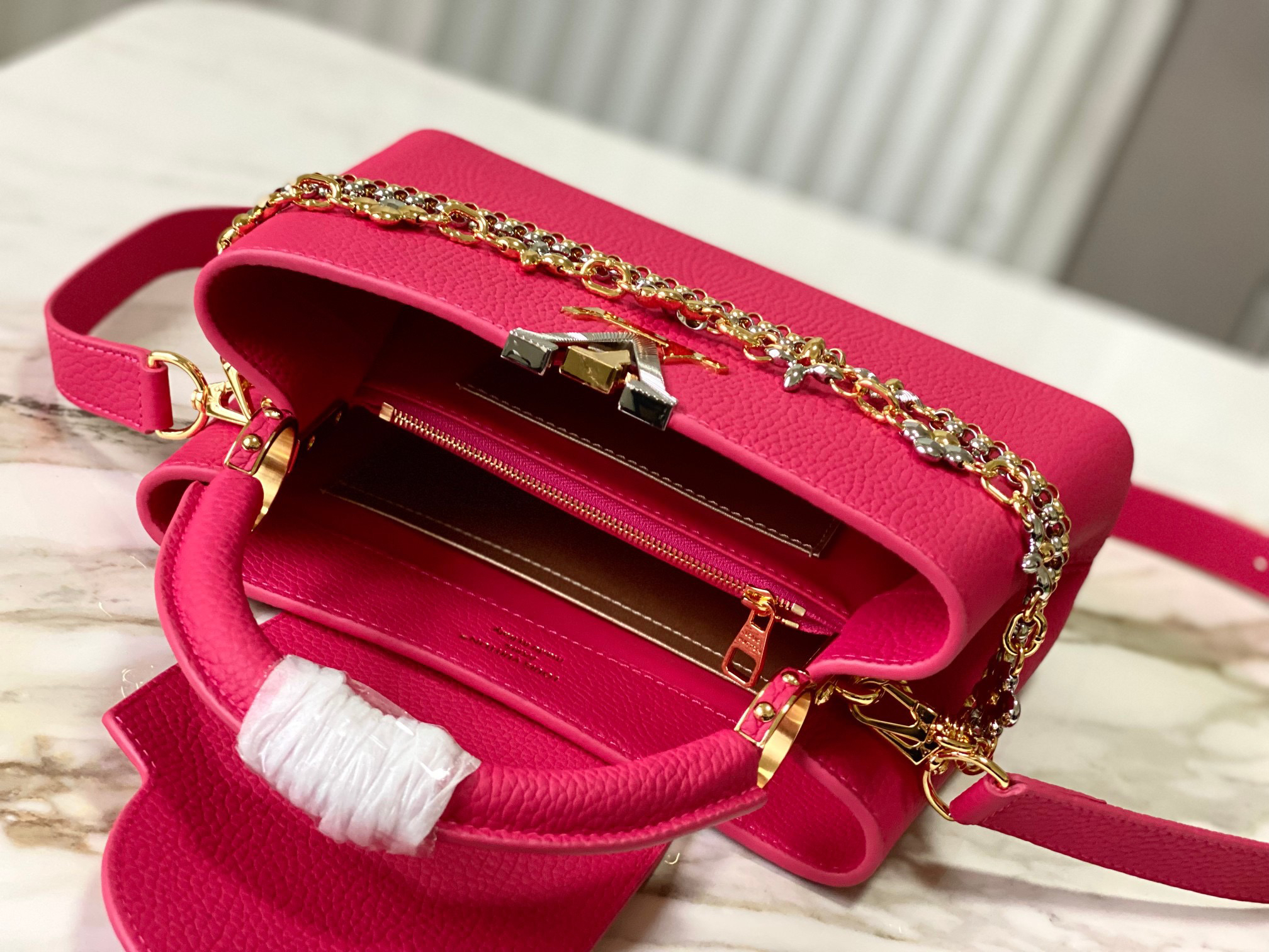 秋冬特惠💰1730 渠道级LV 新品 te级LV 动态芯片 M26507/M48865紫玫红光线链条款 这款Capucines采用引人注目的、精致的宝石色调版本装饰有品牌的双镀锌Infinity链条 采用Taurillon皮革制成 饰有标志性的Monogram花卉图案 以及LV首字母标识 这些标识经过独特的放射状效果处理 这种双重携带风格包括一个内部的扁平口袋 且有多种佩戴方式 Size : 27 * 18 * 9 CM