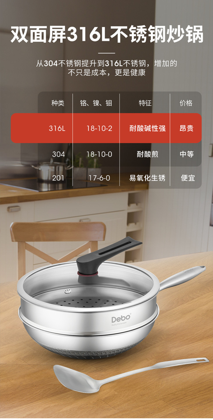 Debo 德铂迪塞尔316不锈钢蜂窝炒锅