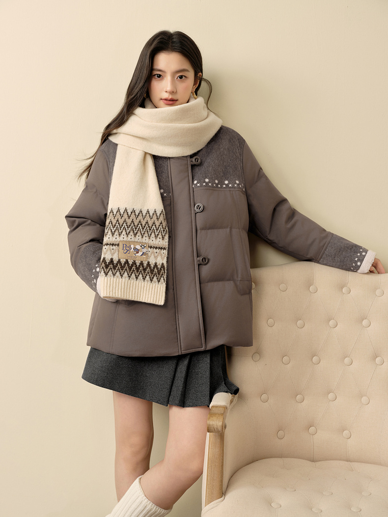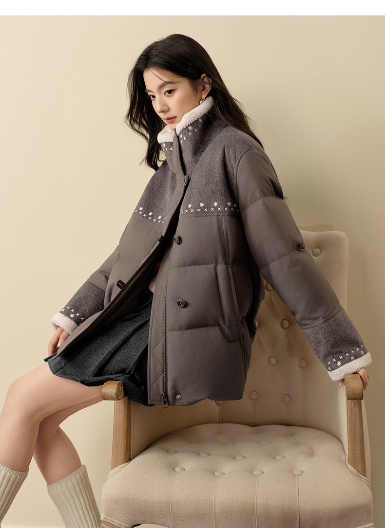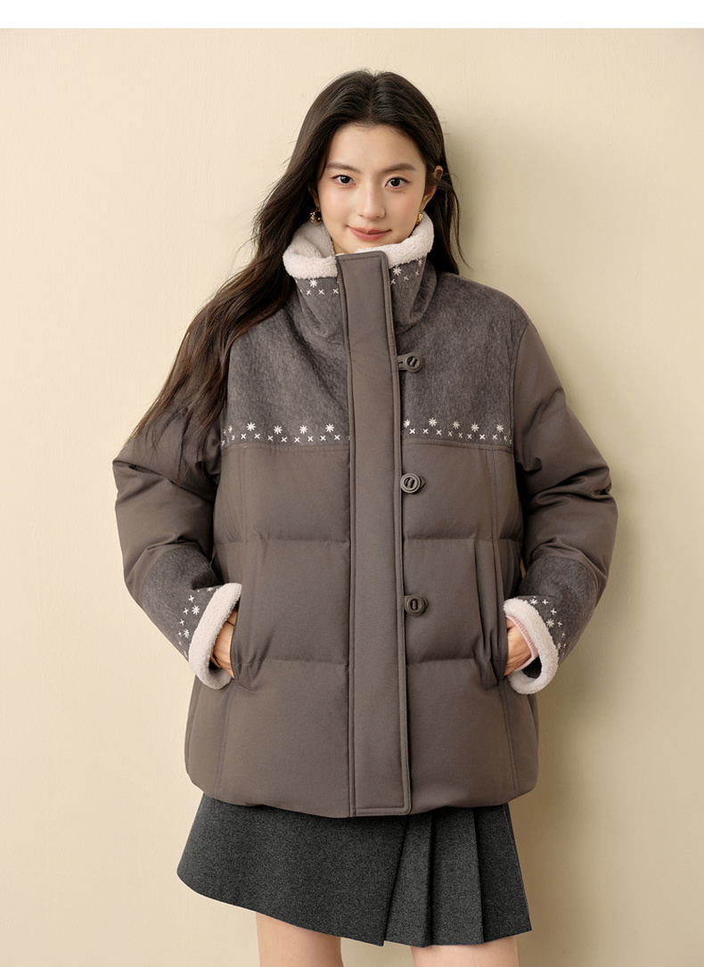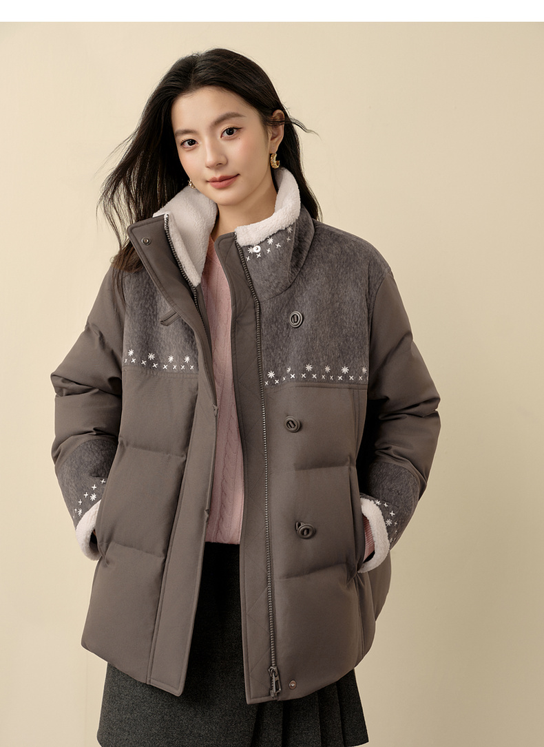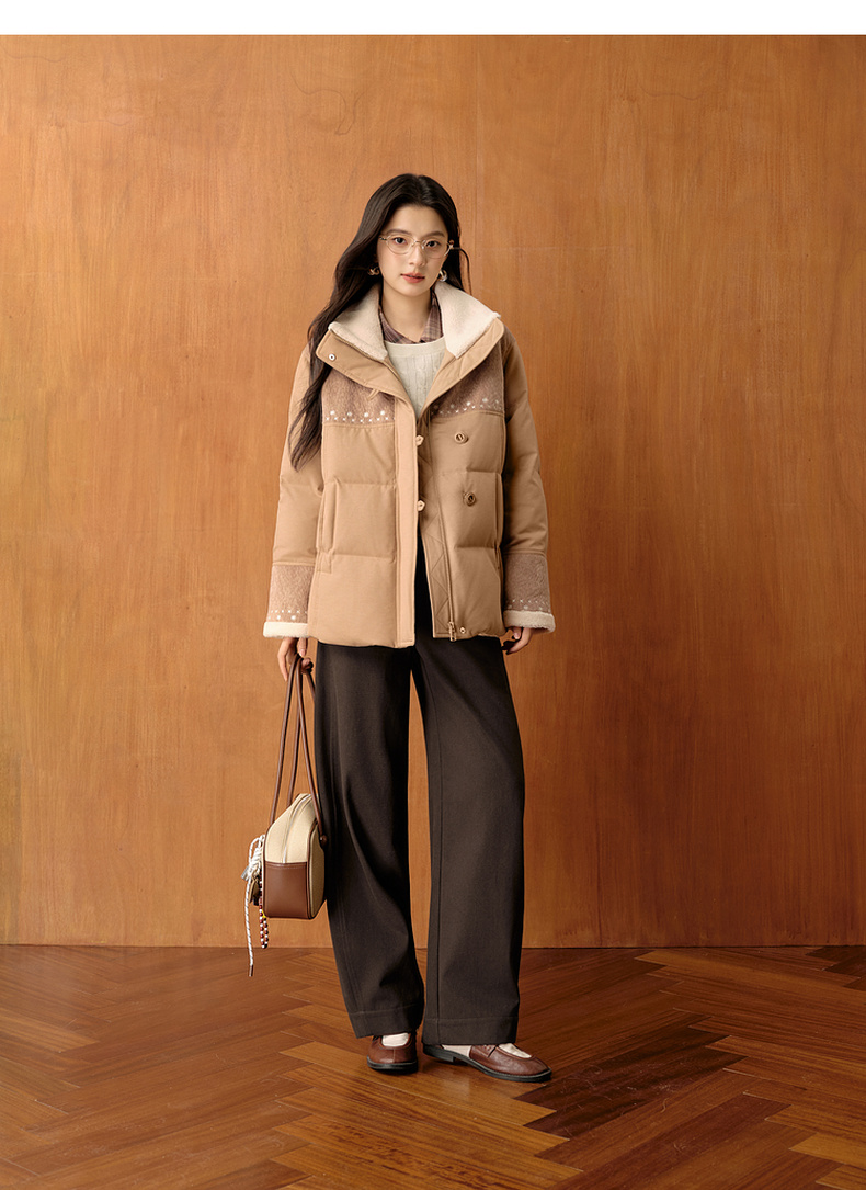 【严选】诗凡黎拼接仿羊羔毛保暖面包服2025冬新款防风立领短款轻薄羽绒服7GA380341