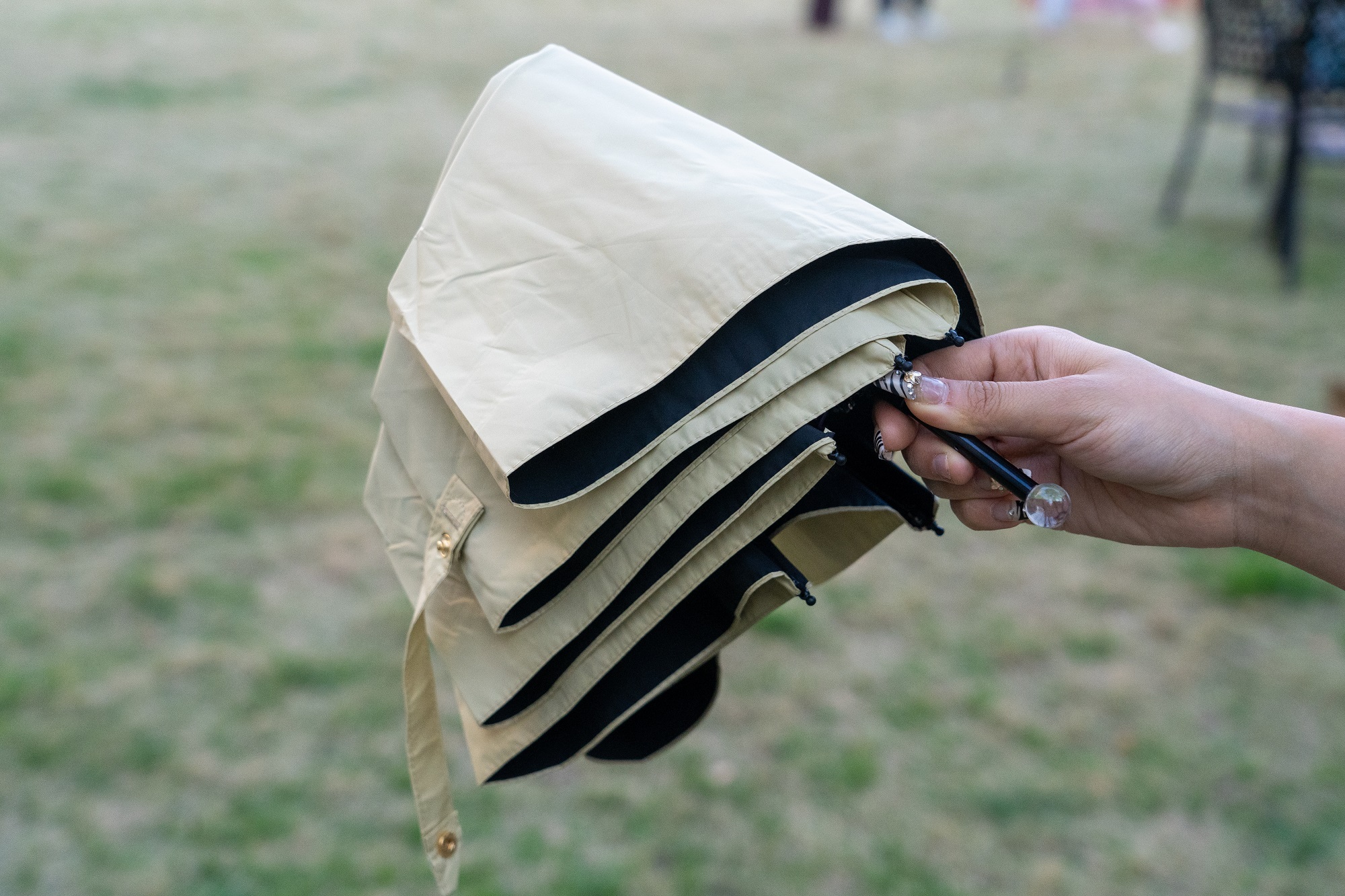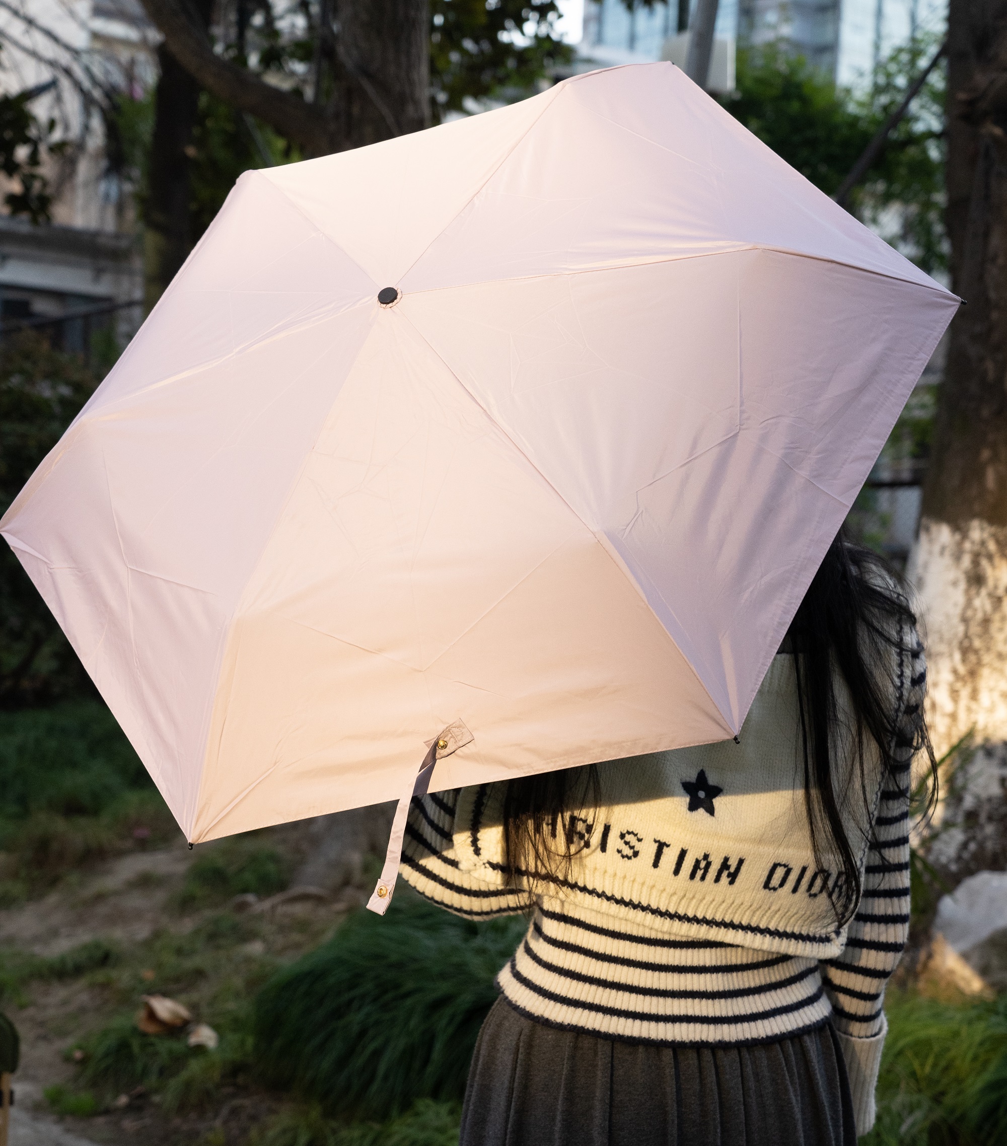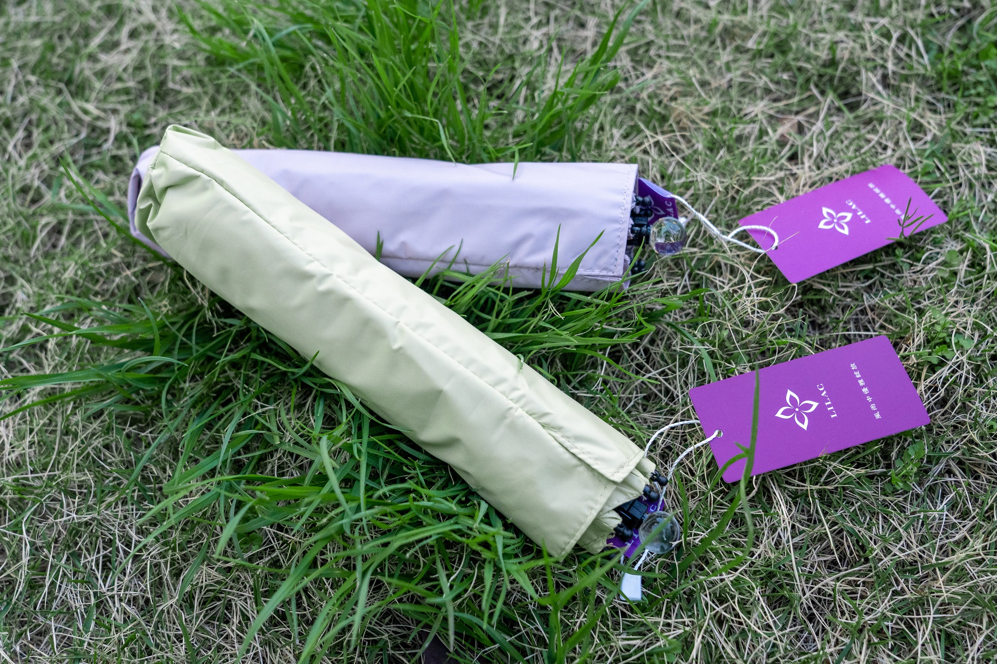 相比印花羽毛伞,薄&素遮光羽毛伞多增设了一根伞骨,伞布使用双面不同色的面料,每把重量大约在120g-140g。