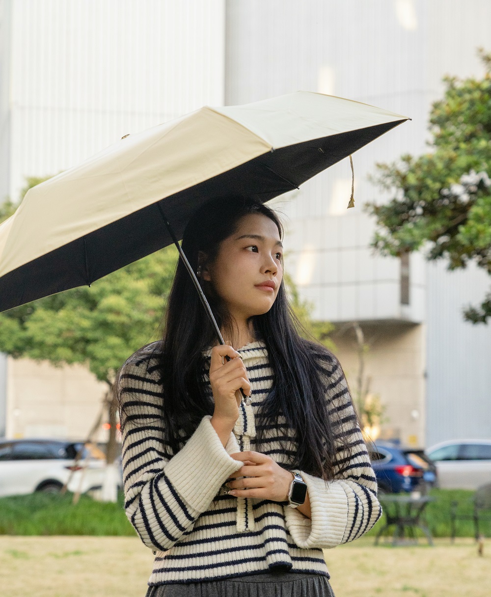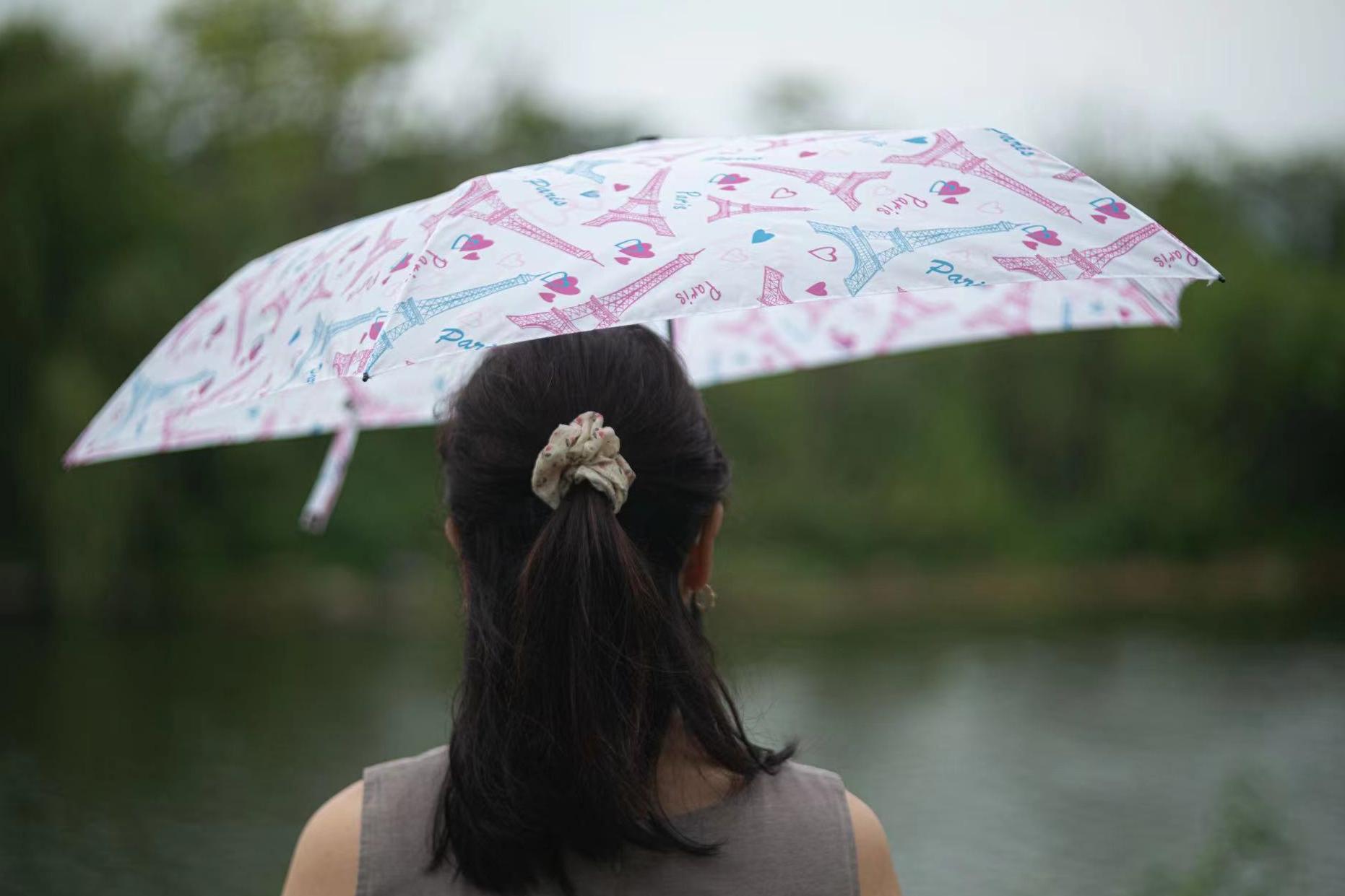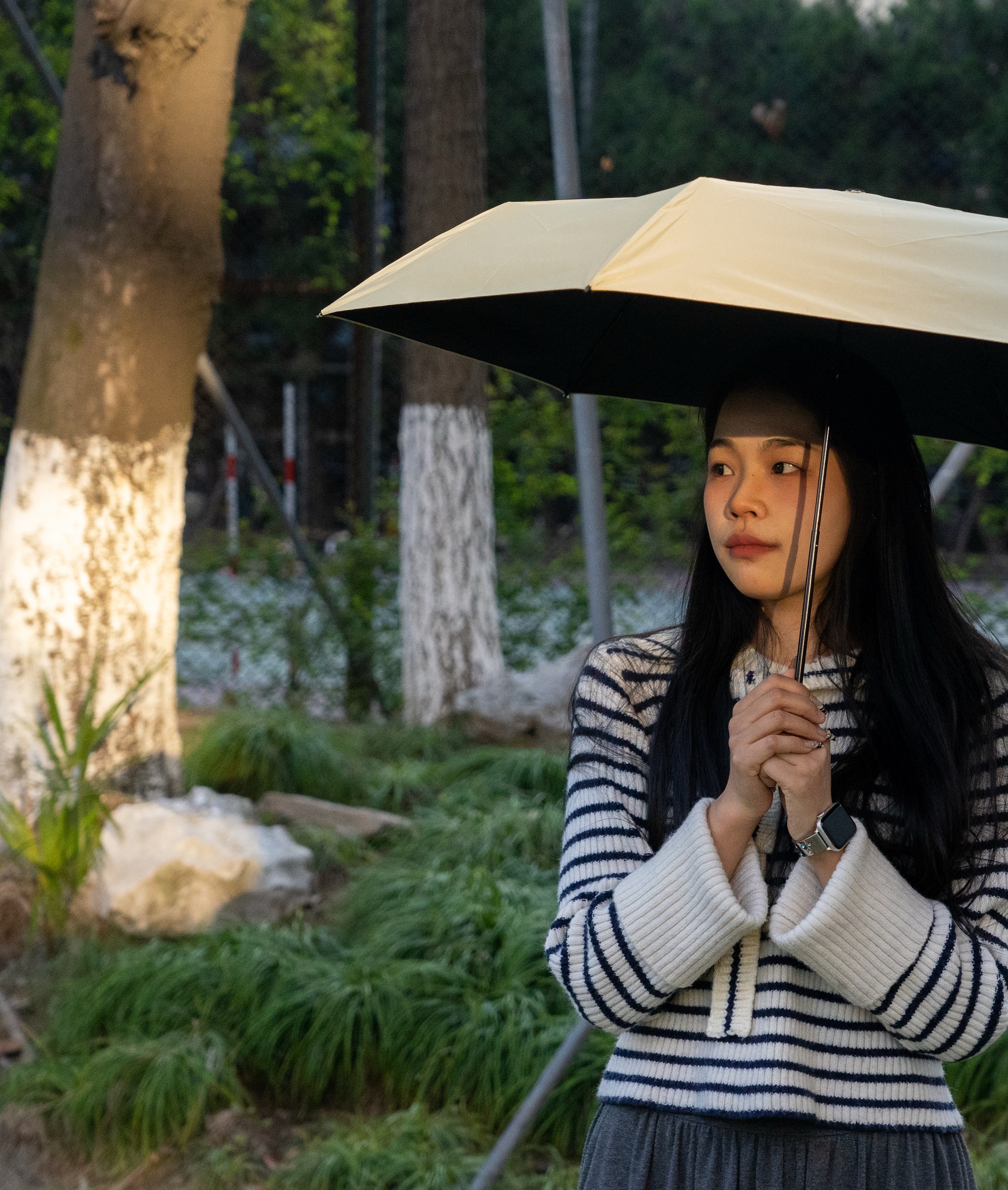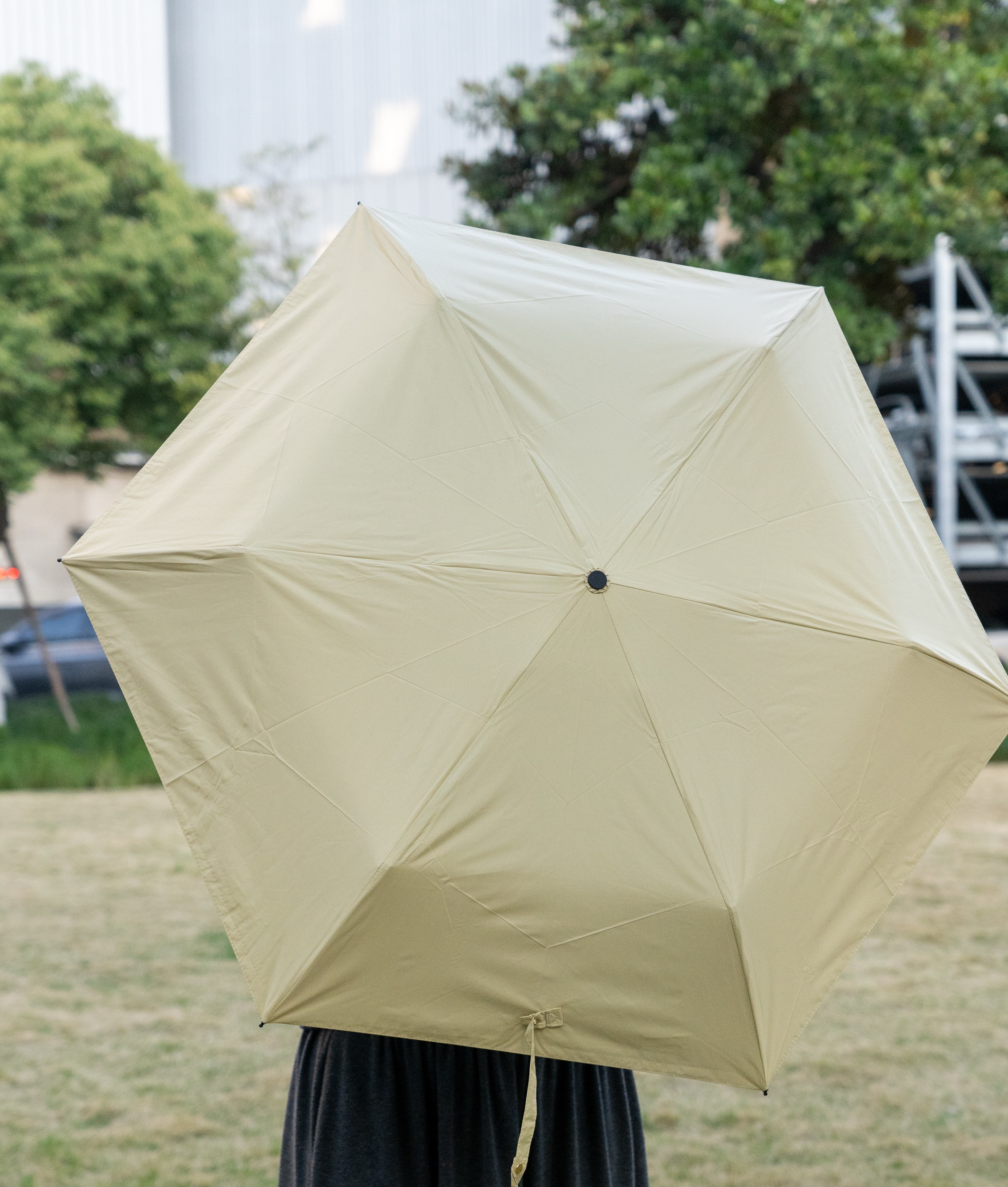 相比印花羽毛伞,薄&素遮光羽毛伞多增设了一根伞骨,伞布使用双面不同色的面料,每把重量大约在120g-140g。