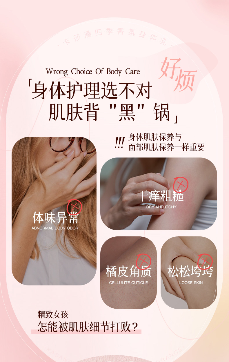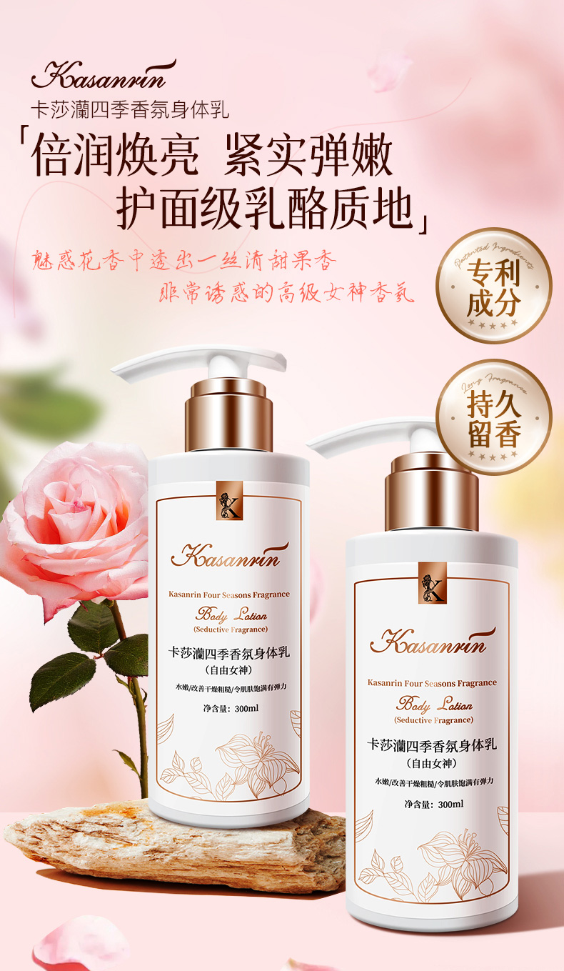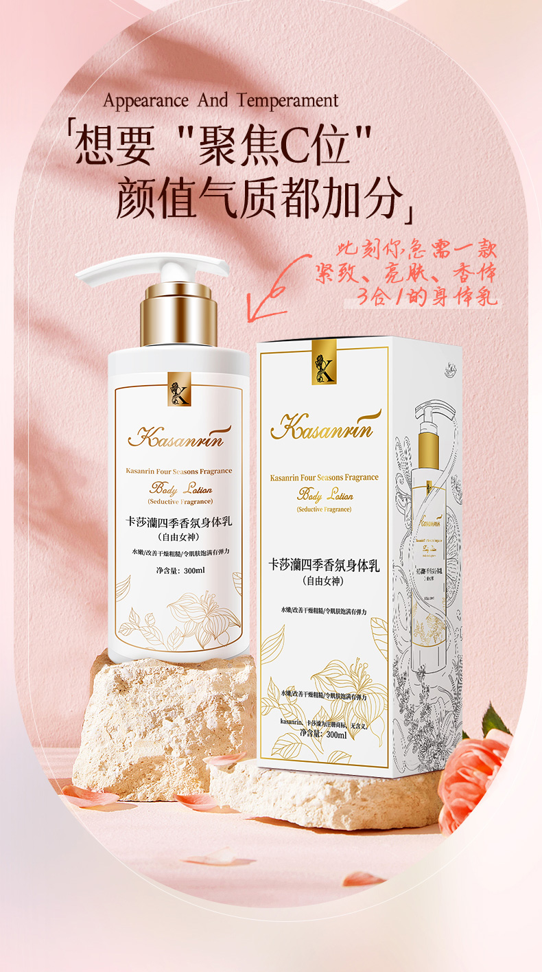 卡莎灡四季香氛身体乳补水保湿、滋嫩干燥肌肤、水嫩润滑。