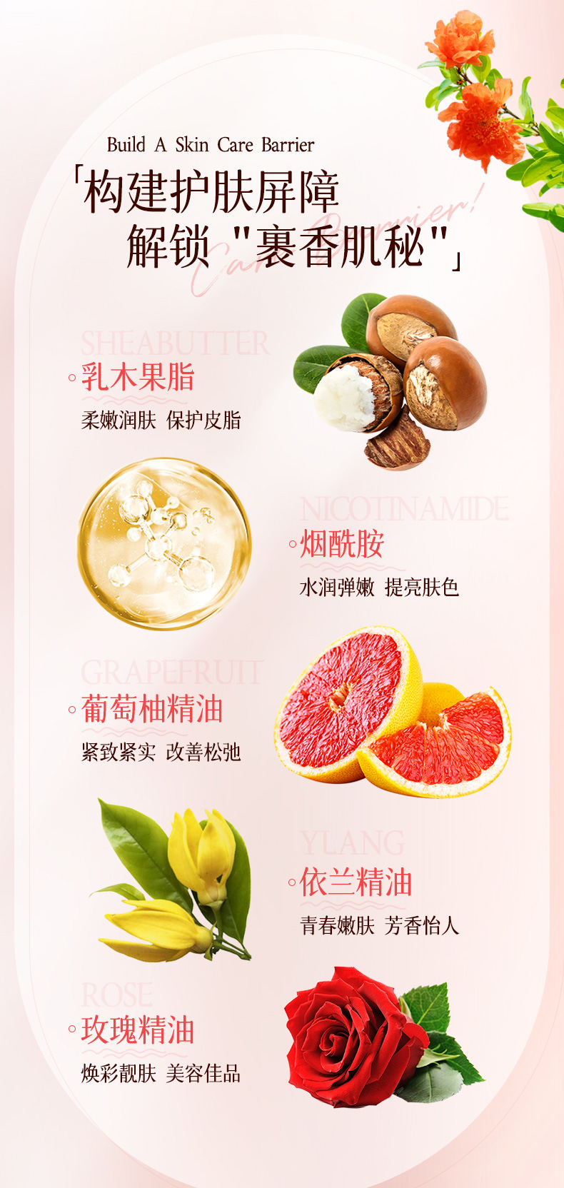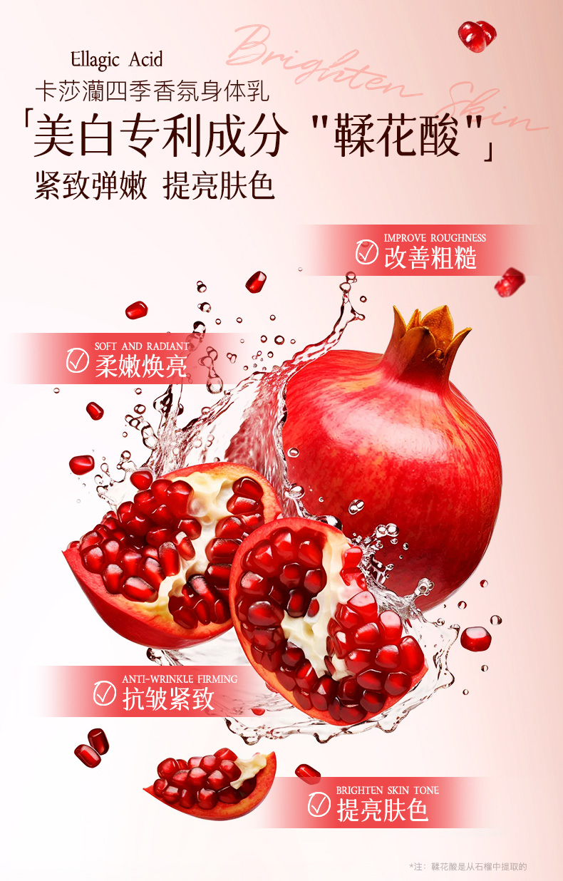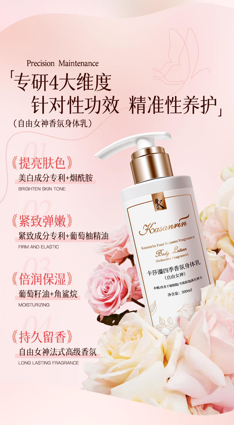卡莎灡四季香氛身体乳补水保湿、滋嫩干燥肌肤、水嫩润滑。