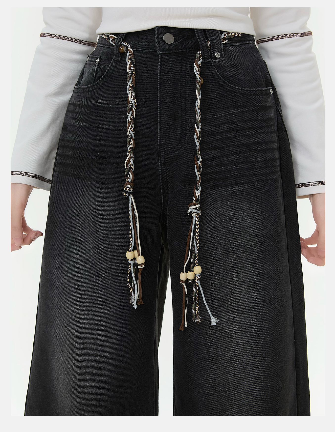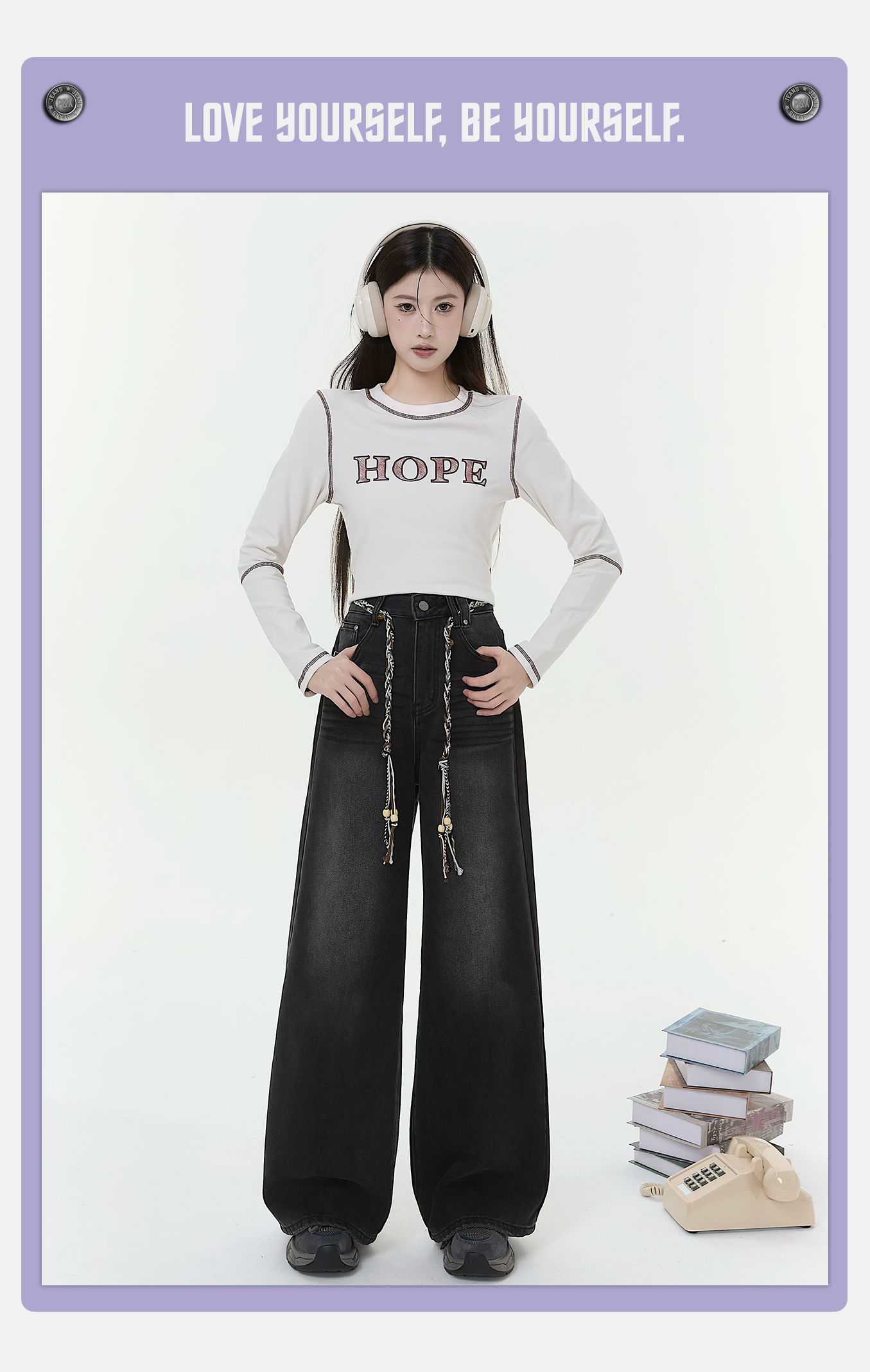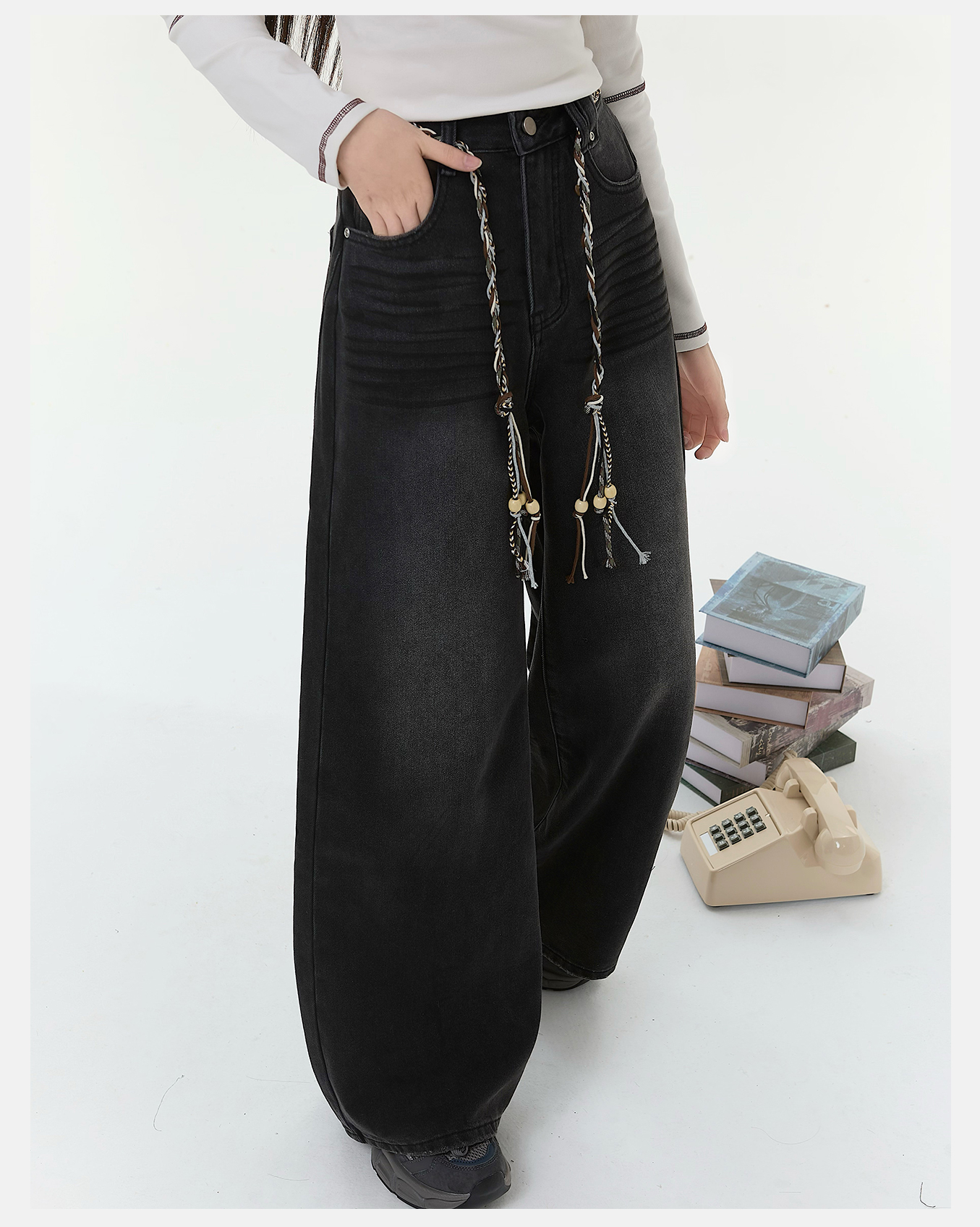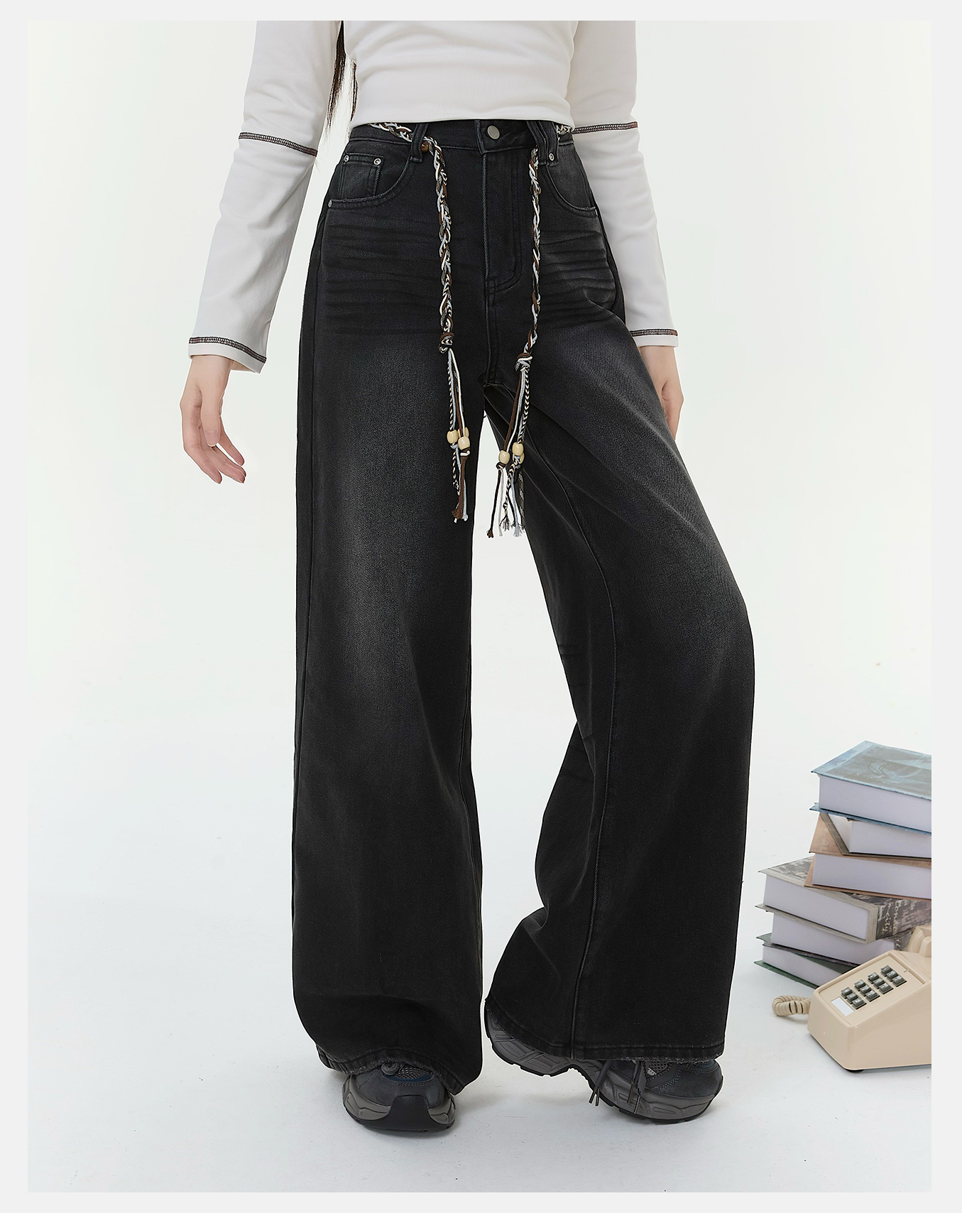 P&X设计师女装2025冬季高街阔腿裤高腰牛仔长裤825410168 黑色