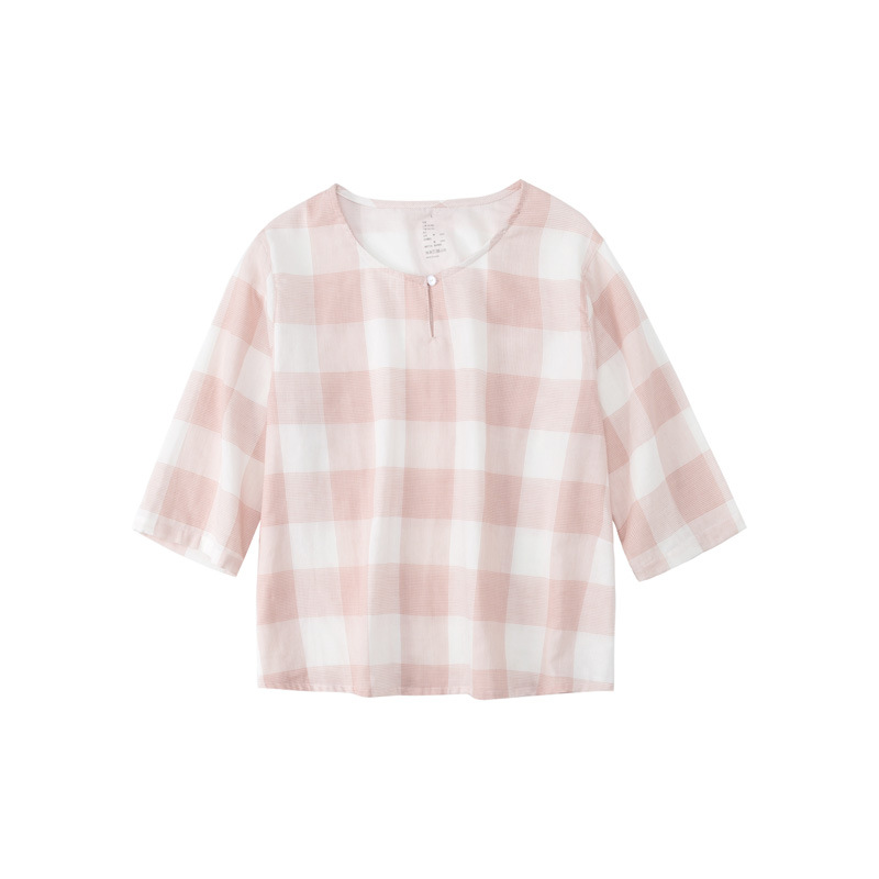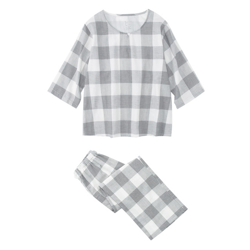 【双层纱千鸟格家居服】双层纱家居服女士七分袖家居服套装全棉格纹套头睡衣