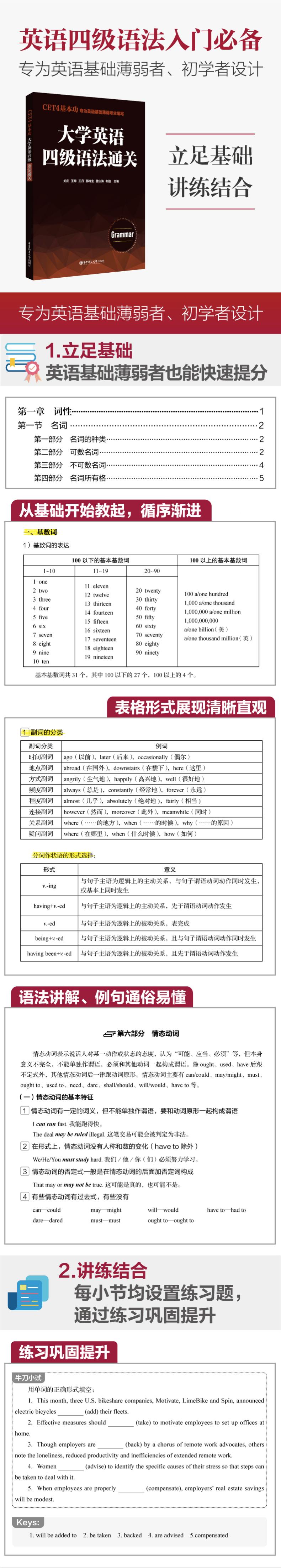 本书系统归纳整理了英语的语法规则,体系完整、内容齐备、编排合理、概念精准、例句丰富、解析到位。书中的每个知识点都给出简单实用的英文例句,并且附带中文翻译,方便学习者掌握各种语法要点。此外,本书在某些知识点后,还补充了一些与该知识点相关的特殊用法,或是重难点解析,能够使学习者全面而深入地掌握该知识点。本书适用于各类语法学习者,尤其是大学阶段备考大学英语四六级的英语学习者。相信读者学过本书后,对英语语法知识能够有更加透彻清晰的了解。
