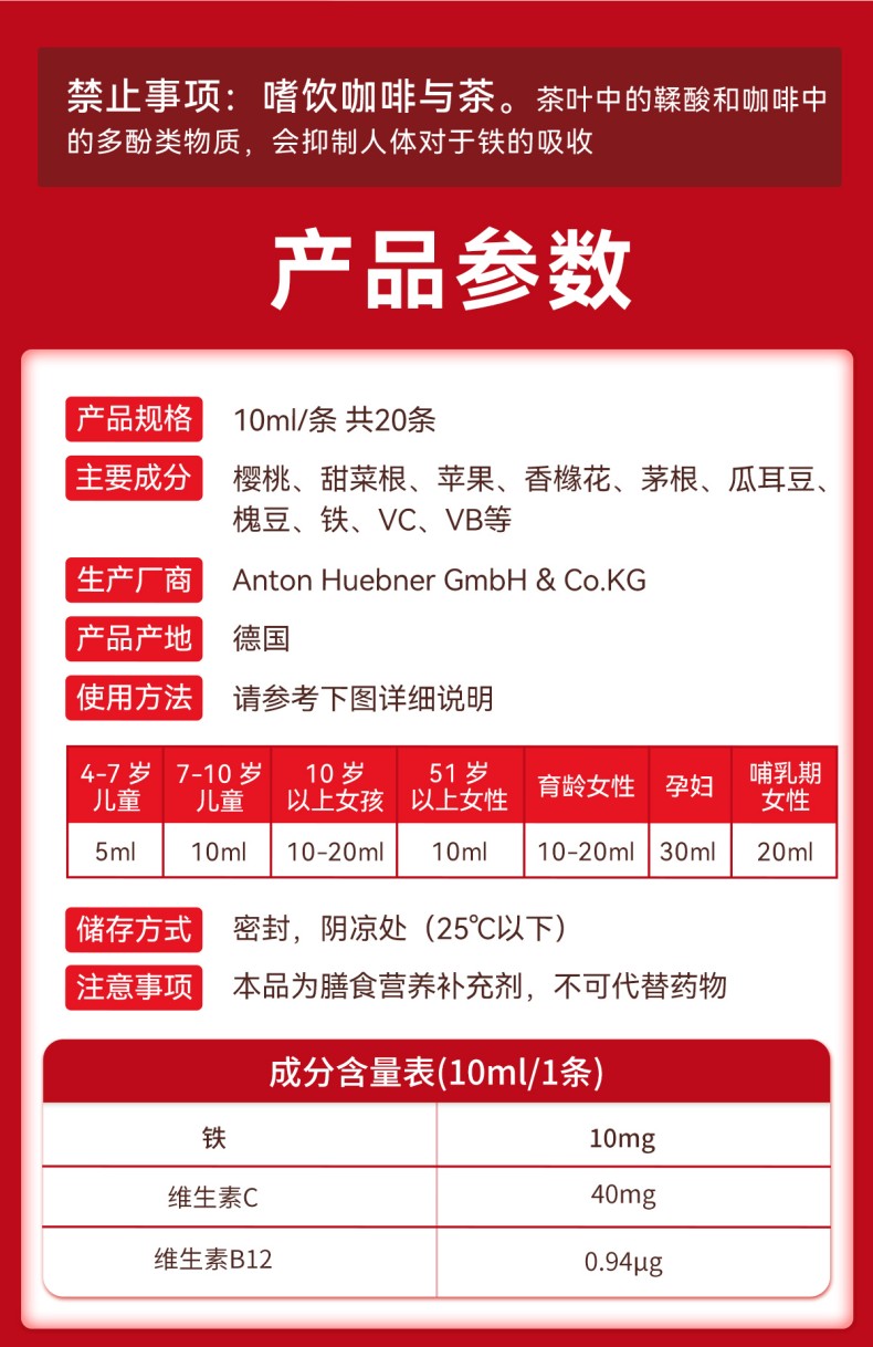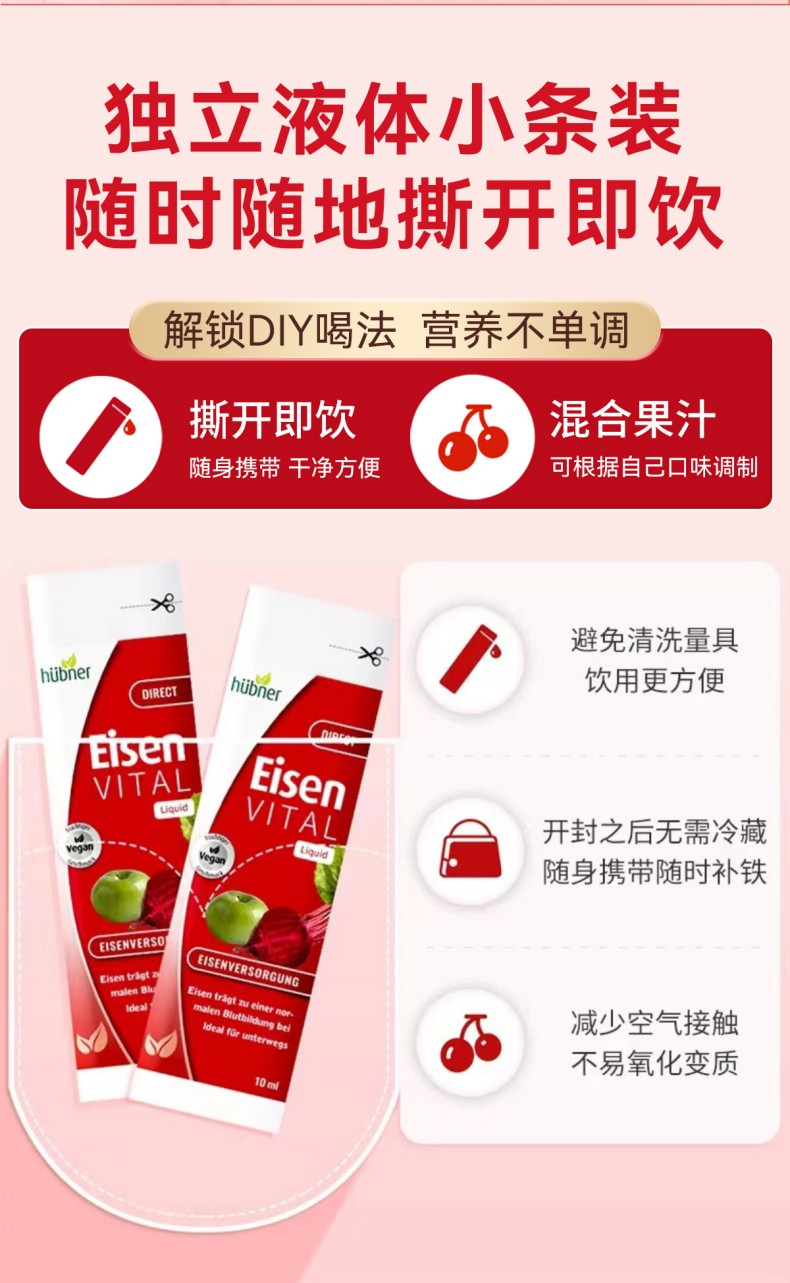 20条成人版 德国郝柏娜补铁口服液吸条便携装10ml*20 A-4771 (效期27-11)