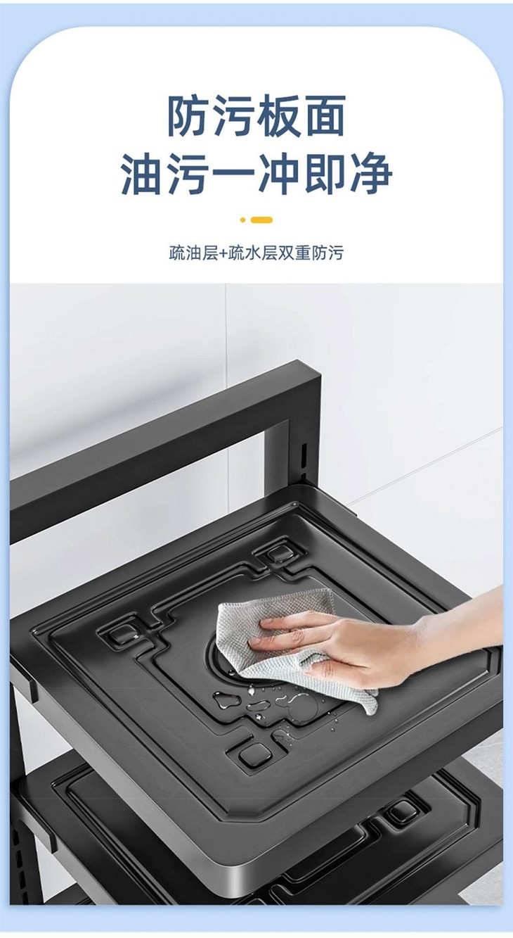 厨房征战最烦的就是油污难清 🔻这款置物架的板面采用疏油层+疏水层双重防污科技 形成纳米级防护膜,油污粒子无法附着渗透 清水一冲,抹布一擦,无需清洁剂,即刻恢复洁净
