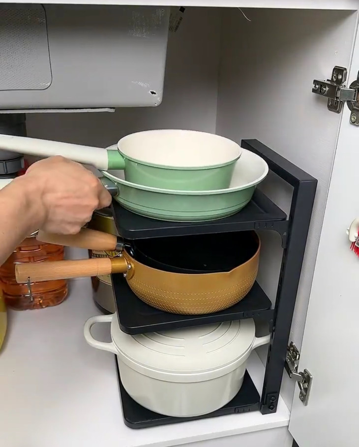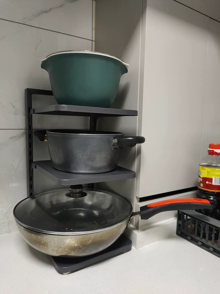 锅具有大有小,高度也不同 🔻这个收纳架自带卡槽,可以自由调节高度 确保各种尺寸的锅都能放上 深锅浅锅一架尽收,橱柜从此井然有序