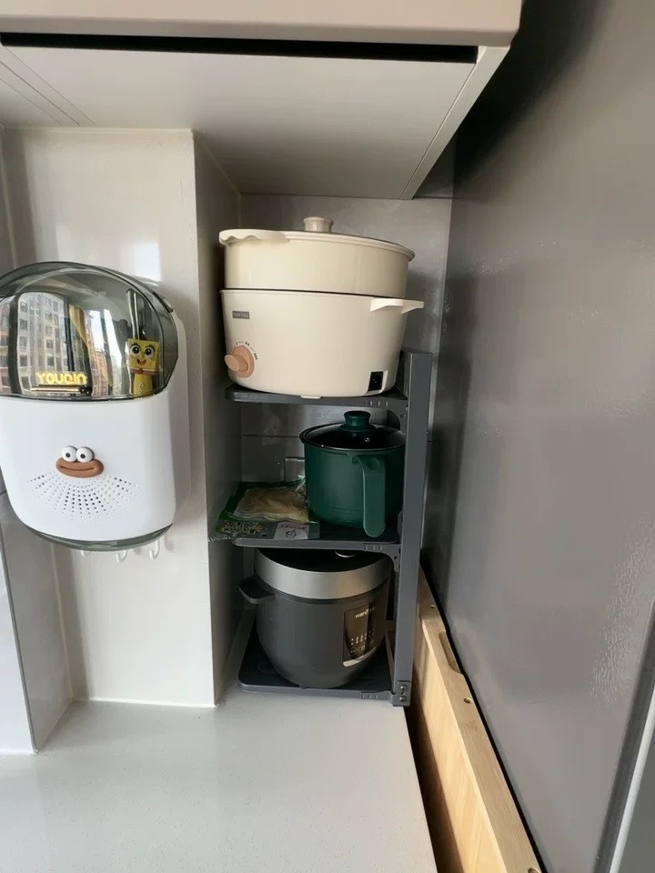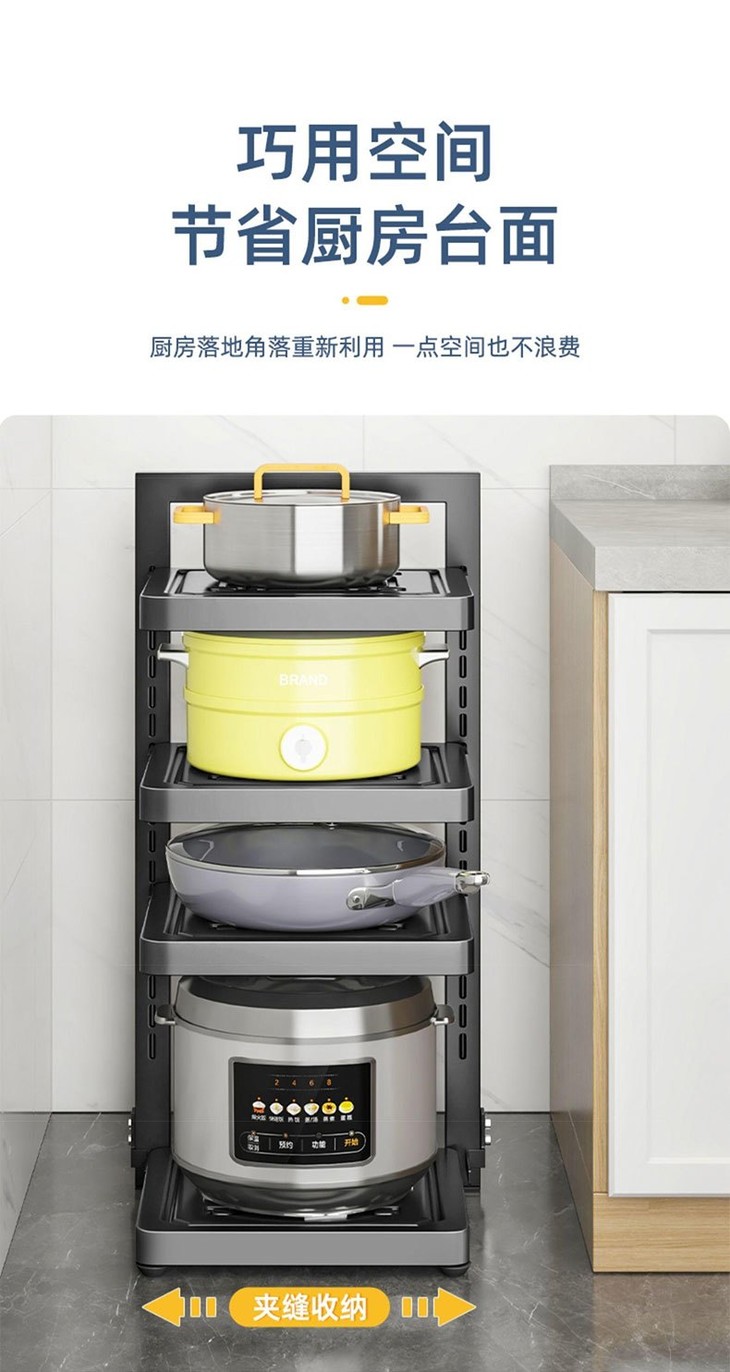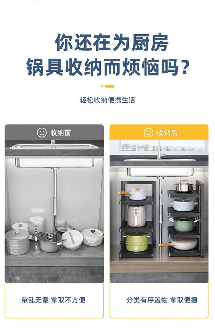 🔻适配多场景,灵活变换,完美融入各个角落 🔹厨房台面上,纵向叠加设计 让单层的台面拥有双层甚至三层的储物能力 🔹水槽周边,见缝插针 完美嵌合水槽与橱柜缝隙,常被浪费的"死角"秒变黄金收纳区 🔹墙边垂直,向上扩容 贴墙而立,不占用一丝地面,却能搭起整面墙的锅具展示区