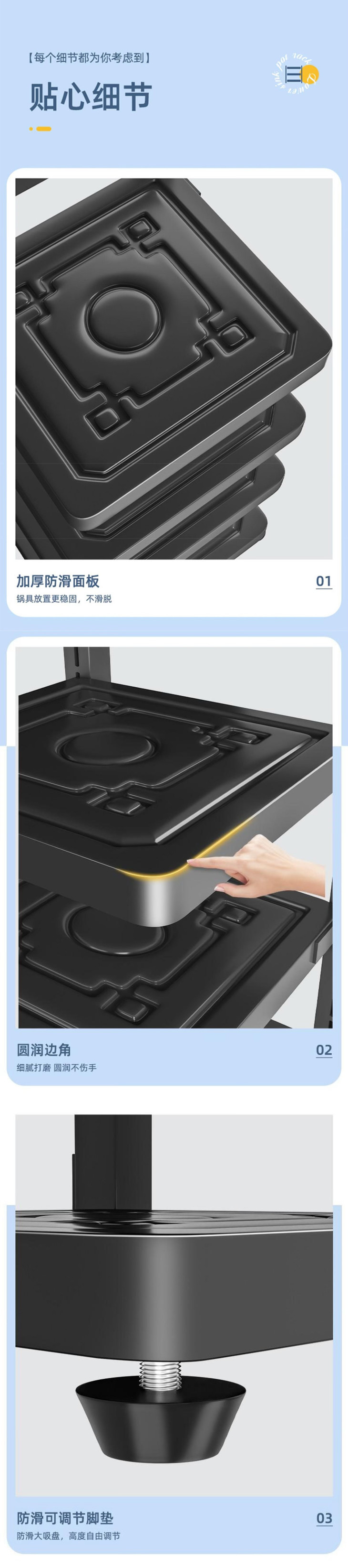 🔻除了好用,还贴心设计了一些小细节 🔹加厚防滑面板 告别传统收纳架"一碰就滑、一滑就倒"的痛点 🔹细腻打磨的圆润边角 即便手臂不小心磕碰到也不会留下红印或划伤 🔹防滑可调节脚垫 在湿滑地面也能稳固不移,更贴心的是可高度自由调节