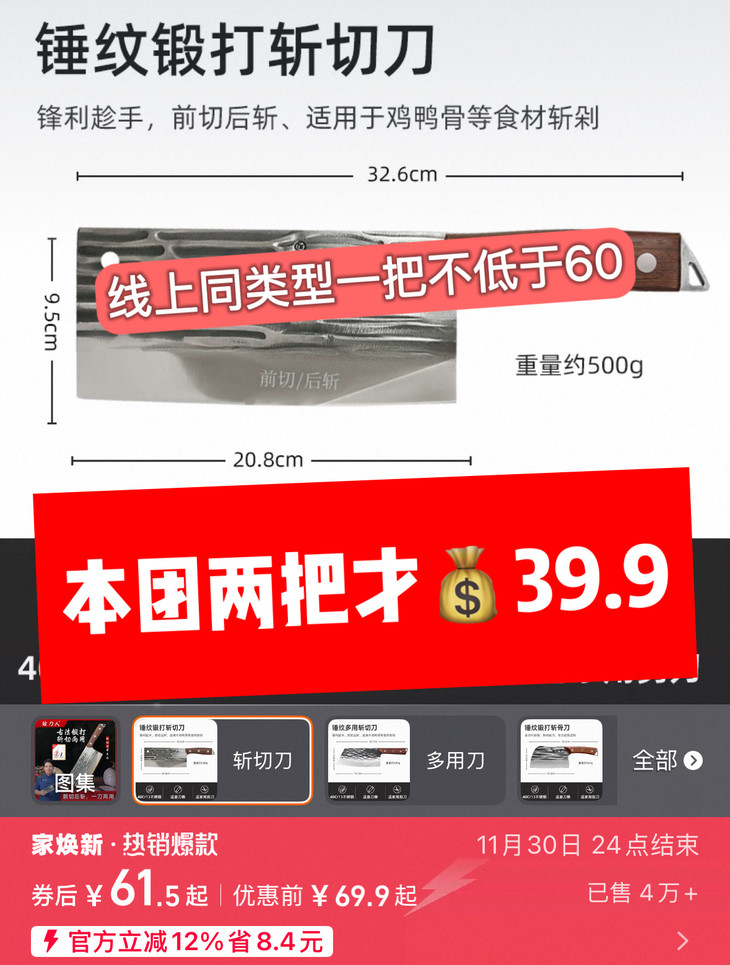 🔥39.9 能得两把! 以正常半把刀的价格用上实用套装 这个价格别的地方几乎是买不到的 存货有限!抢到才是真正赚到 ✅砍骨刀:属于家用中型砍刀,排骨、大腿骨、筒子骨砍切通通不在话下,双面开刃45°,砍切力更集中,刀身与手柄一体冲压成型,加铆钉坚固,防断耐用 ✅斩切刀:属于中轻型菜刀,超锋利刀刃,V形15°开刃,切配不再费力,能切能斩一刀多用