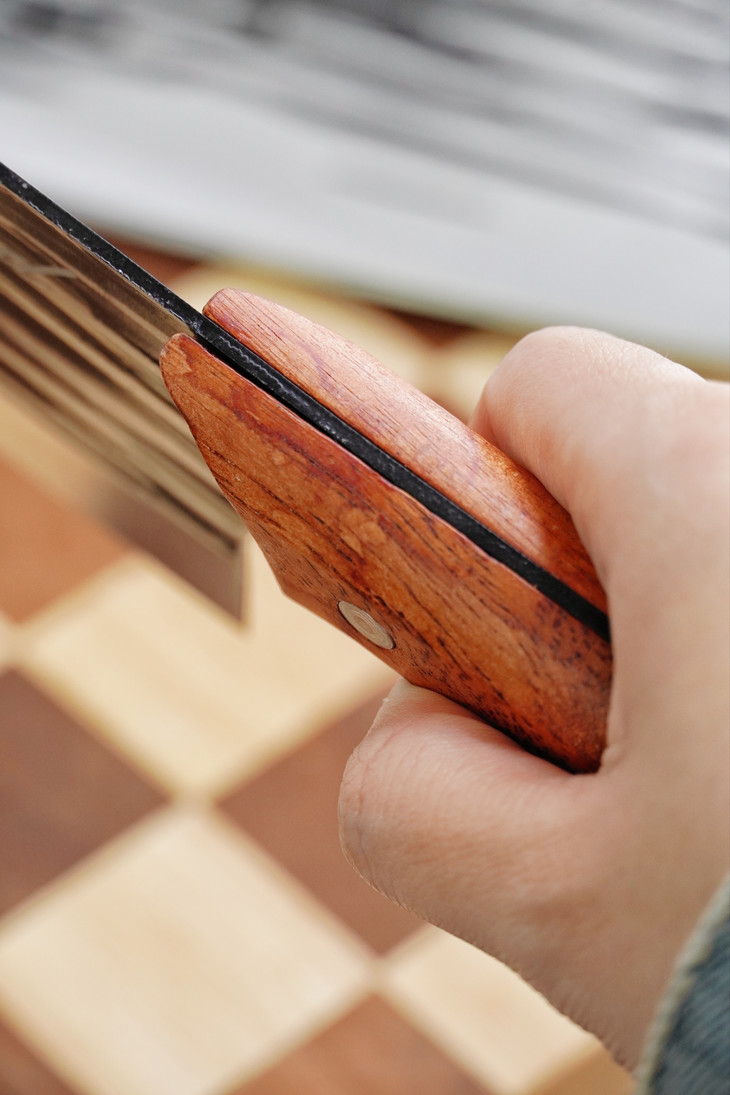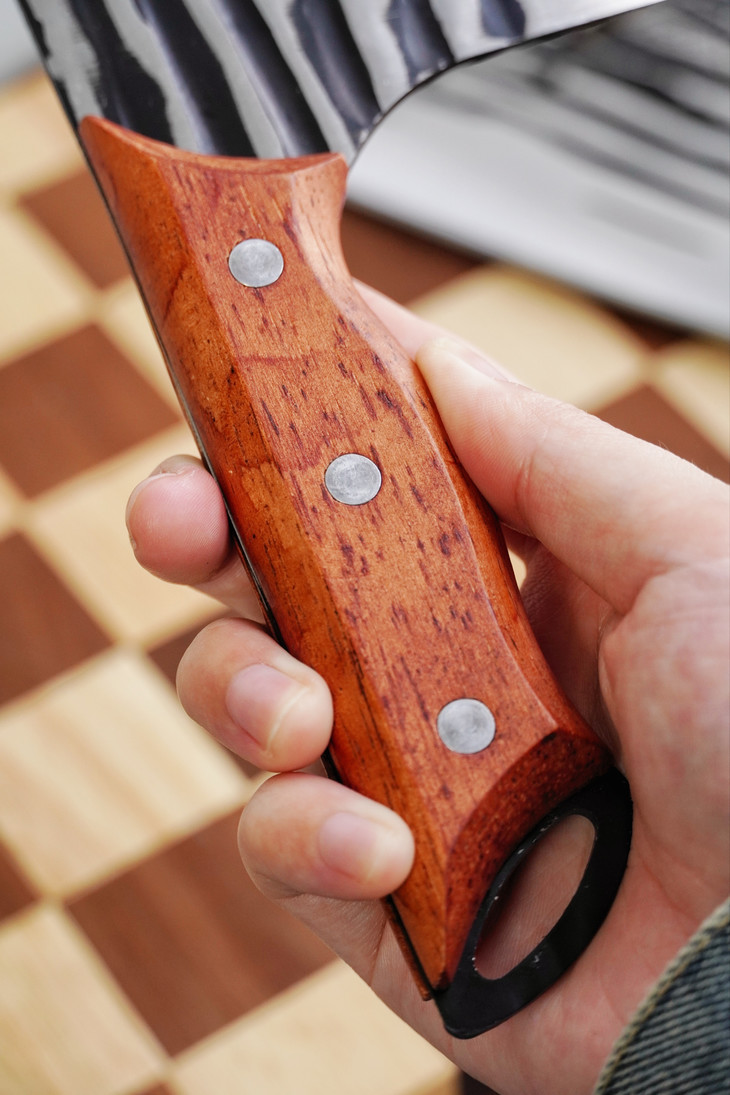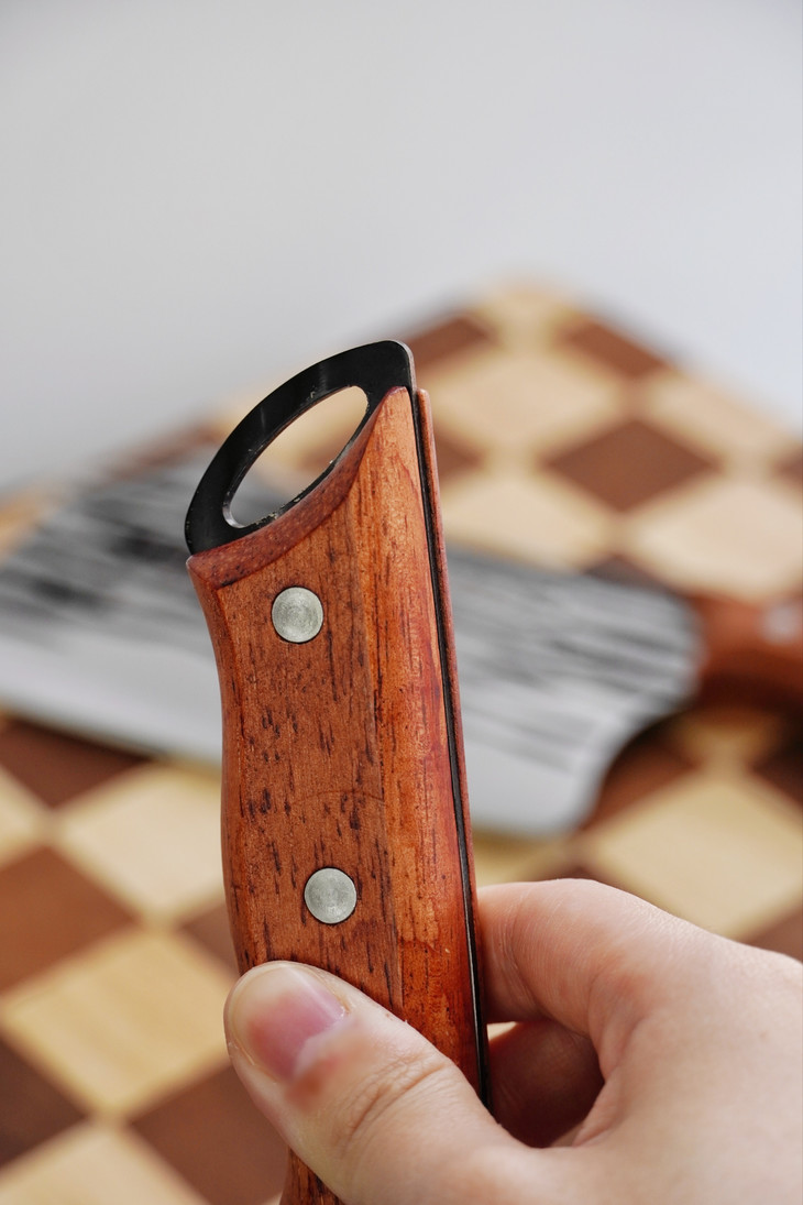 实木手柄经过精心打磨和抛光处理,表面光滑细腻,握感舒适 不仅具有良好的质感,还能有效防滑 即使手部出汗,也能牢牢握住刀具,确保使用安全