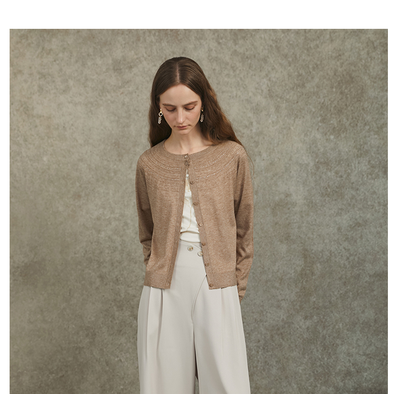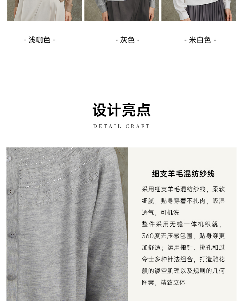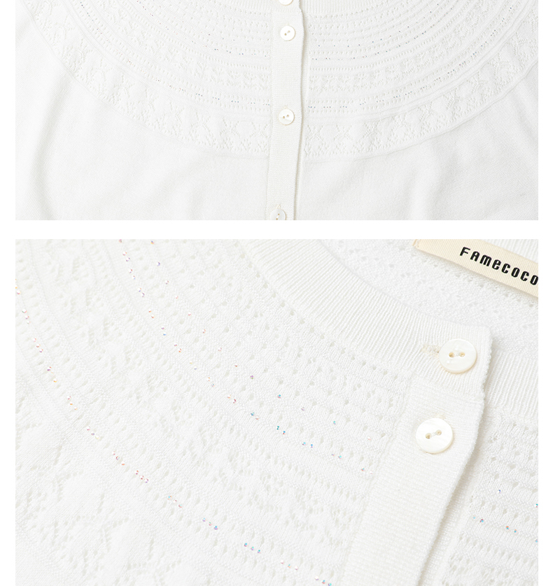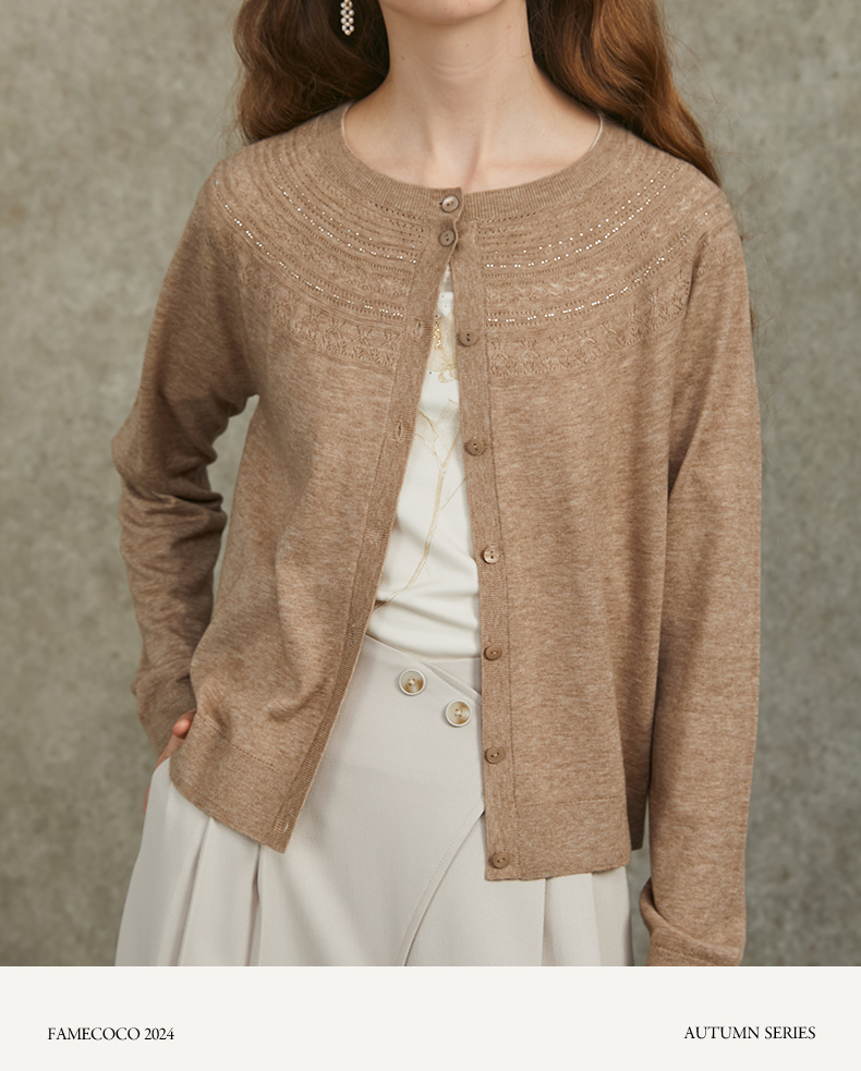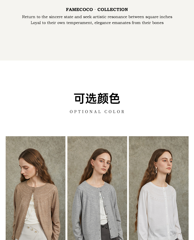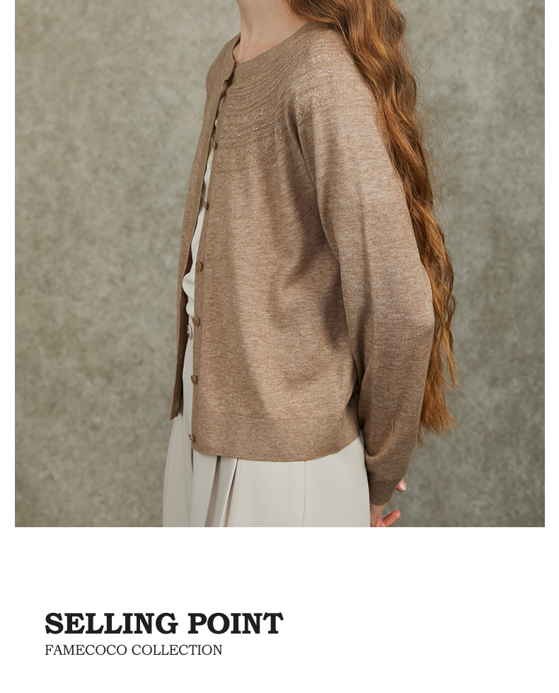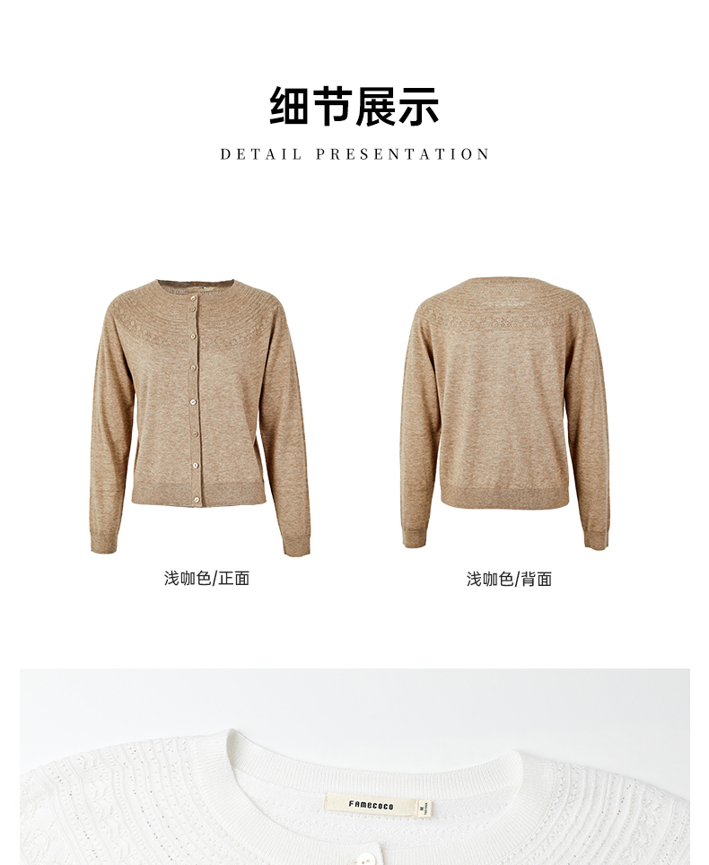 Famecoco范可儿圆领针织开衫设计感镂空雕花羊毛外套FAC6DE005