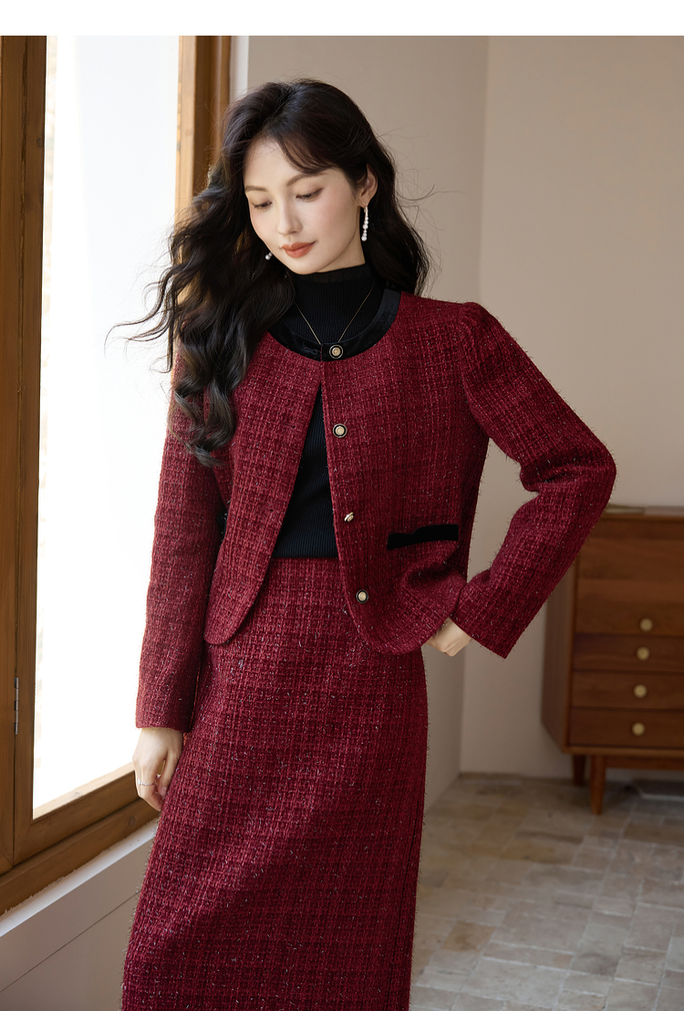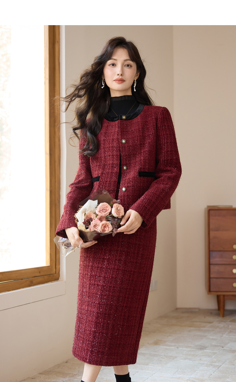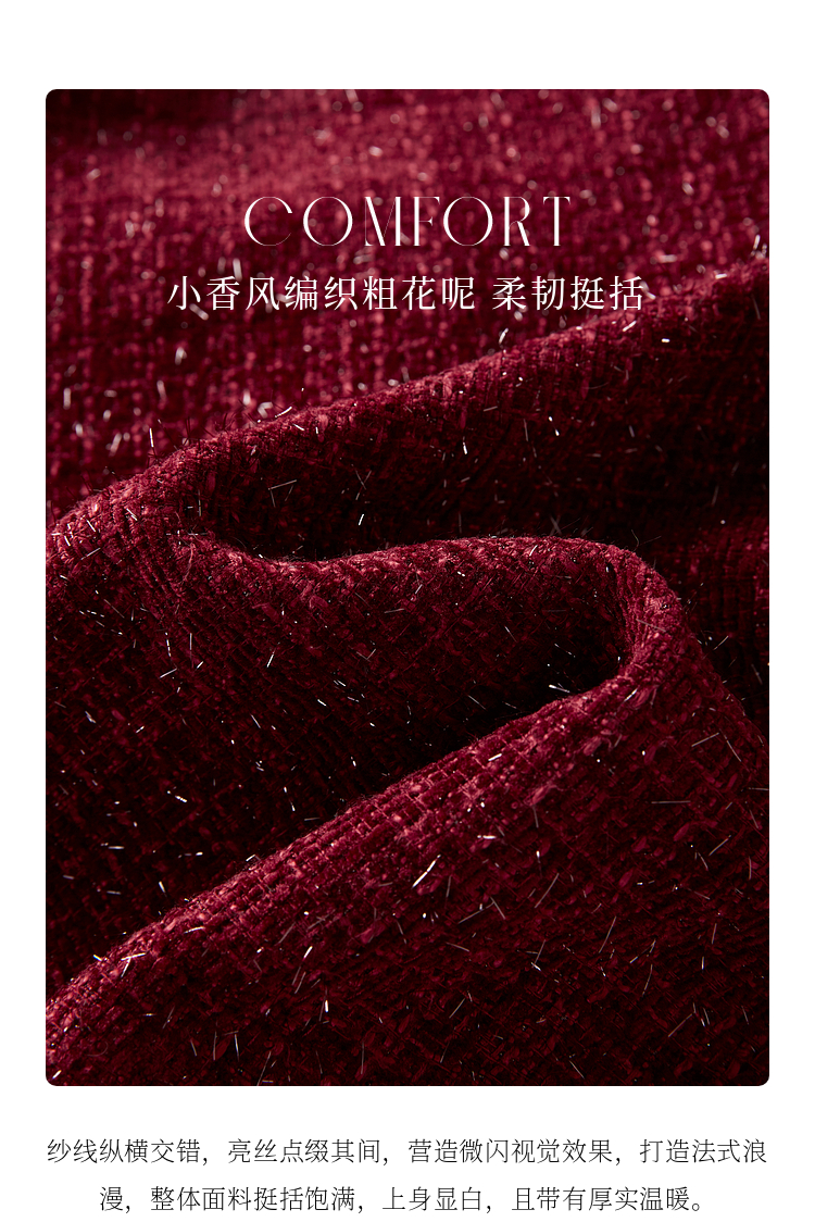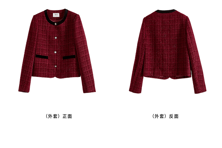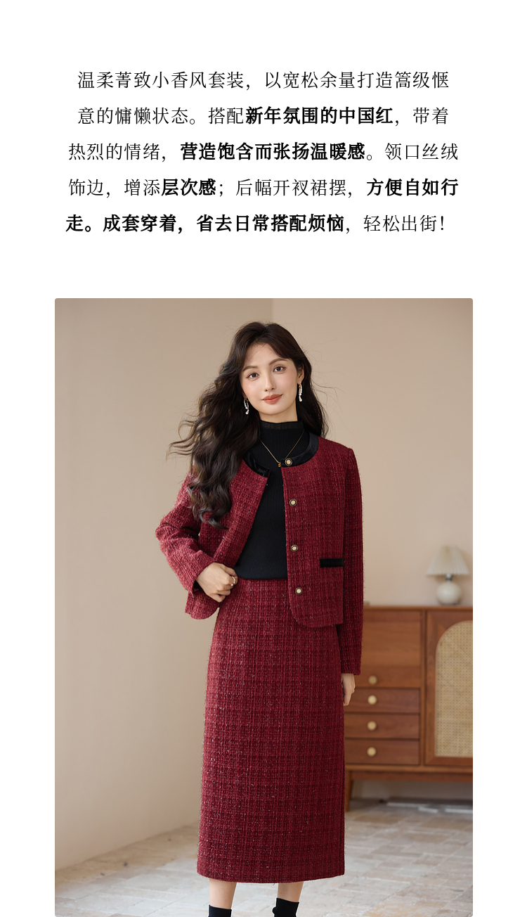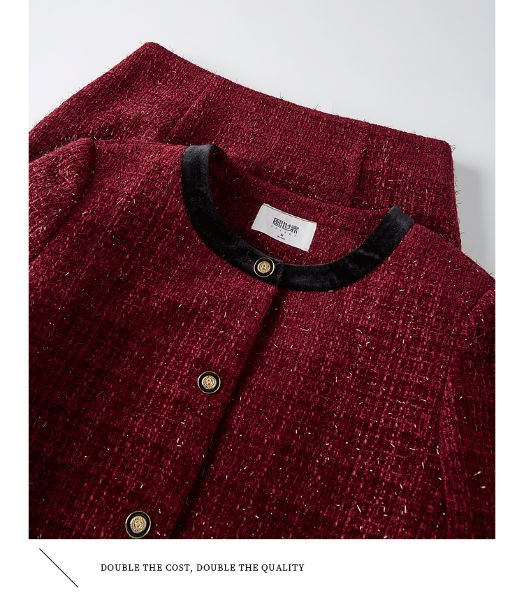【专属特惠】熙世界红色小香风套装女秋冬季名媛气质粗花呢短外套半身裙两件套