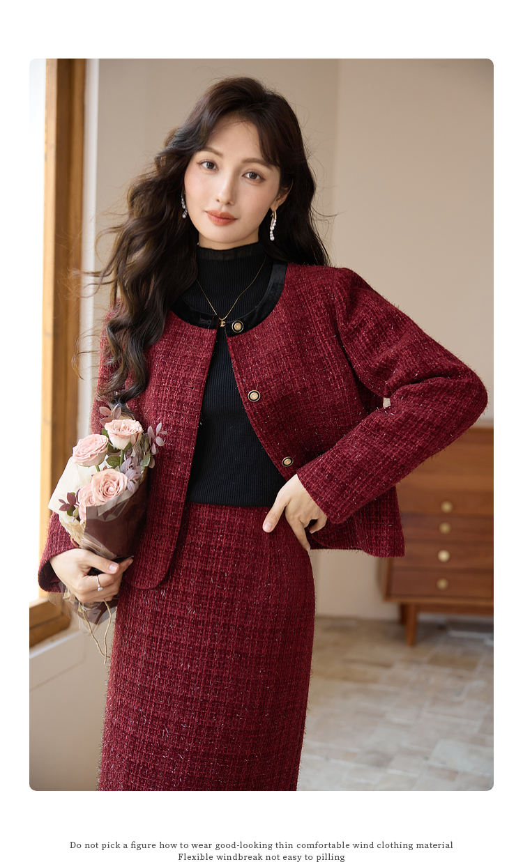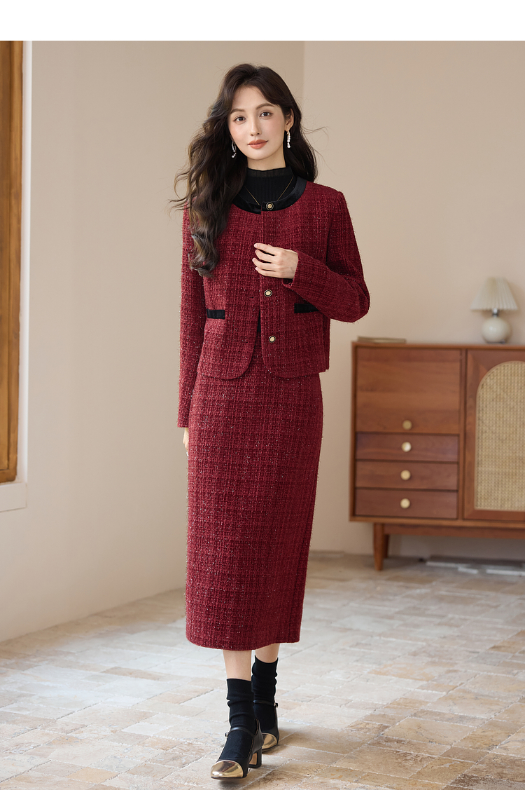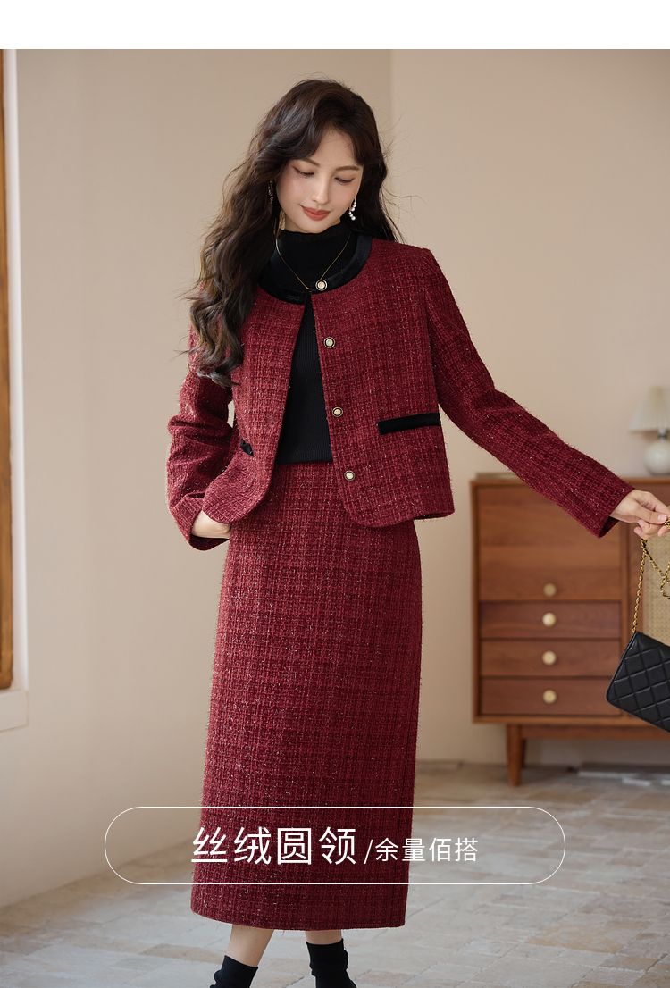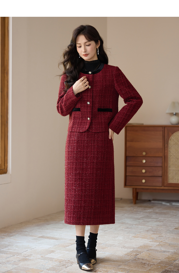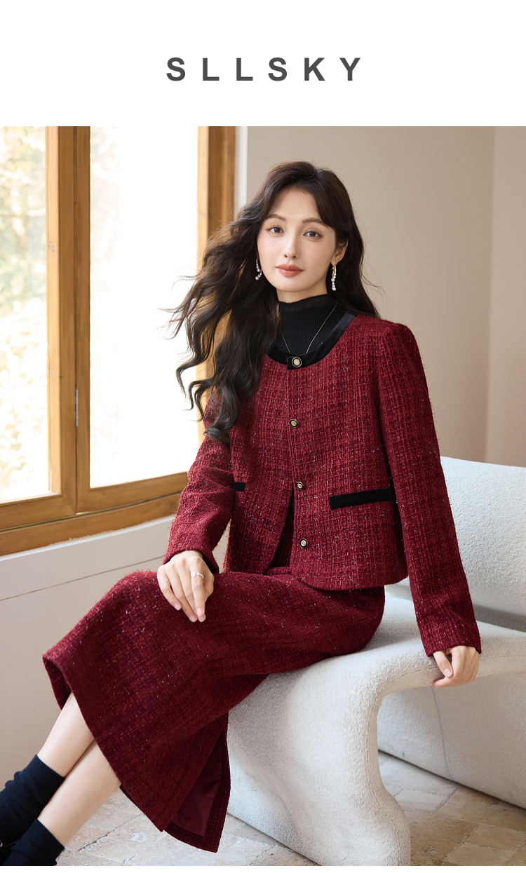 【专属特惠】熙世界红色小香风套装女秋冬季名媛气质粗花呢短外套半身裙两件套