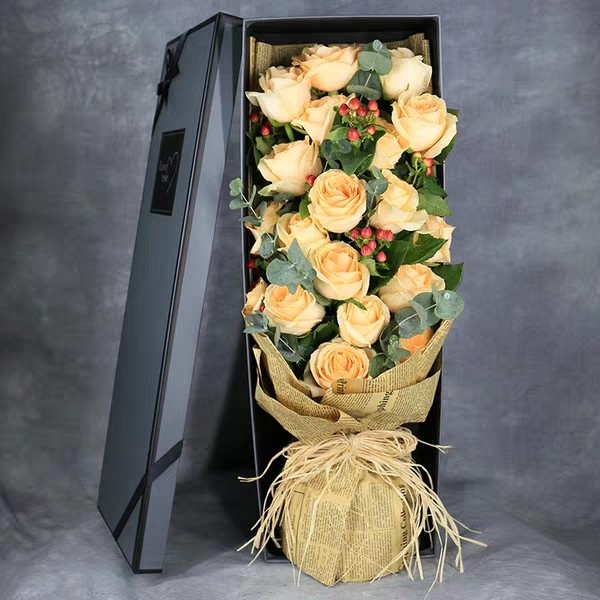 花材:19支香槟玫瑰,尤加利,红豆,栀子叶,60cm精美礼盒