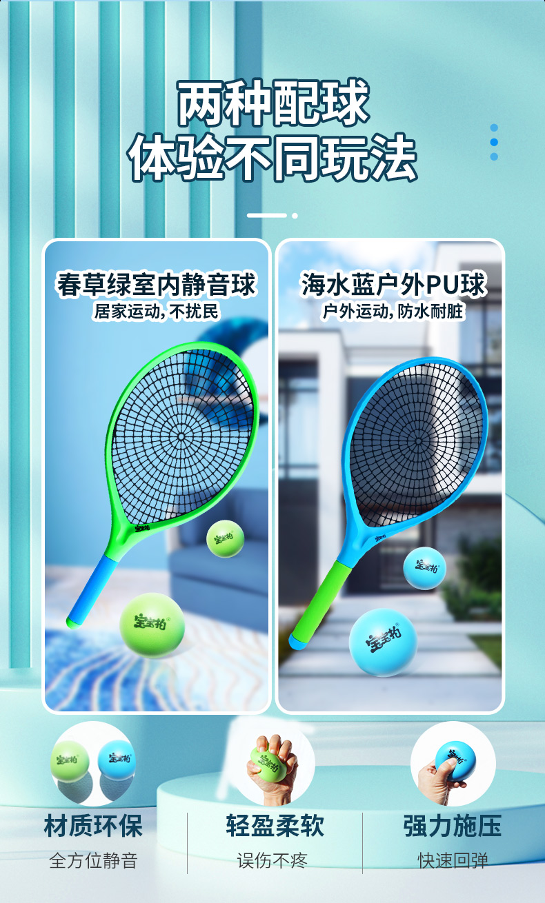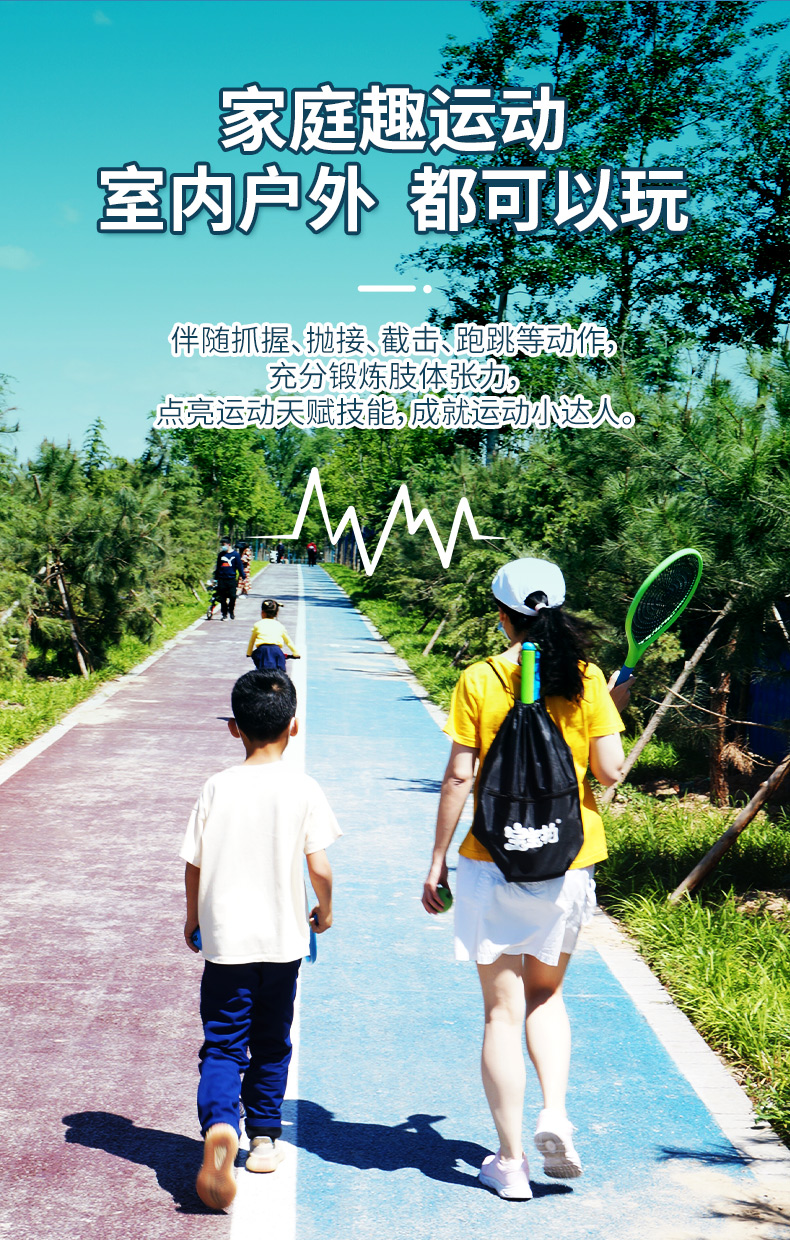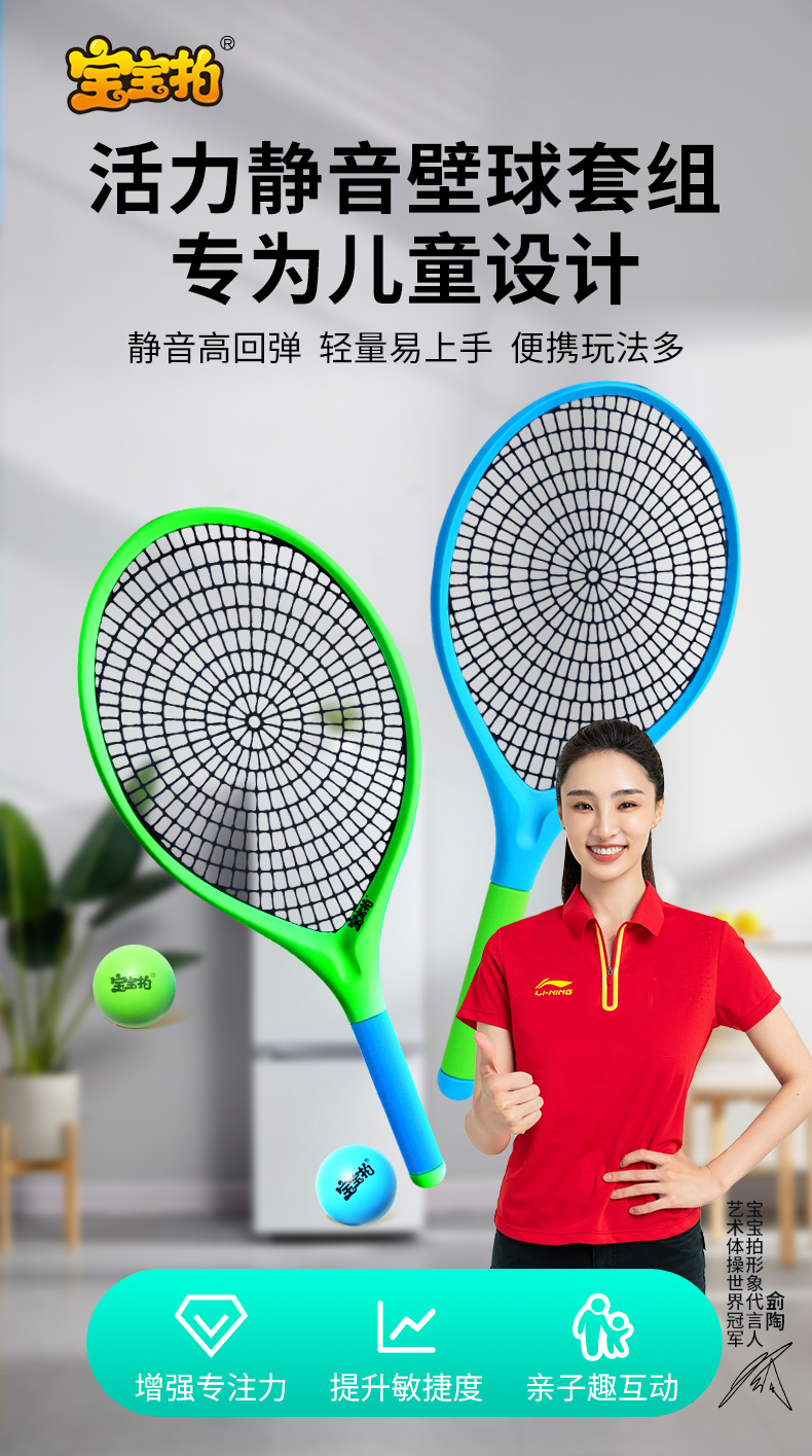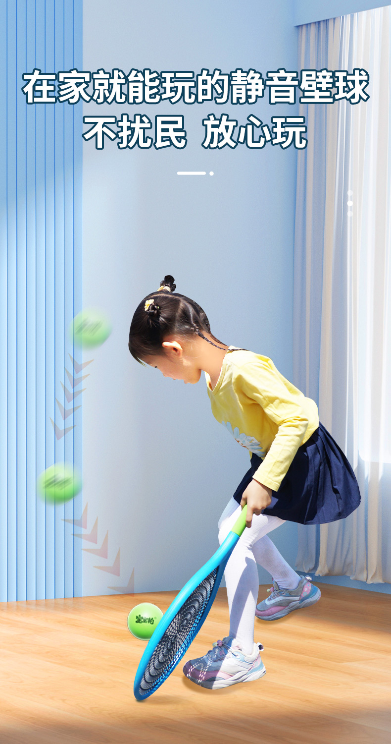 宝宝拍活力静音壁球套装,世界冠军侴陶代言,专为儿童设计,蛛网大拍,超级品质,室内静音、户外耐磨,轻便玩法多