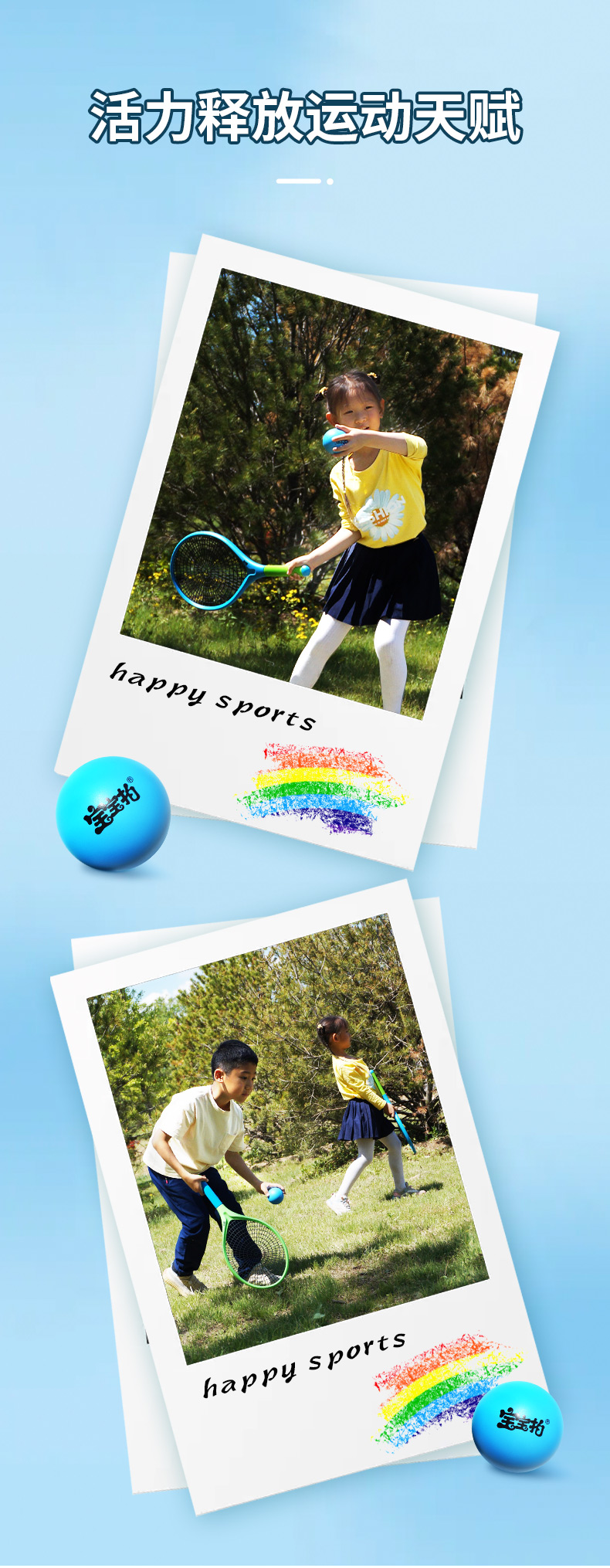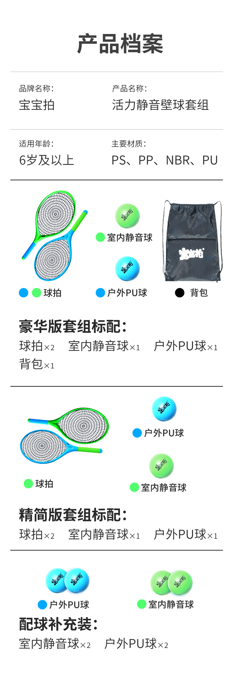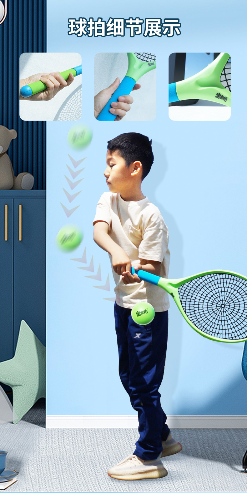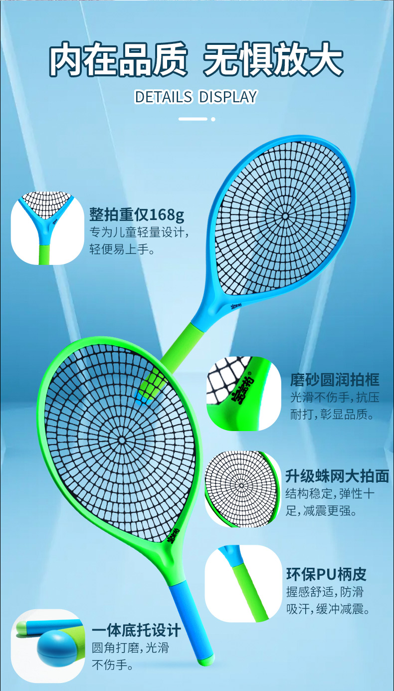 宝宝拍活力静音壁球套装,世界冠军侴陶代言,专为儿童设计,蛛网大拍,超级品质,室内静音、户外耐磨,轻便玩法多