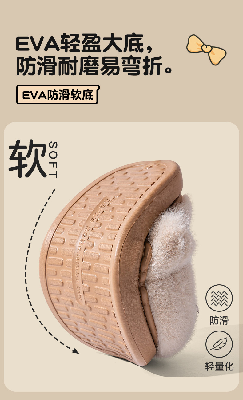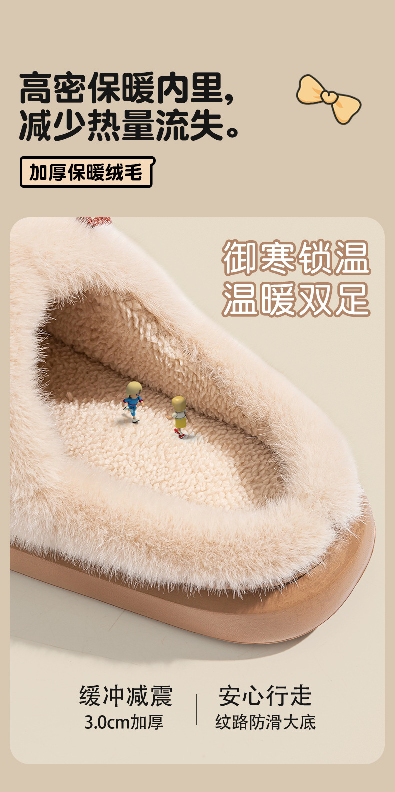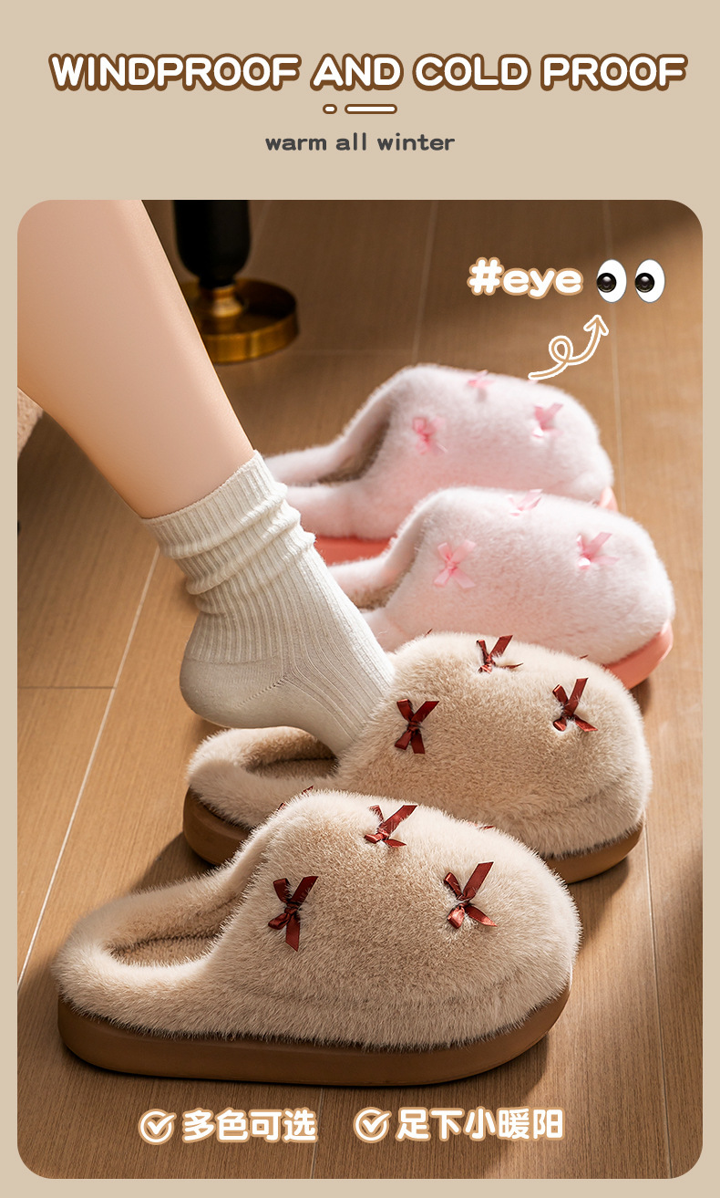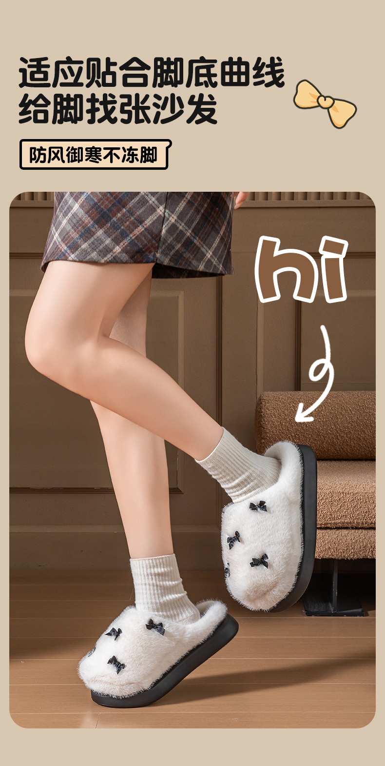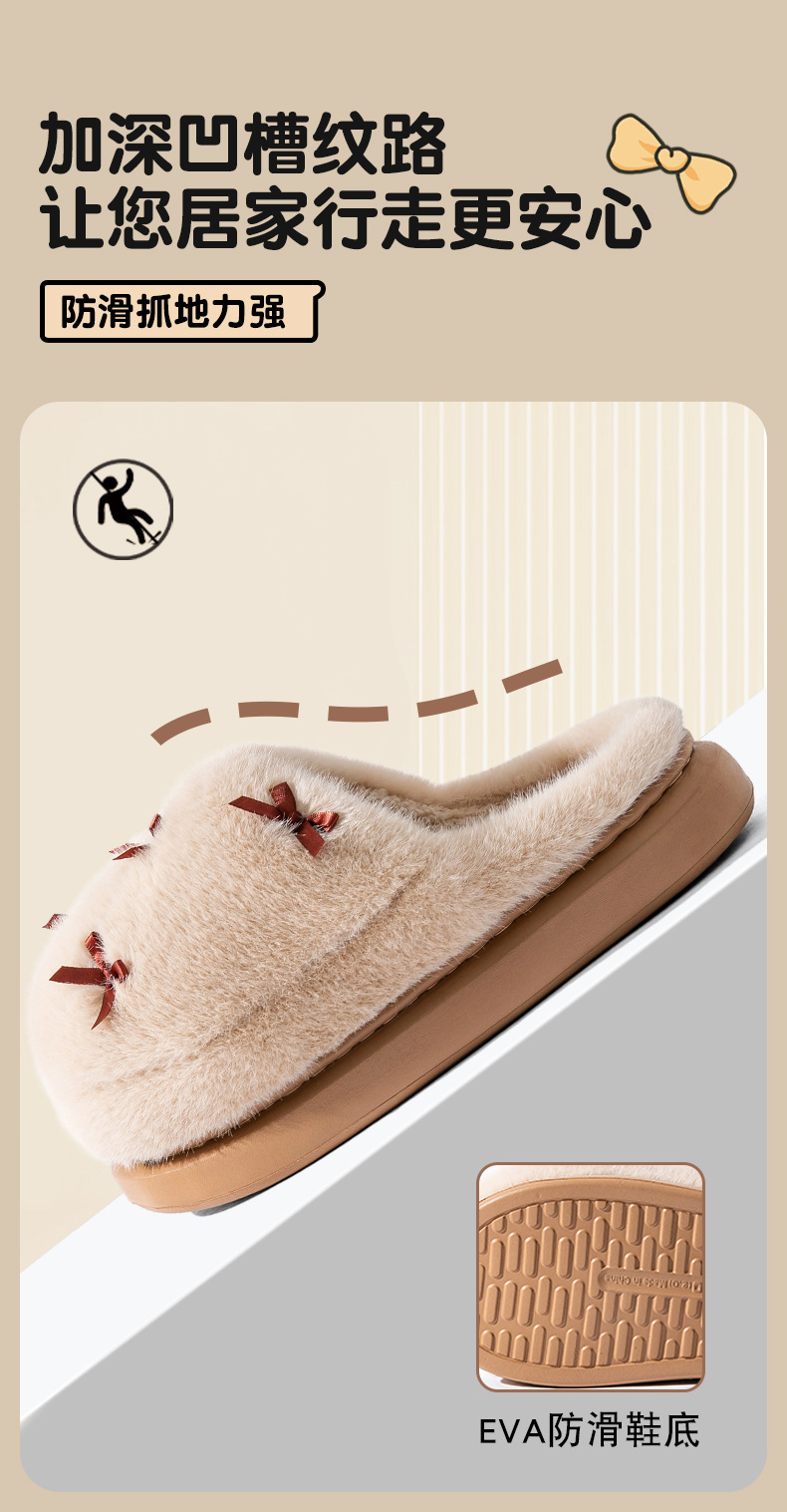 敲保暖【加厚保暖绒毛!御寒锁温】可爱淑女蝴蝶结,厚底棉拖鞋女士家居室内秋冬季新款防滑保暖防滑毛毛绒棉拖女。rc