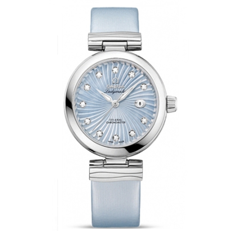 镜面材质 | 蓝宝石水晶玻璃 | 表盘 | 精钢表壳 浅蓝色饰有太阳射线光芒图案表盘 镶钻时标 日期显示 透底 |