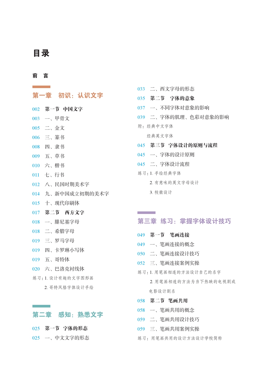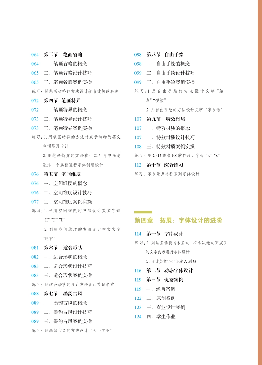 本书针对应用型艺术设计专业编写,以学习者为中心,强调实践与理论并行,注重字体设计的基础性作用,以实际教学和实践应用为旨归,通过大量具体的、详细的案例,分步骤讲解字体设计的方法,让学生实实在在地学会,并能在实践中深化理论认知。