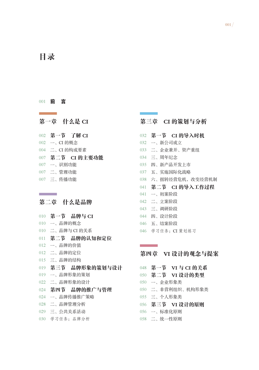 二是熟悉 CI 的导入时机与工作过程,通过一系列案例的详细解析,使学习者对 CI 的策划有一个基本的了解。虽然对于艺术设计专业的学生来讲,在实践中较少涉及 CI 的策划,但此部分指引着整个 CI 系统的建立,更是 VI 设计的基础。