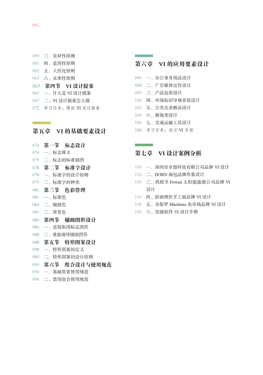 三是艺术设计专业需重点掌握的 VI 的设计与表达环节,通过观念与提案、基础要素和应用要素的学习,帮助学习者快速建立企业标志及应用要素的设计概念,并通过大量案例拓宽学习者的视野。