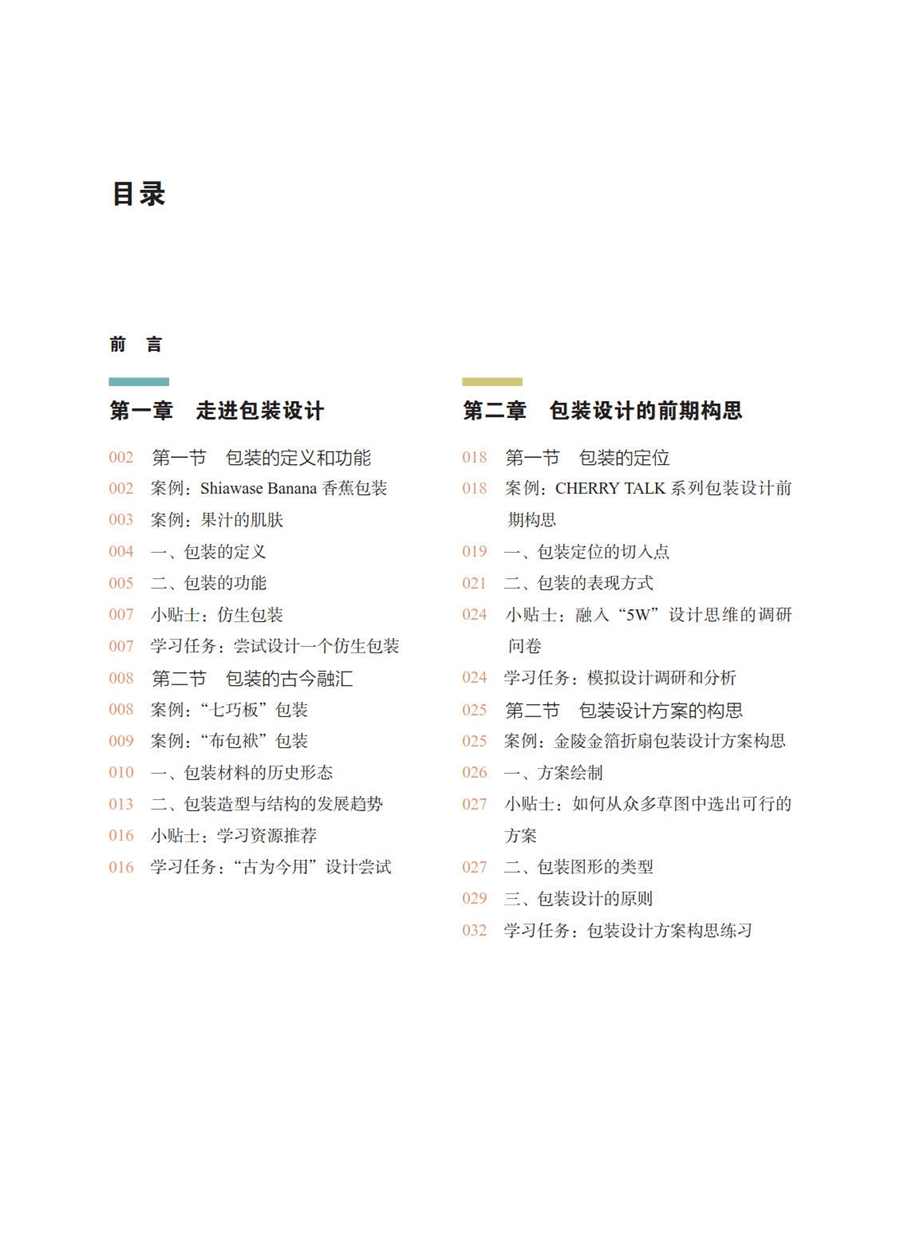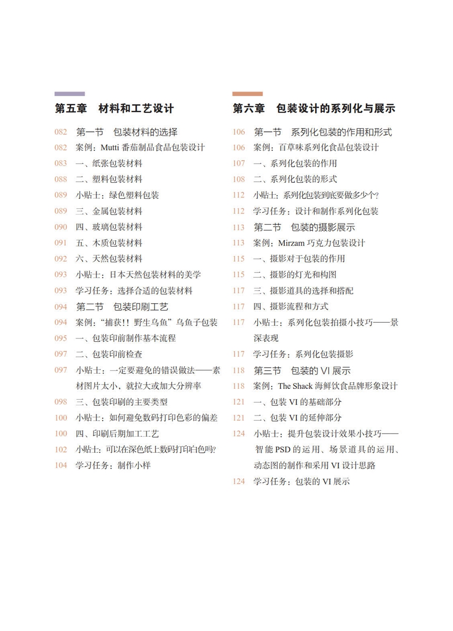 在第一章了解了包装的定义、古今形态等基本知识之后,第二章中,通过包装设计的定位、方案构思和表现形式的学习,你会了解如何设计出草图方案。在确定草图方案后,第三章详细讲解了包装的视觉元素设计,包括文字、图形、色彩和编排设计。第四章通过具体的图例解析和实践练习,使初学者也可以快速了解纸盒包装的设计要点,并能够对纸盒进行改良和创新。在前四章的基础上,第五章简要介绍了包装的材料和印刷工艺。跟随着章节流程设计和制作,系列化包装设计也就完成了。第六章特别融入了包装摄影和VI 展示的内容,这些内容会帮助初学者出色地呈现包装设计的最终效果。