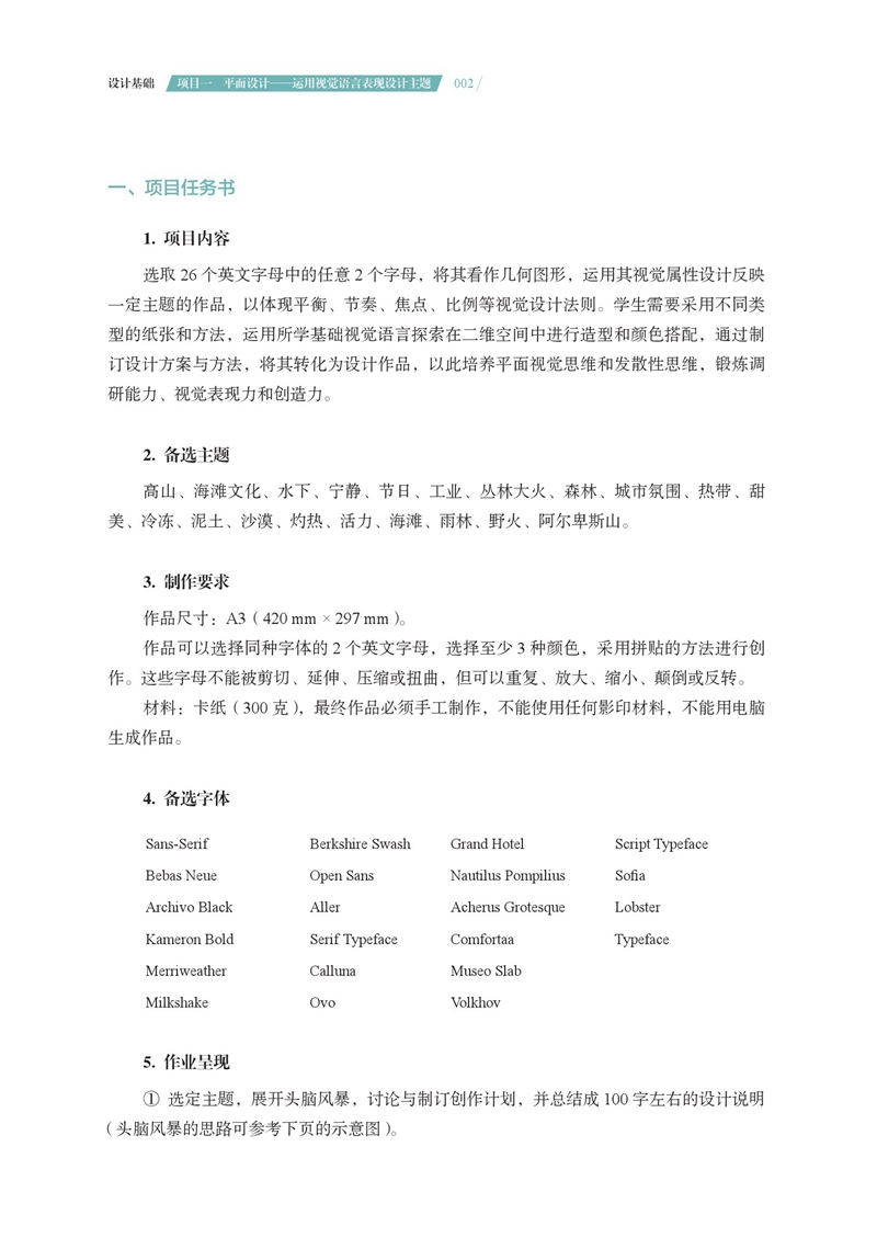 项目任务书 在进行具体设计实践之前,明确任务的内容与要求,以确保课题的可实施性。任务书的主要内容包括项目内容、制作要求、作业呈现和评分标准等。